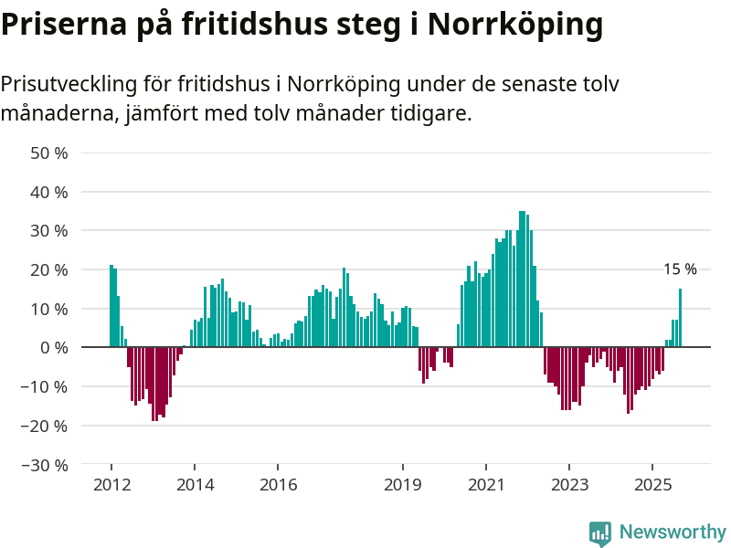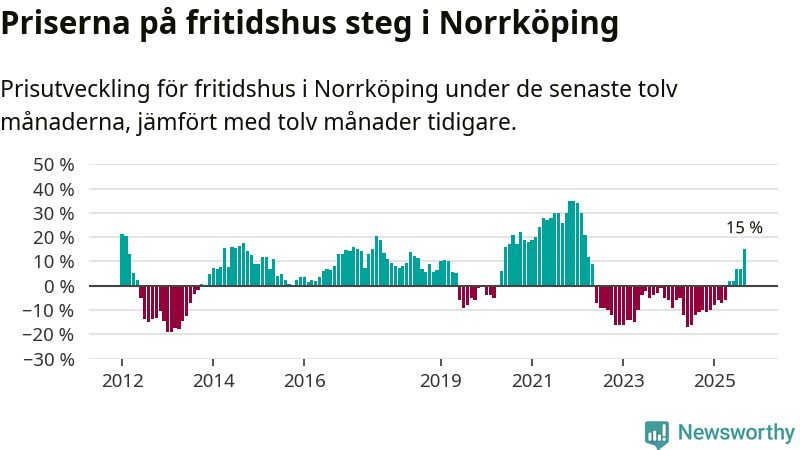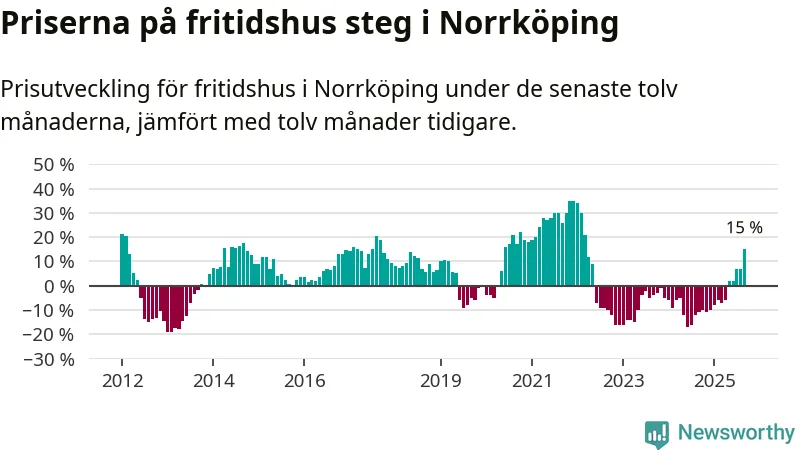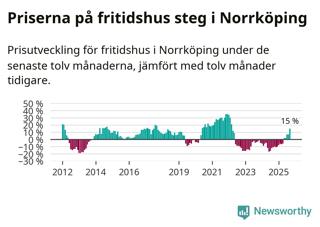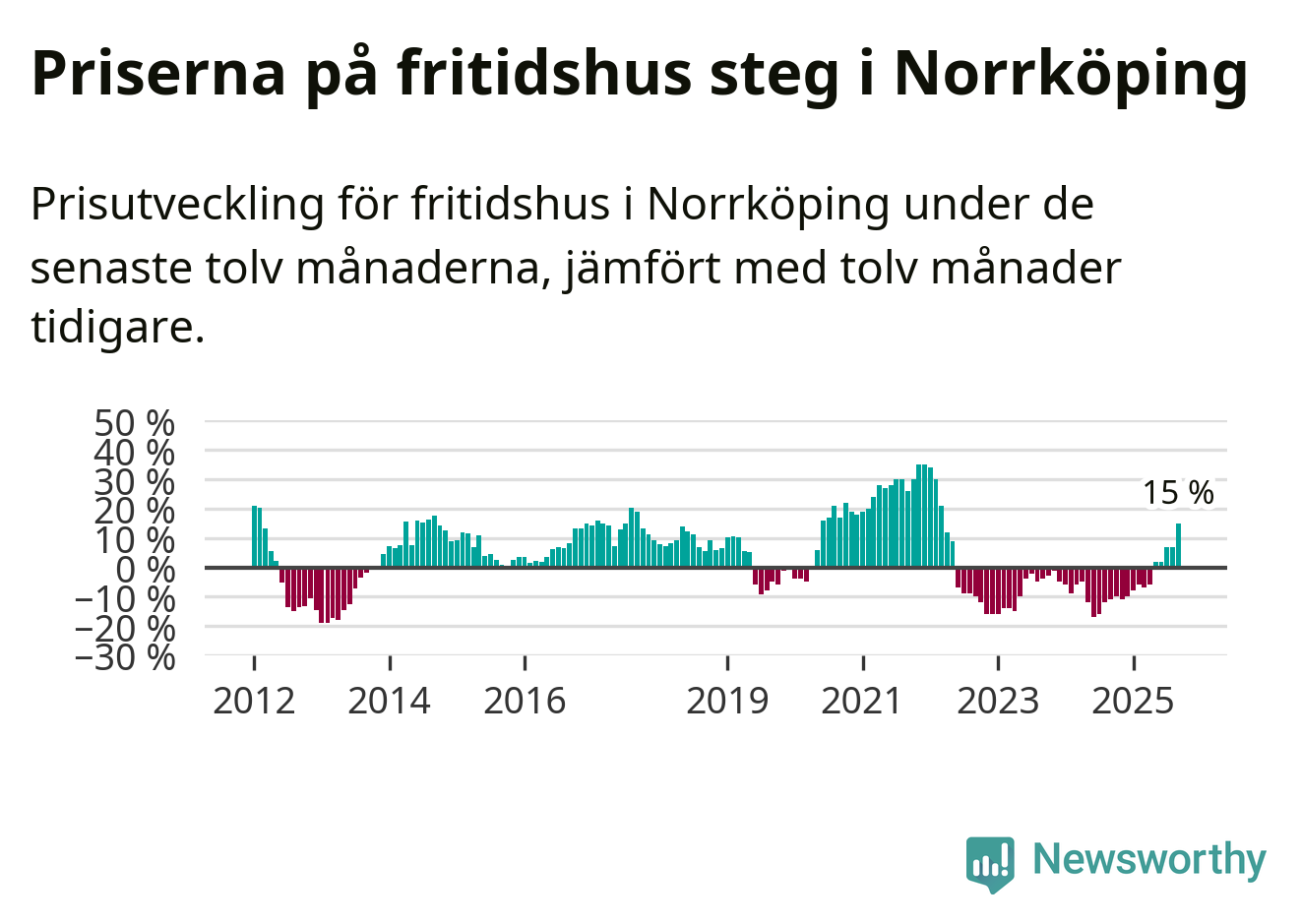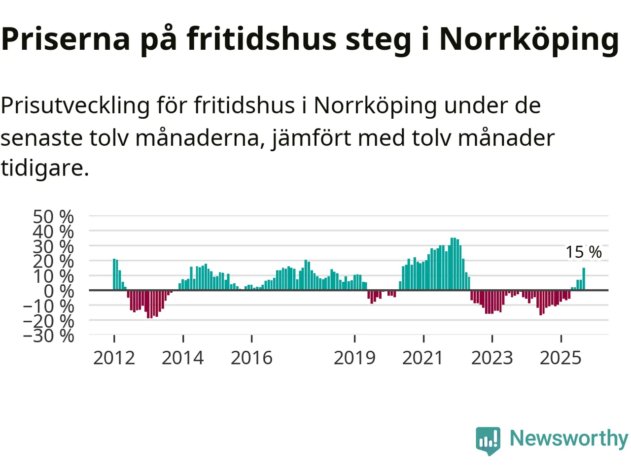 Priserna på fritidshus har gått upp i Norrköpings kommun. Medelpriset på försäljningarna under de senaste tolv månaderna visar på en uppgång med 15 procent.
