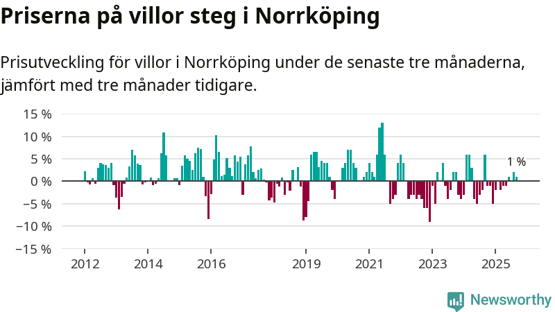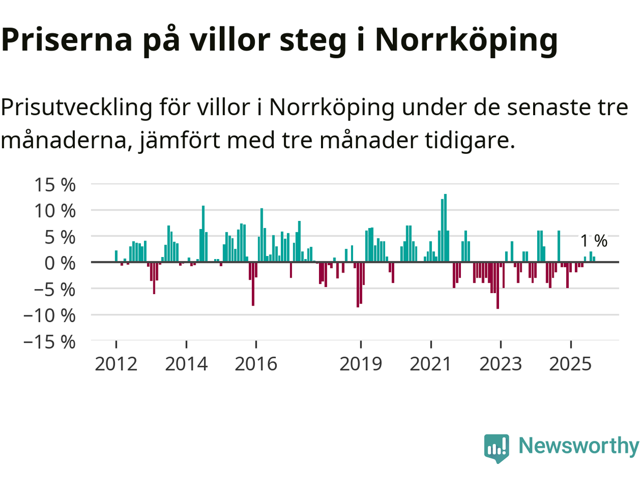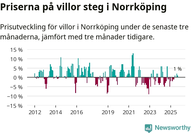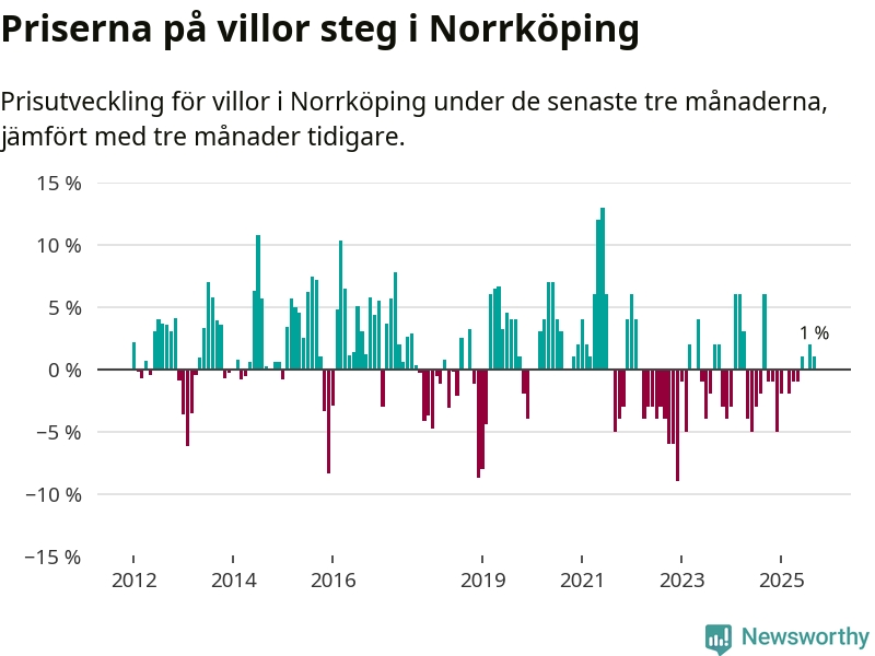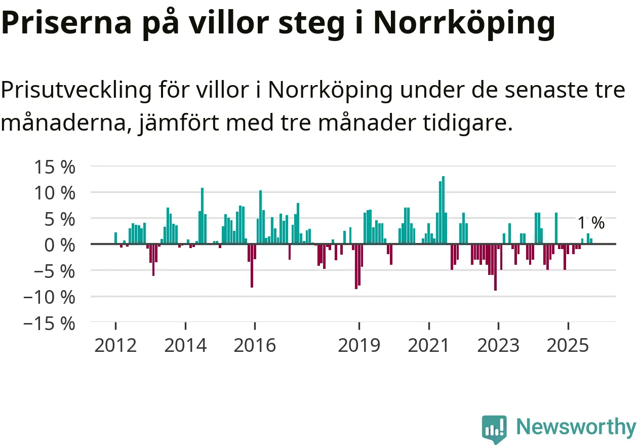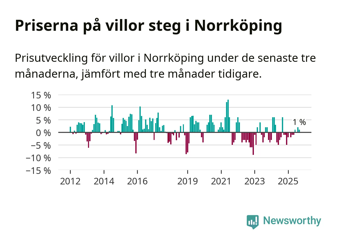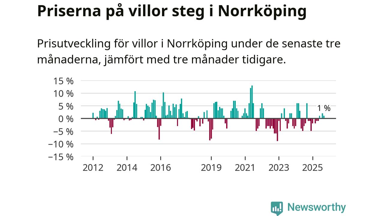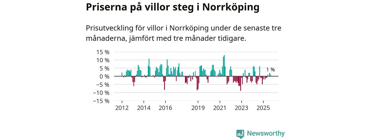 Villapriserna har gått upp i Norrköpings kommun. Medelpriset på försäljningarna under de senaste tre månaderna visar på en uppgång med 1 procent.