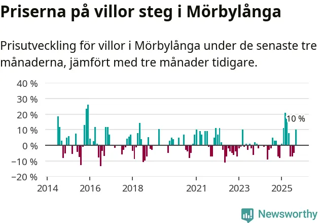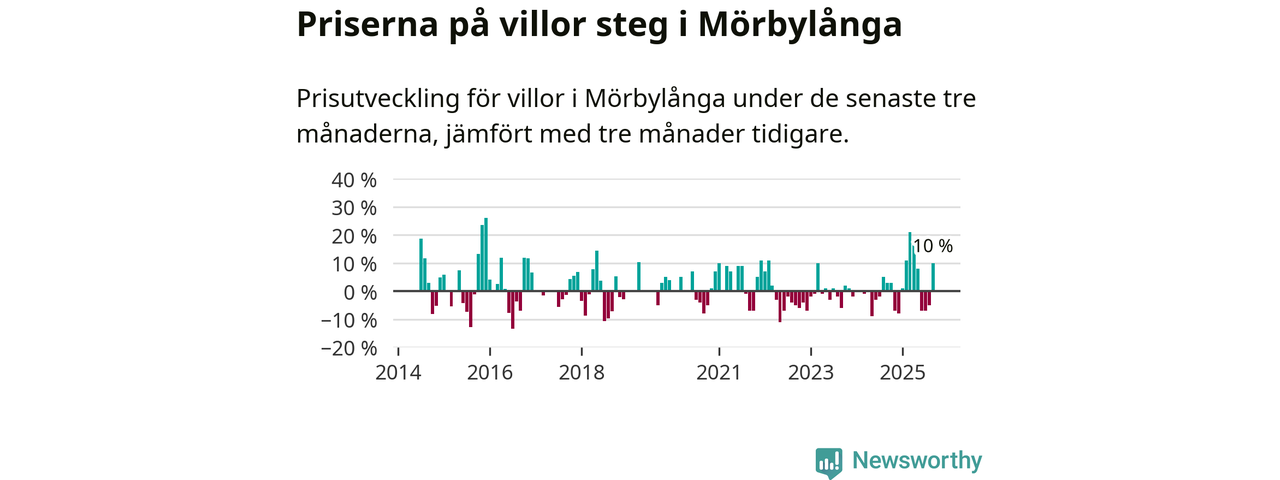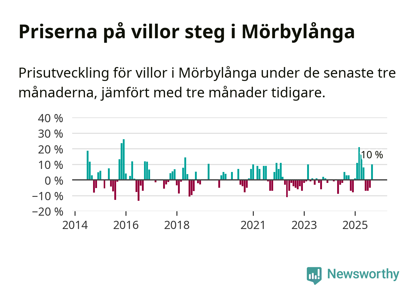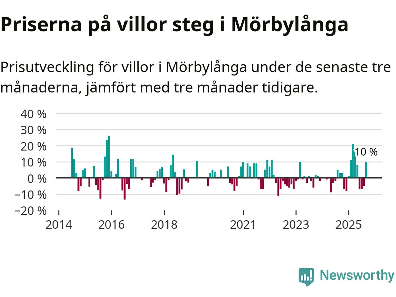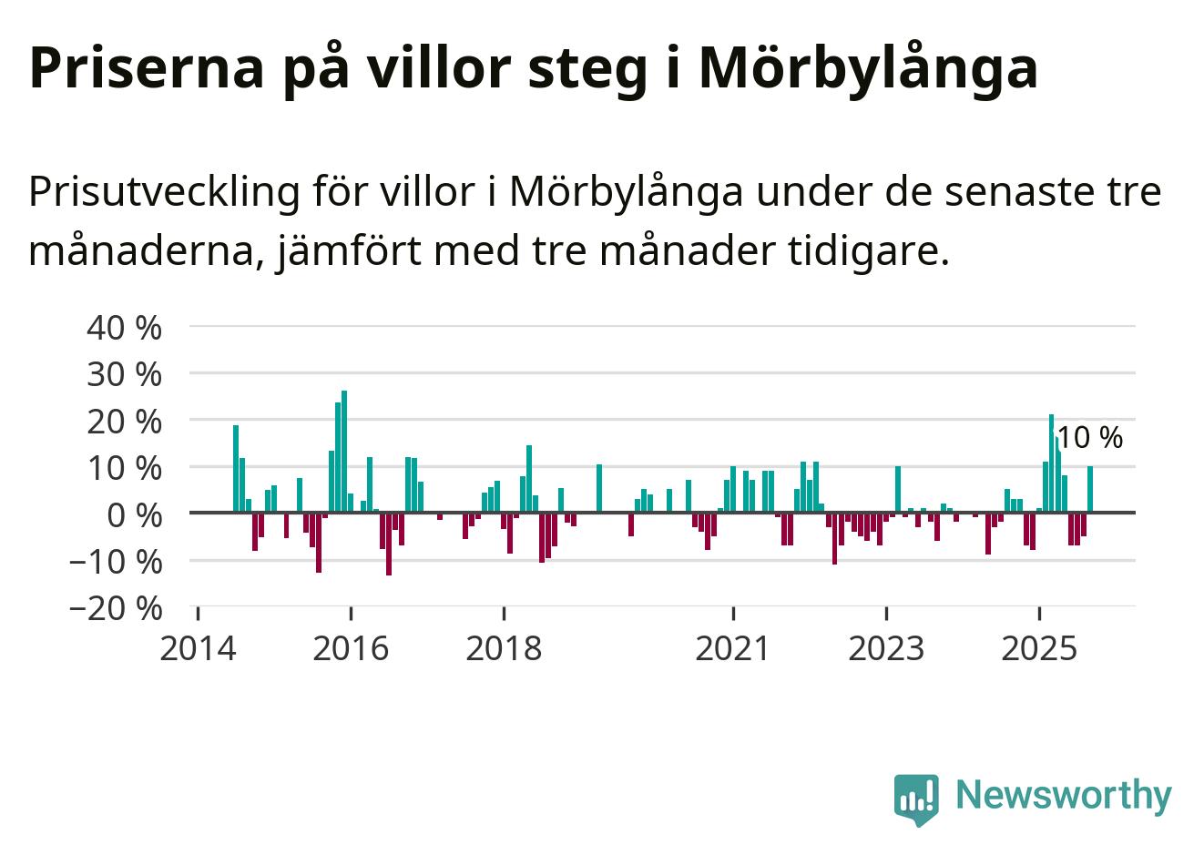 Villapriserna har gått upp i Mörbylånga kommun. Medelpriset på försäljningarna under de senaste tre månaderna visar på en uppgång med 10 procent.