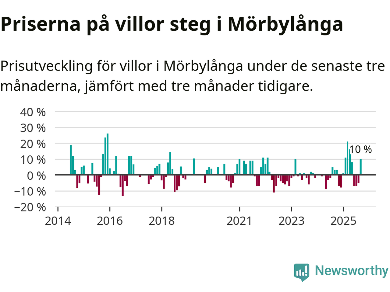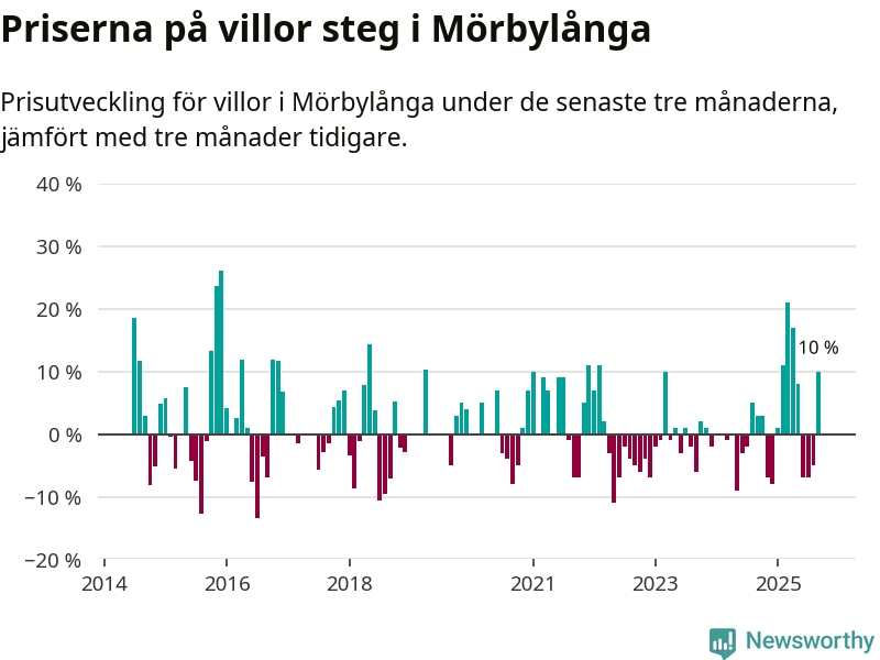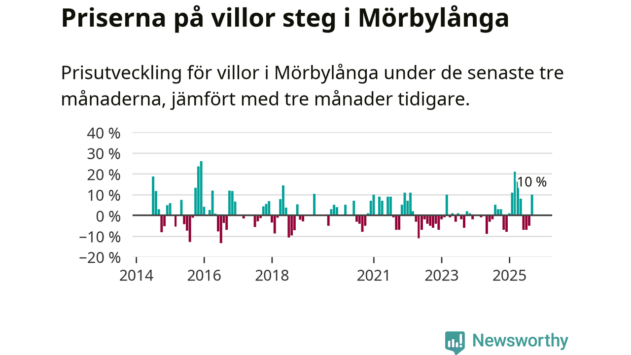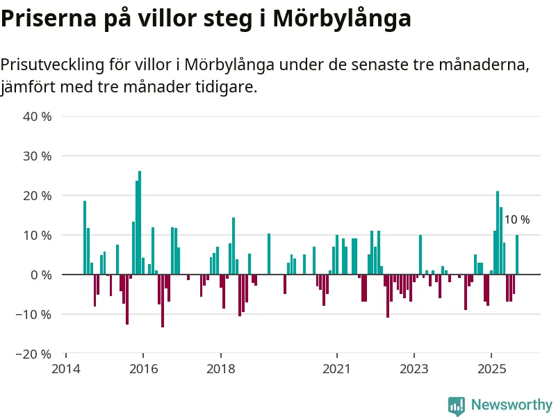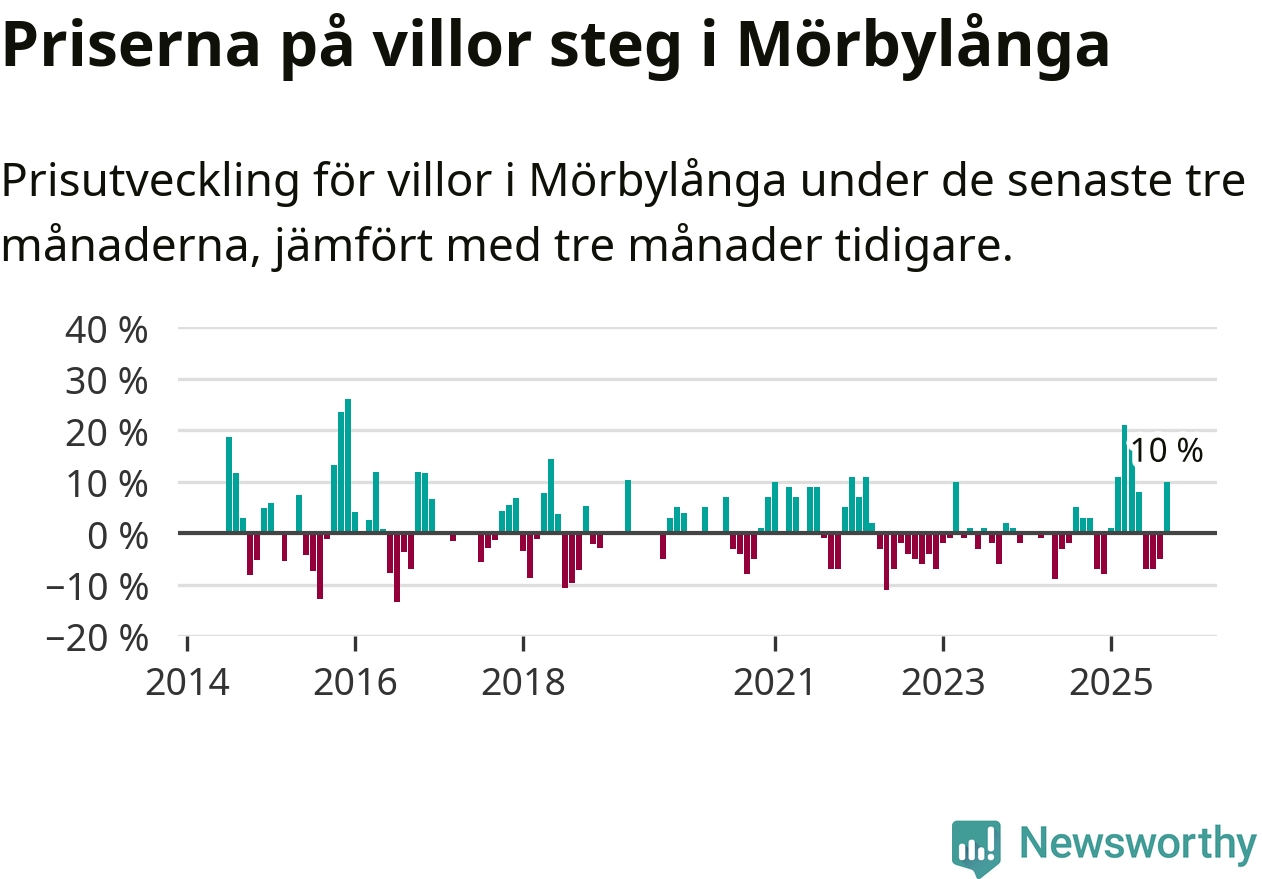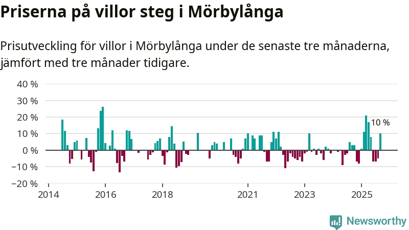 Villapriserna har gått upp i Mörbylånga kommun. Medelpriset på försäljningarna under de senaste tre månaderna visar på en uppgång med 10 procent.