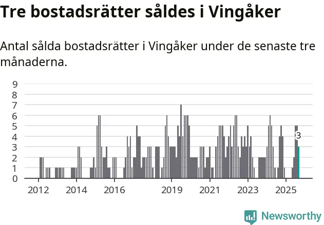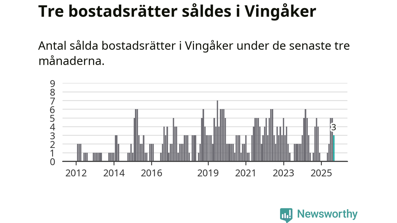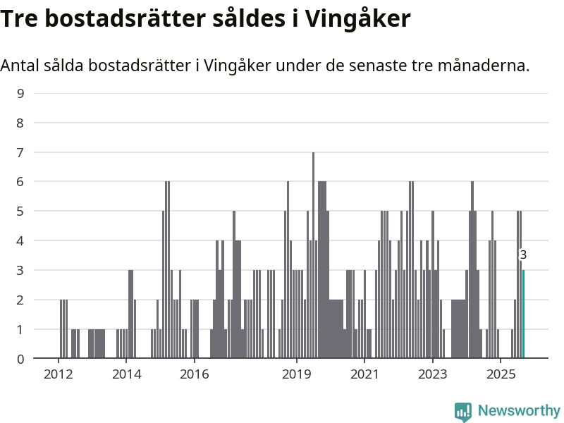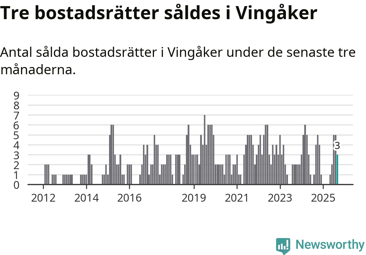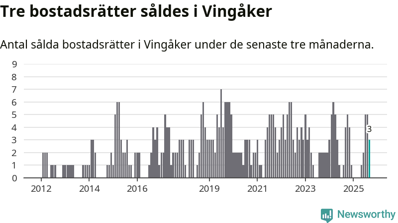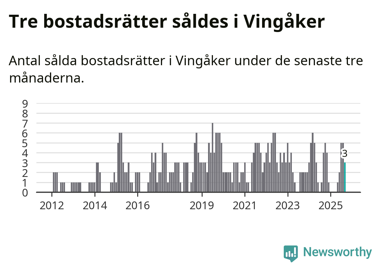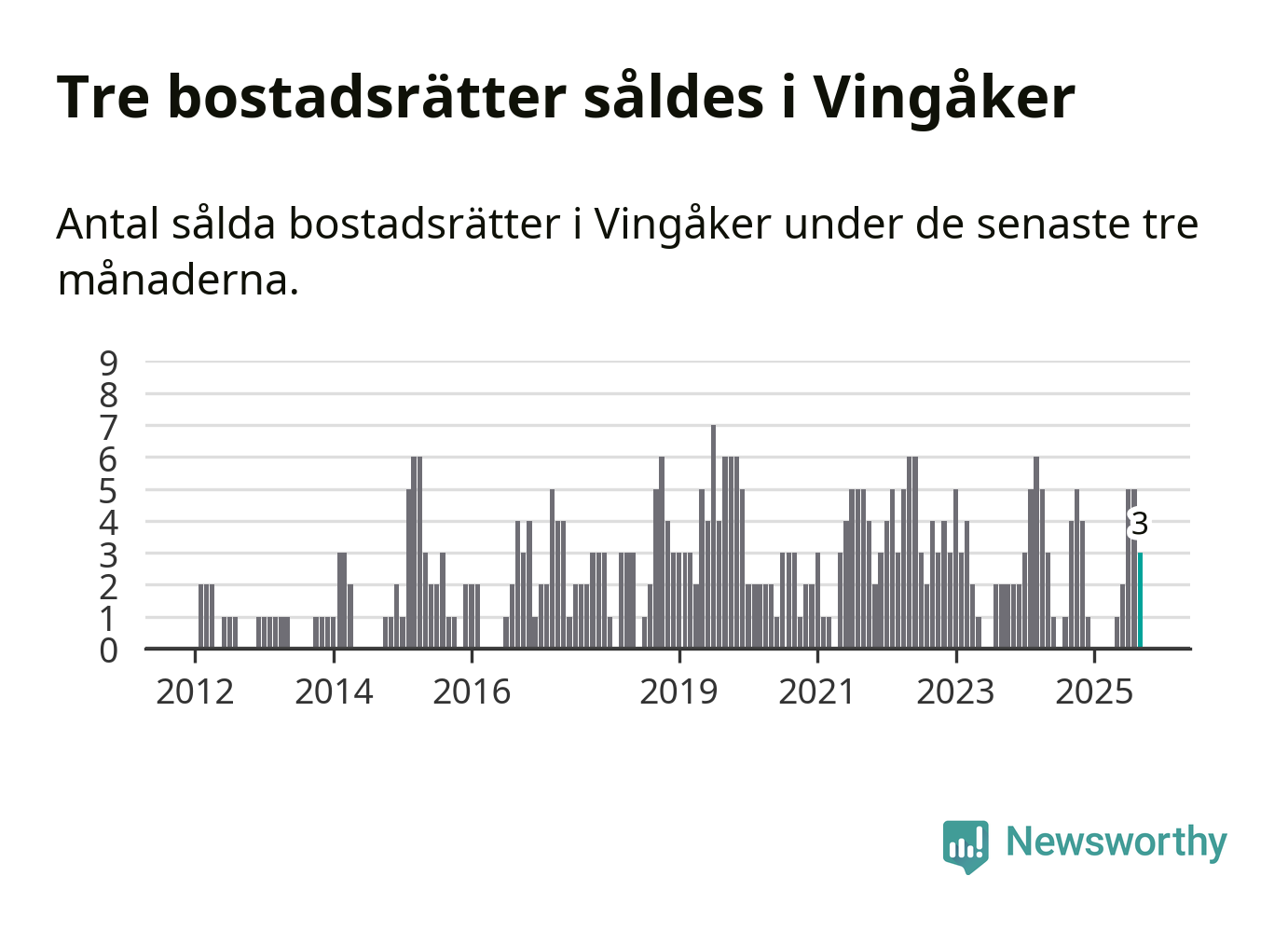 Mellan juli och september gjordes sammanlagt tre affärer med bostadsrätter i Vingåkers kommun. Det kan jämföras med fyra vid motsvarande tid i fjol.