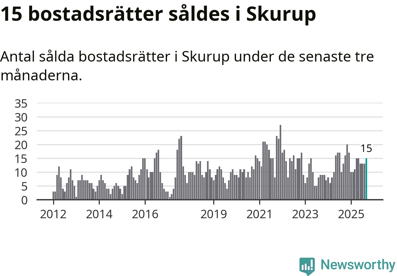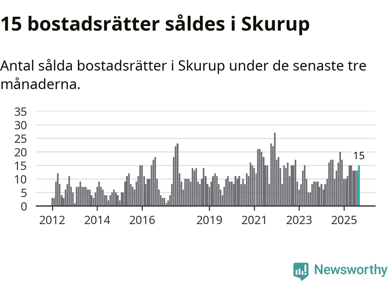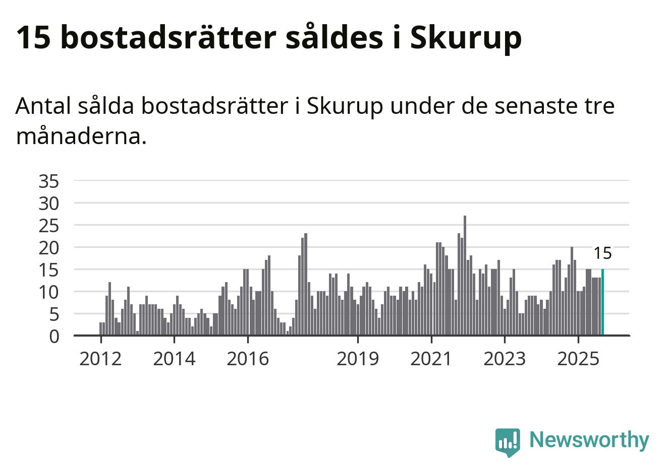 Mellan juli och september gjordes sammanlagt 15 affärer med bostadsrätter i Skurups kommun. Det kan jämföras med 13 vid motsvarande tid i fjol.