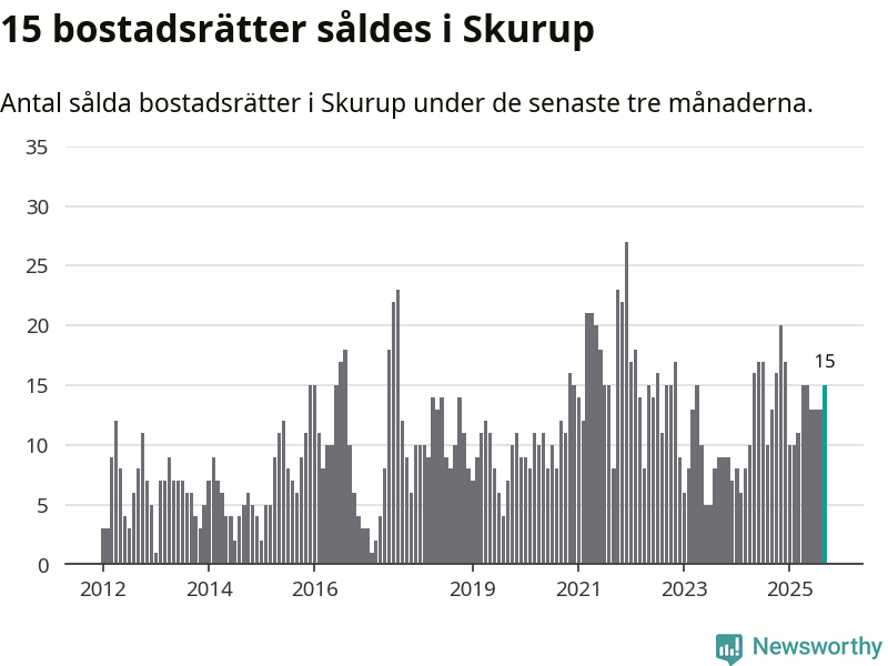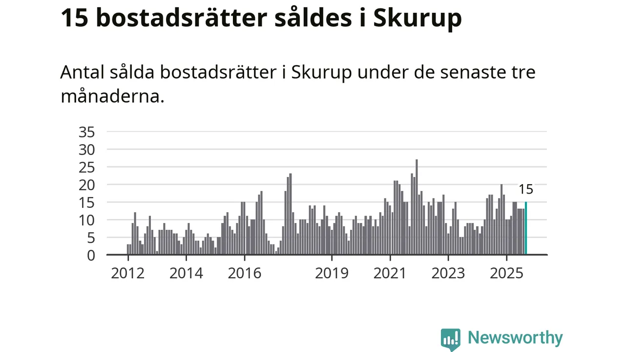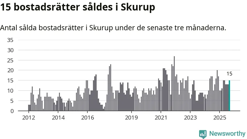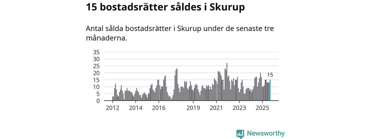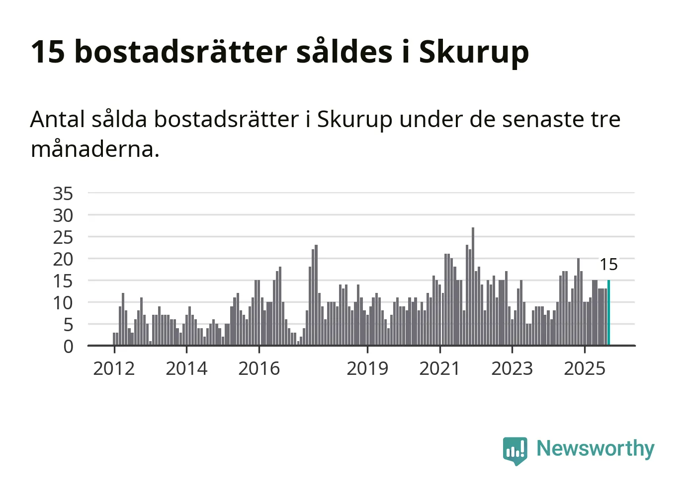Mellan juli och september gjordes sammanlagt 15 affärer med bostadsrätter i Skurups kommun. Det kan jämföras med 13 vid motsvarande tid i fjol.