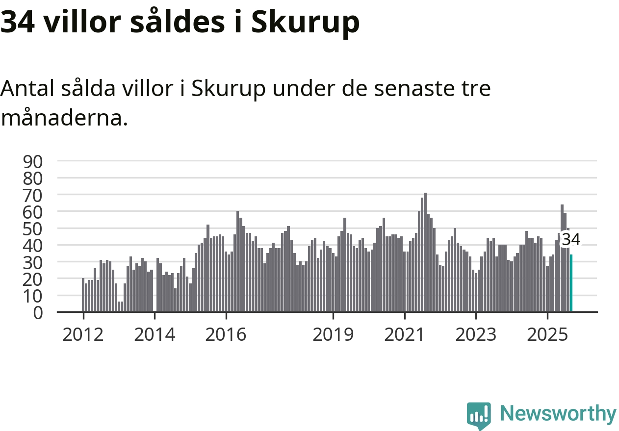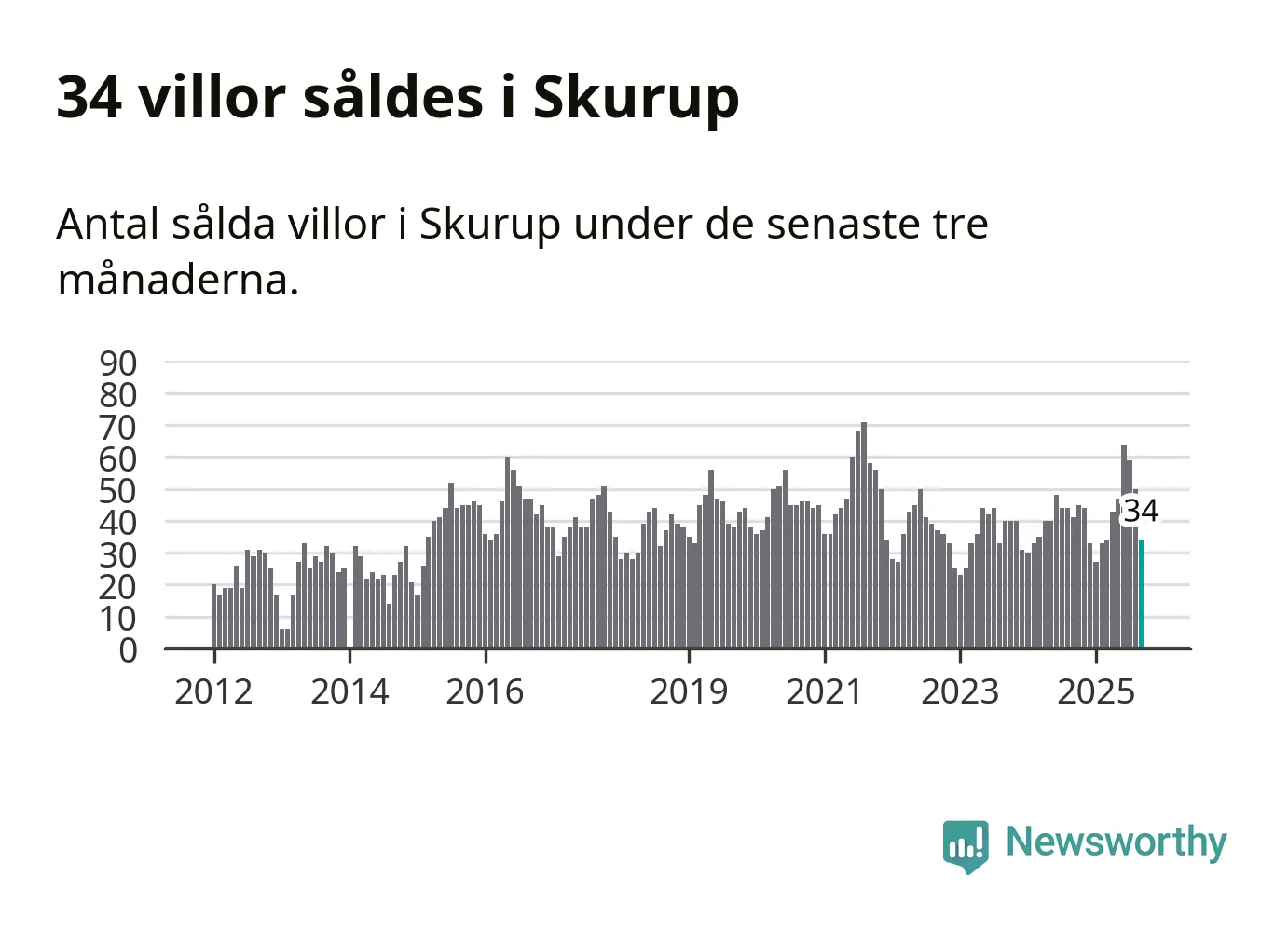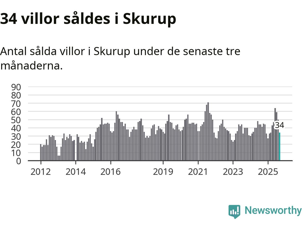 Mellan juli och september såldes 34 villor i Skurups kommun. Det är relativt få sett till aktiviteten på bostadsmarknaden i kommunen under de senaste tolv månaderna, samt det historiska snittet för den här tiden på året.