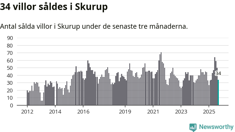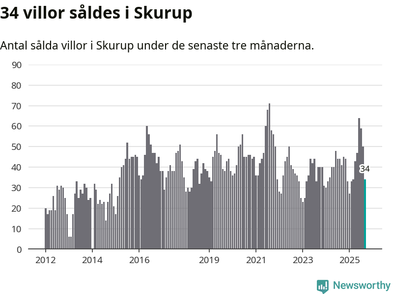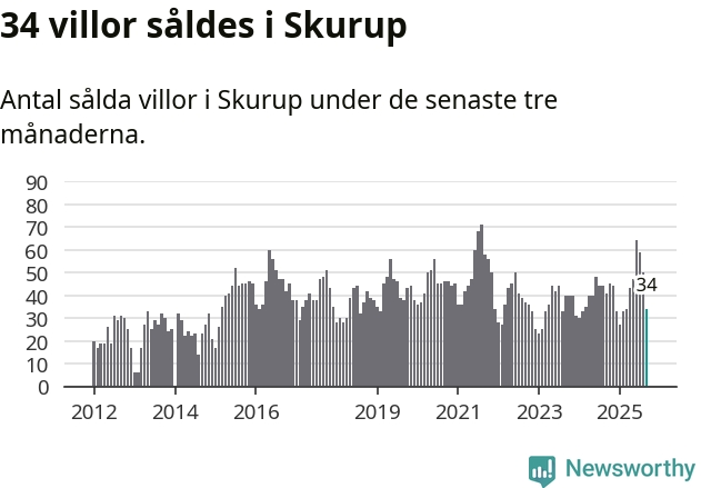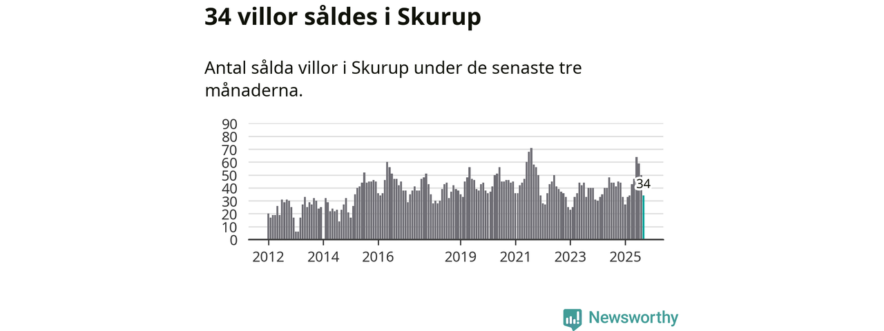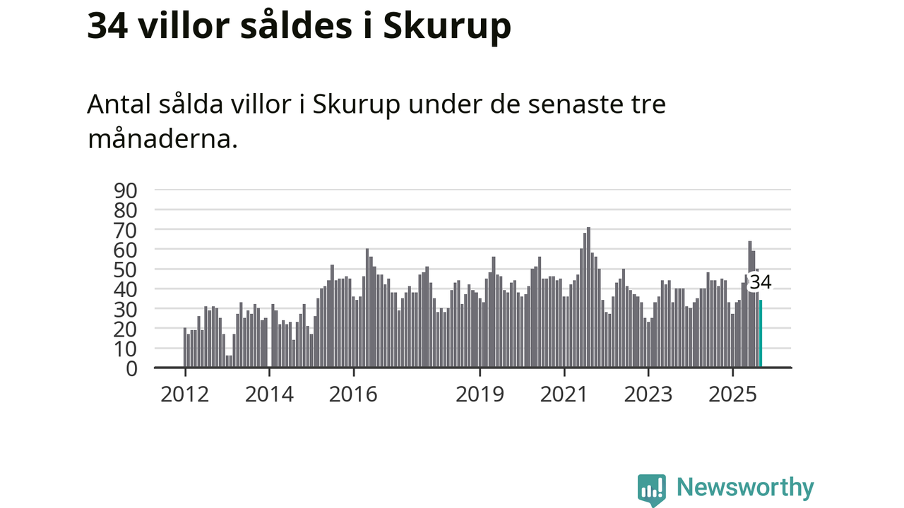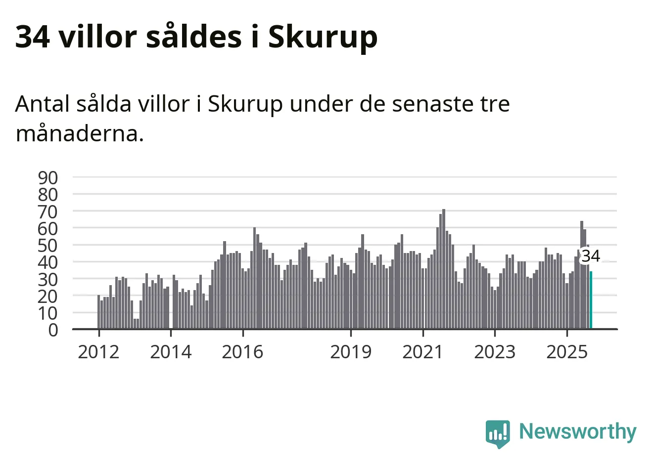 Mellan juli och september såldes 34 villor i Skurups kommun. Det är relativt få sett till aktiviteten på bostadsmarknaden i kommunen under de senaste tolv månaderna, samt det historiska snittet för den här tiden på året.