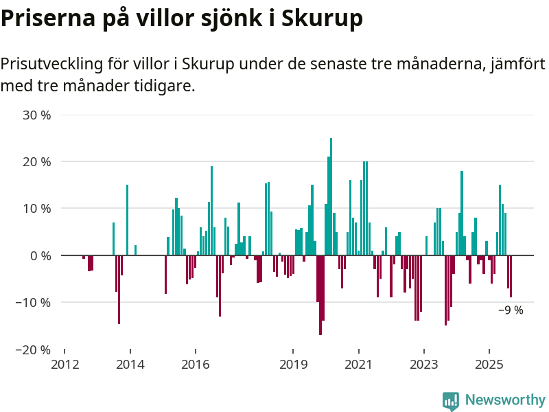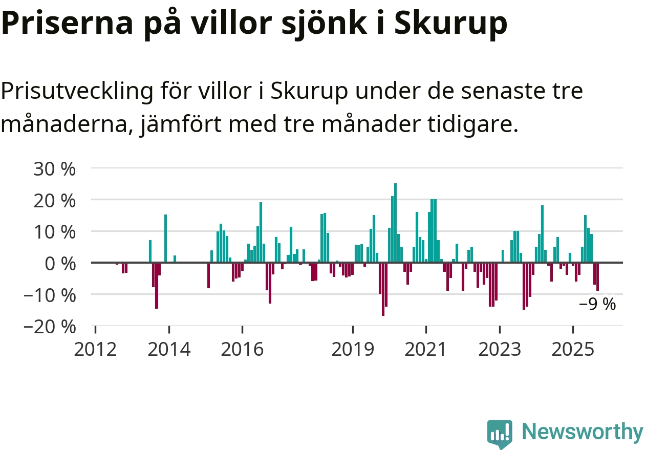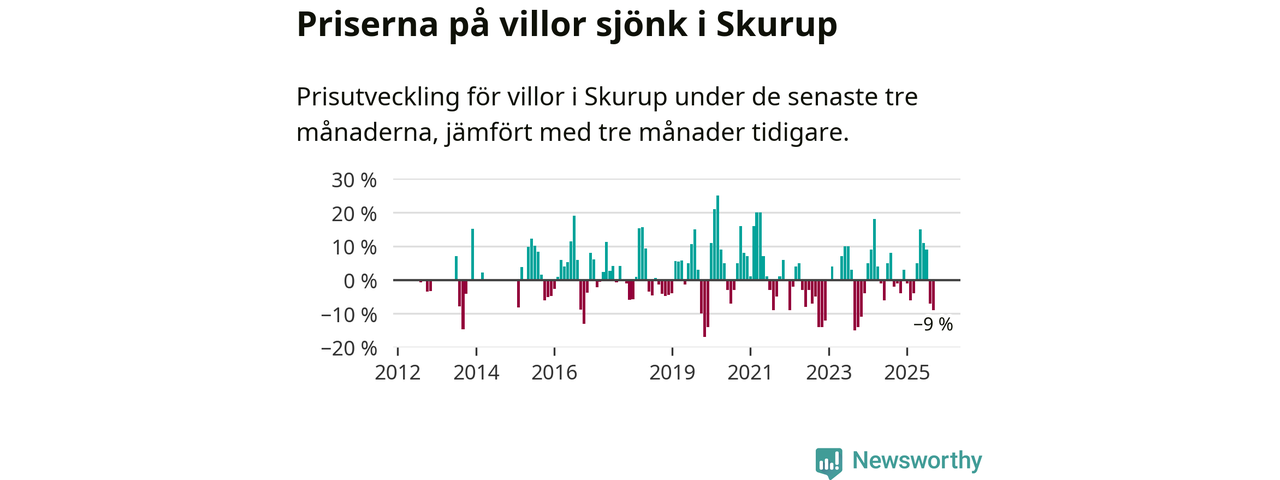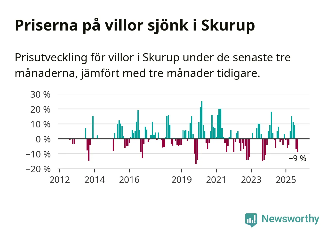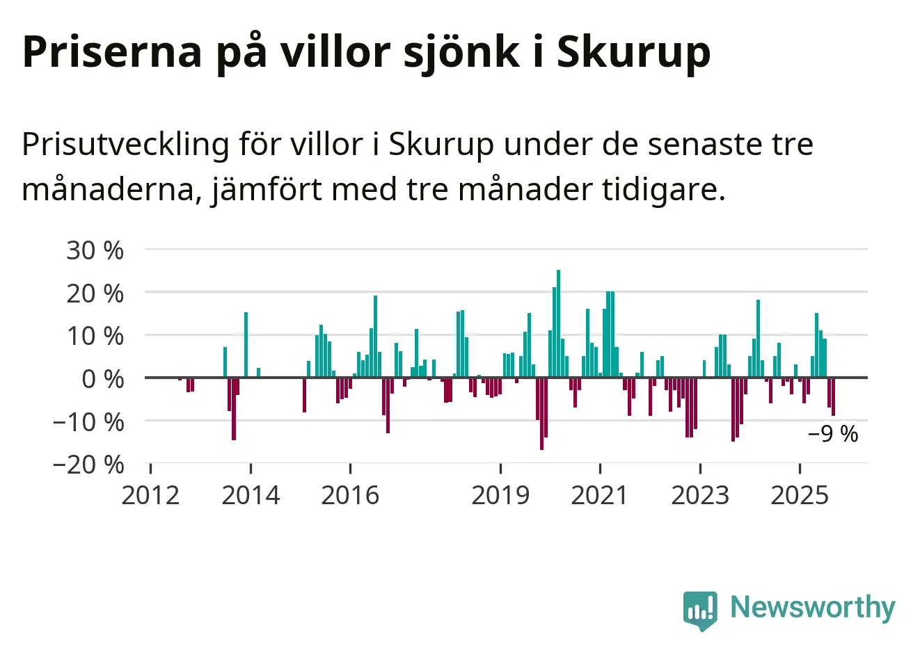 Statistiken visar även på en stor prisnedgång i Skurups kommun. Medelpriset på försäljningarna av villor i kommunen var 9 procent lägre än för tre månader sedan. I hela Skåne däremot ökar villapriserna. I hela länet noterades en prisuppgång på 1 procent.