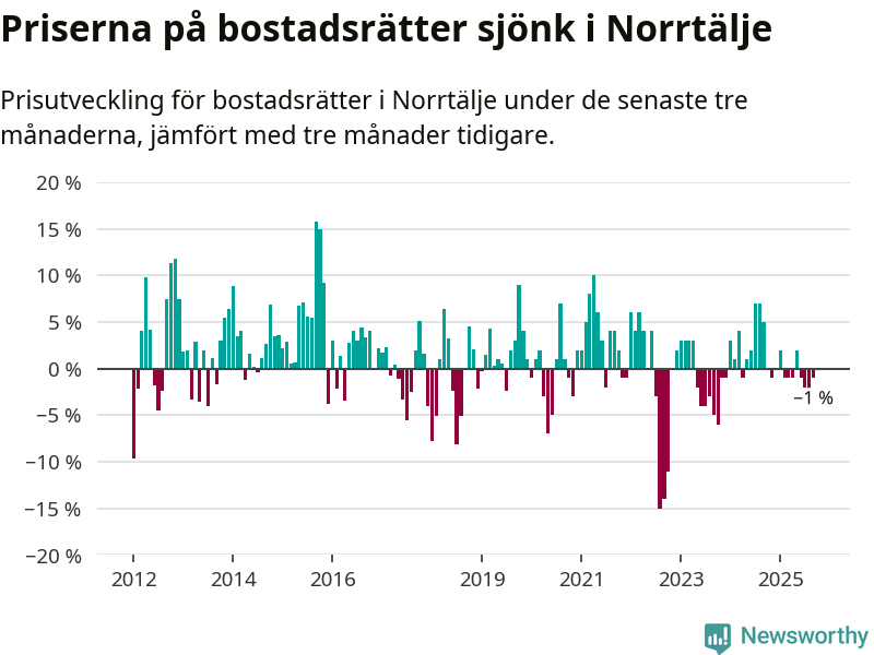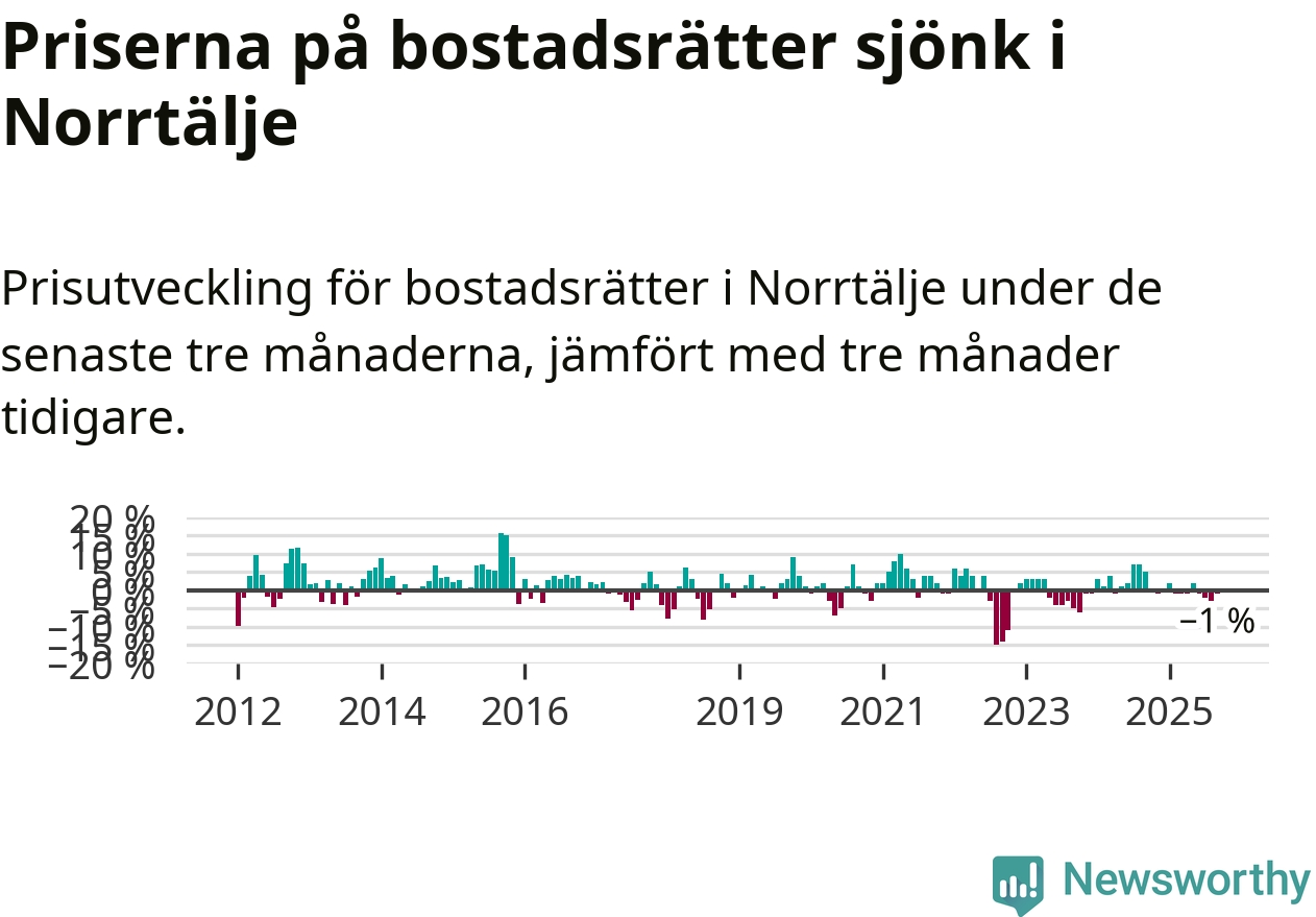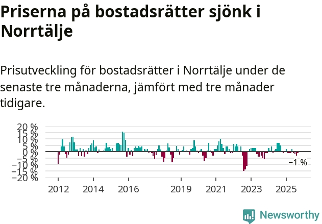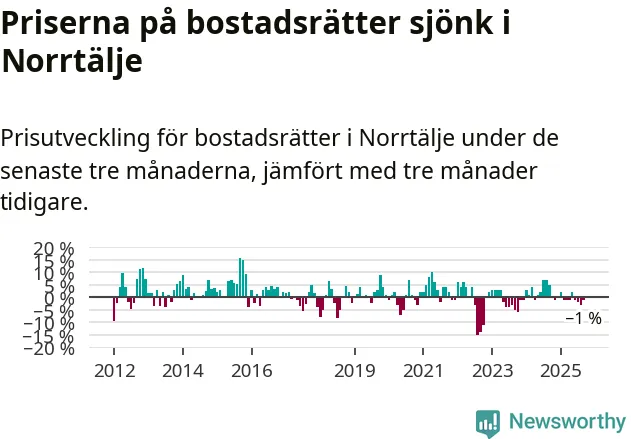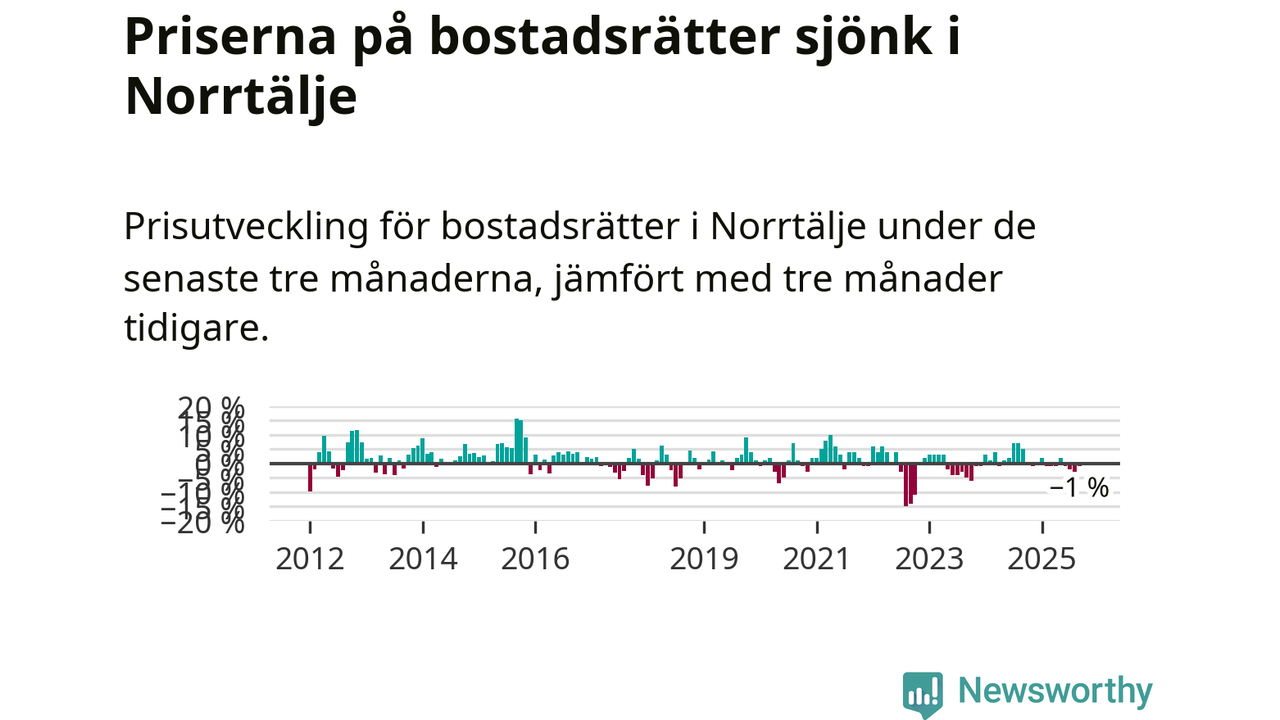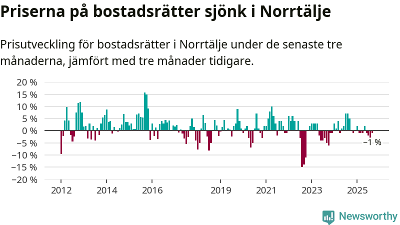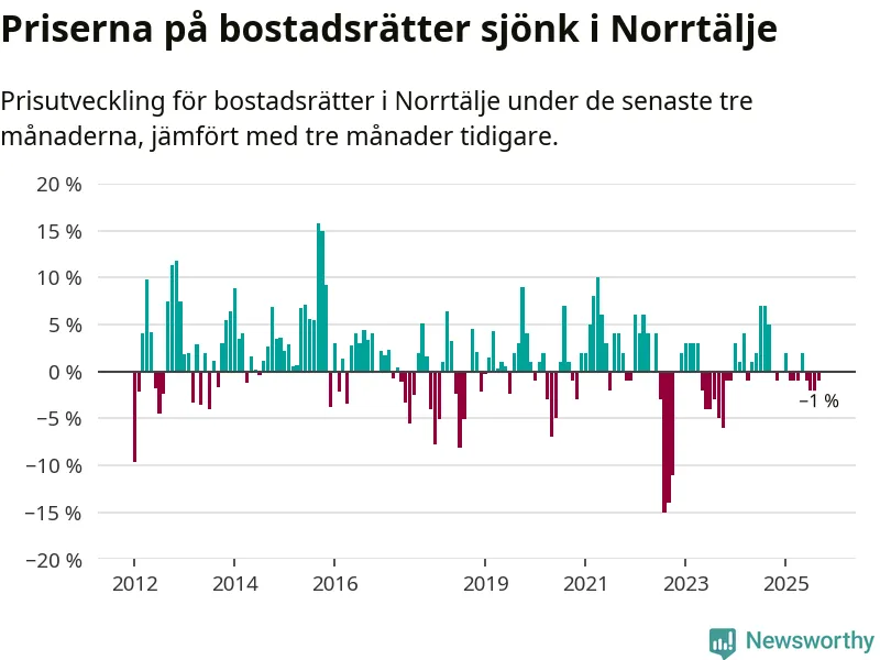 Priserna på bostadsrätter har gått ner i Norrtälje kommun. Medelpriset på försäljningarna under de senaste tre månaderna visar på en nedgång med 1 procent.