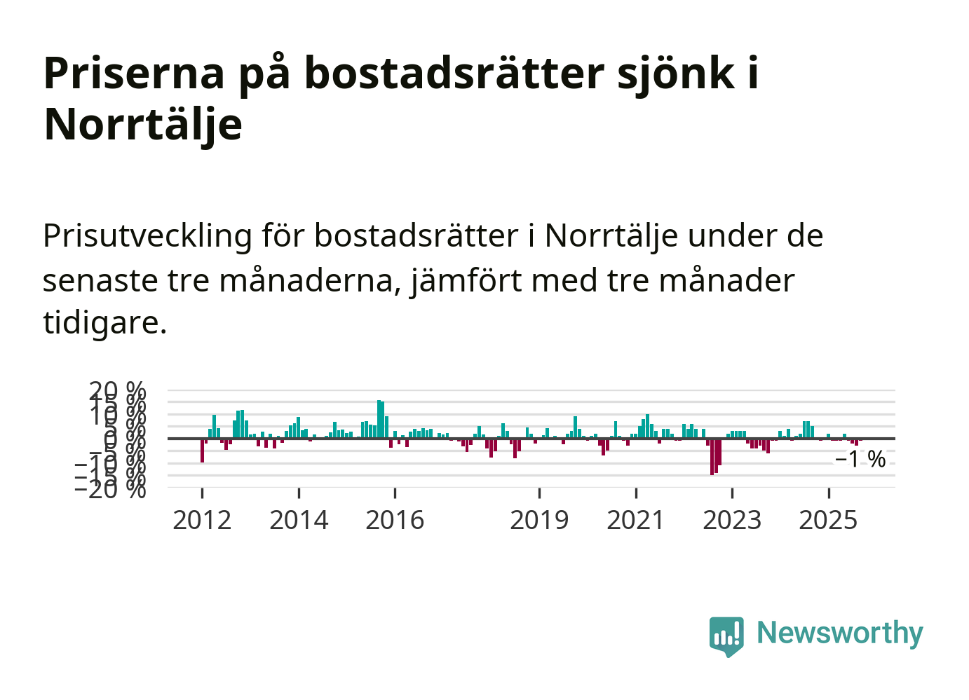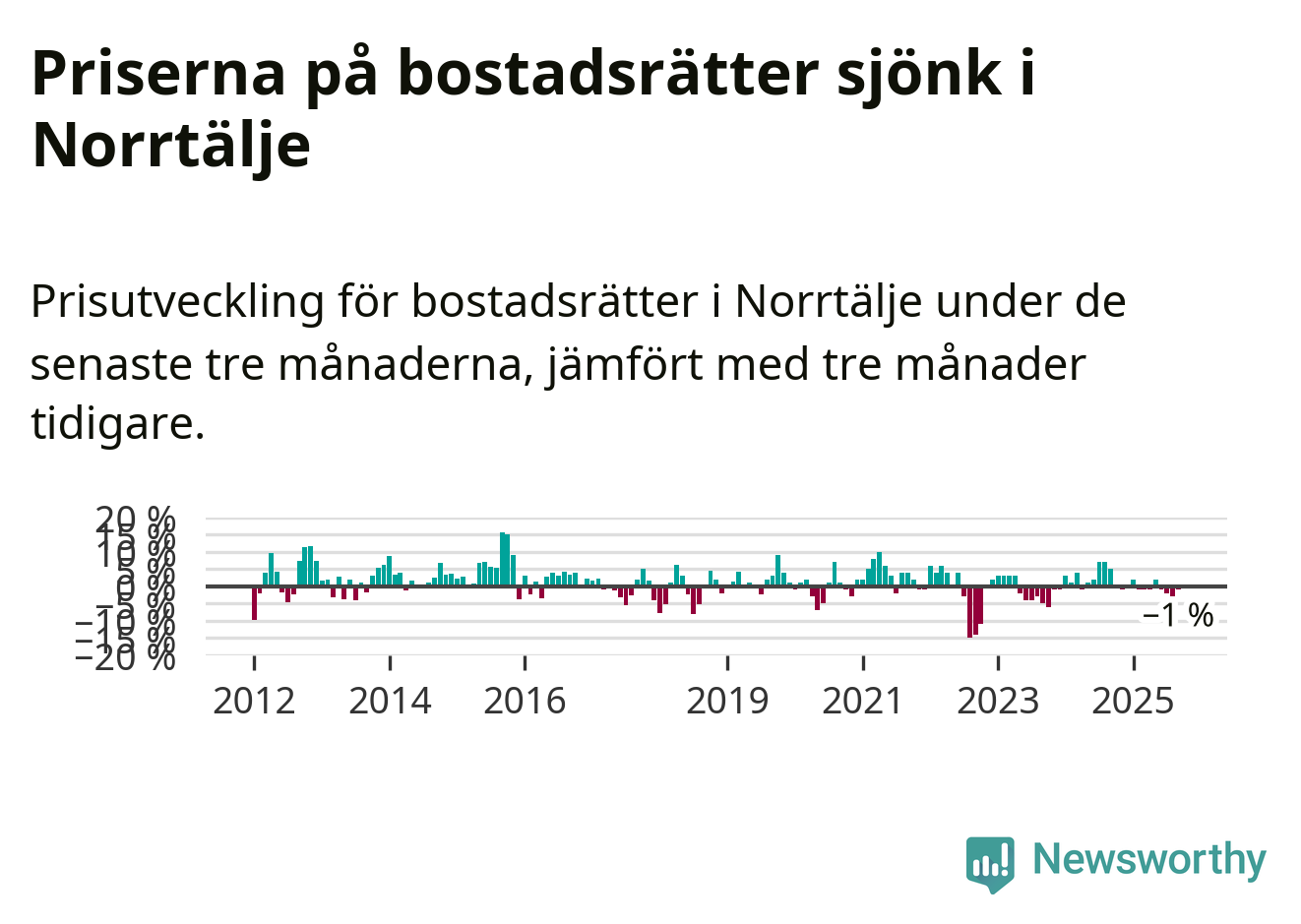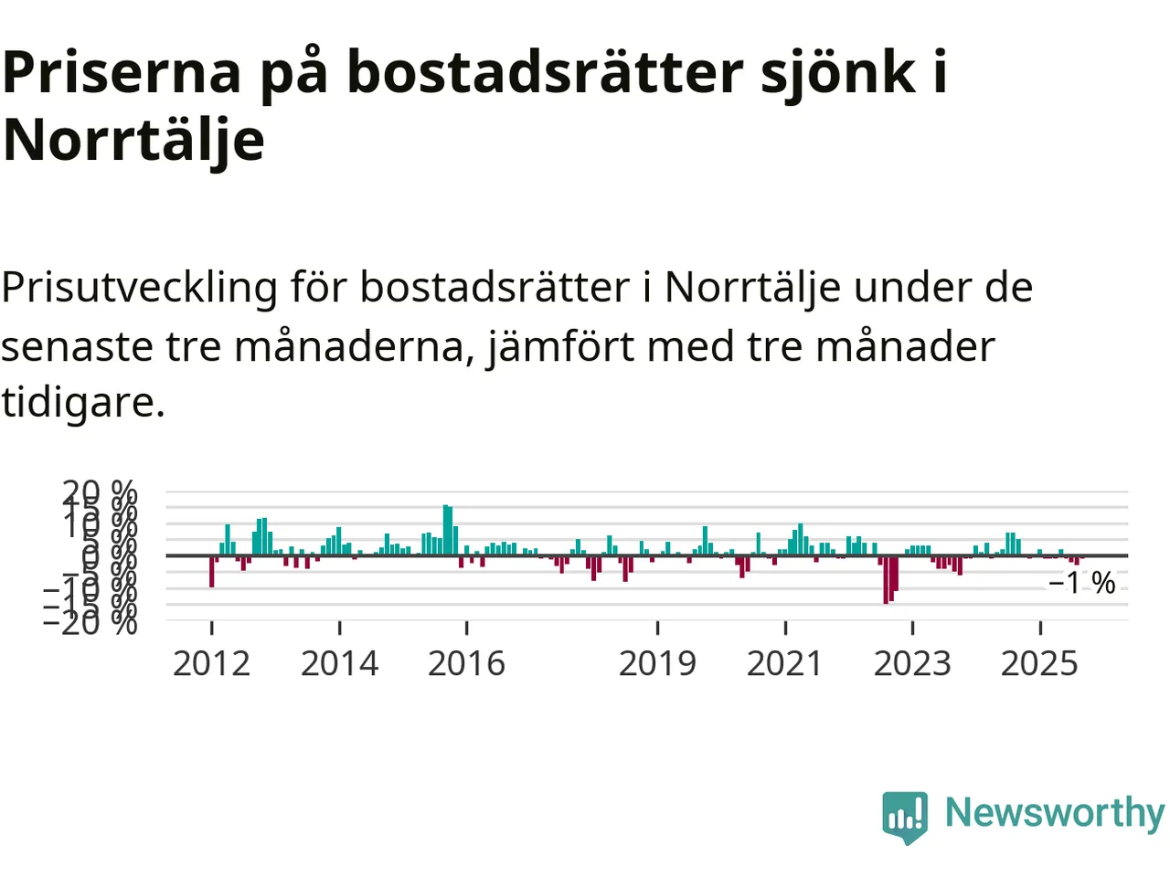 Priserna på bostadsrätter har gått ner i Norrtälje kommun. Medelpriset på försäljningarna under de senaste tre månaderna visar på en nedgång med 1 procent.