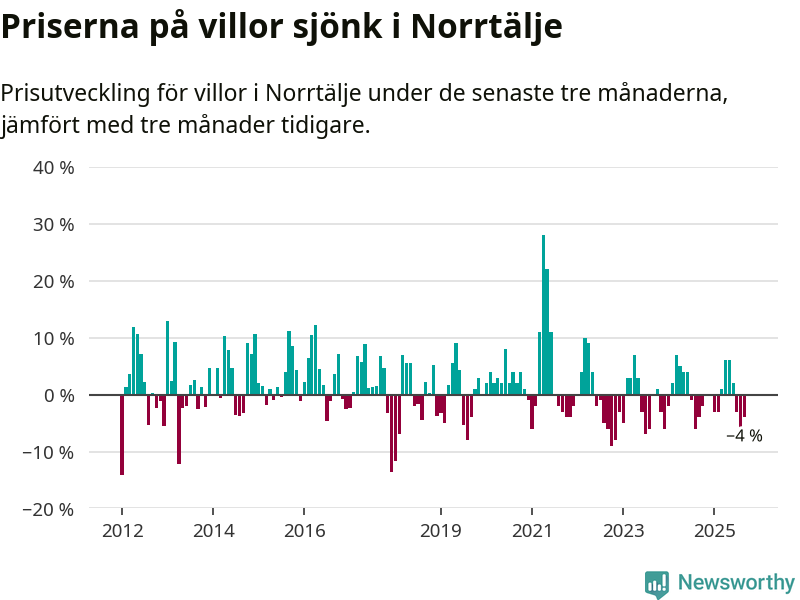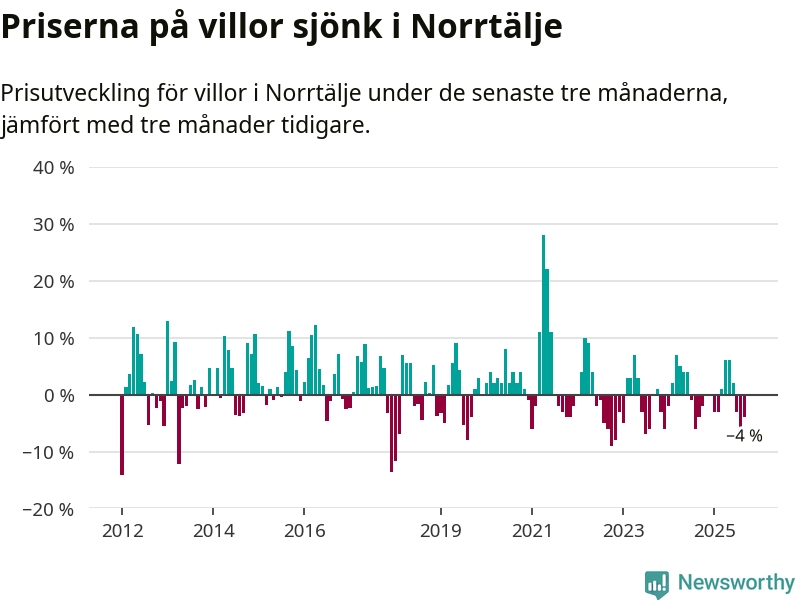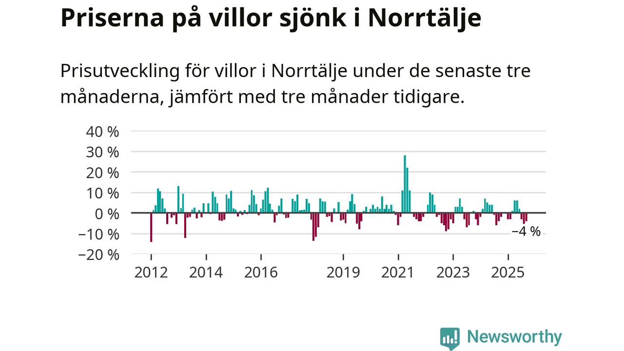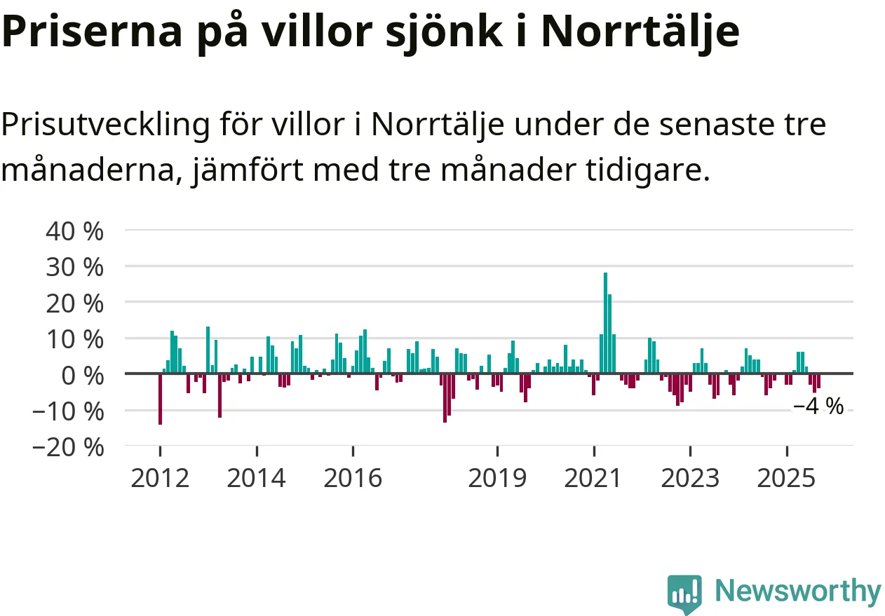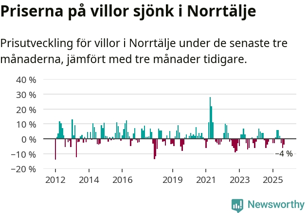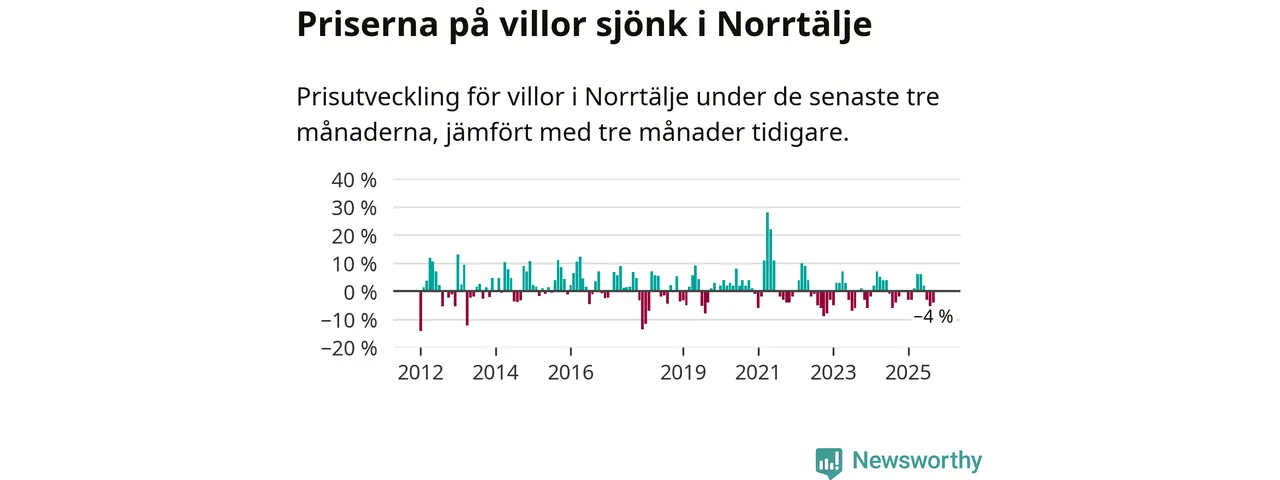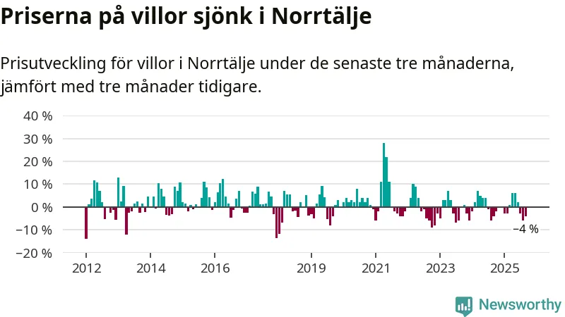 Villapriserna har gått ner i Norrtälje kommun. Medelpriset på försäljningarna under de senaste tre månaderna visar på en nedgång med 4 procent.