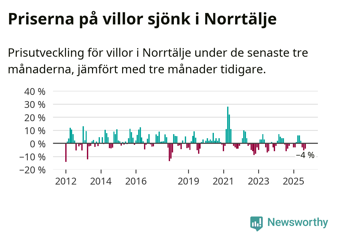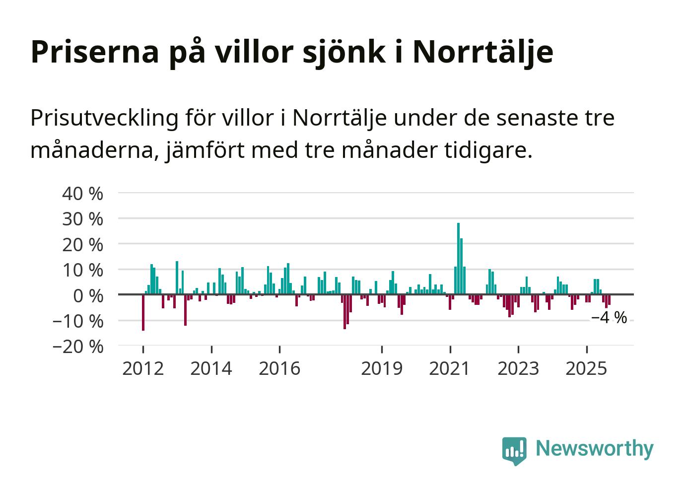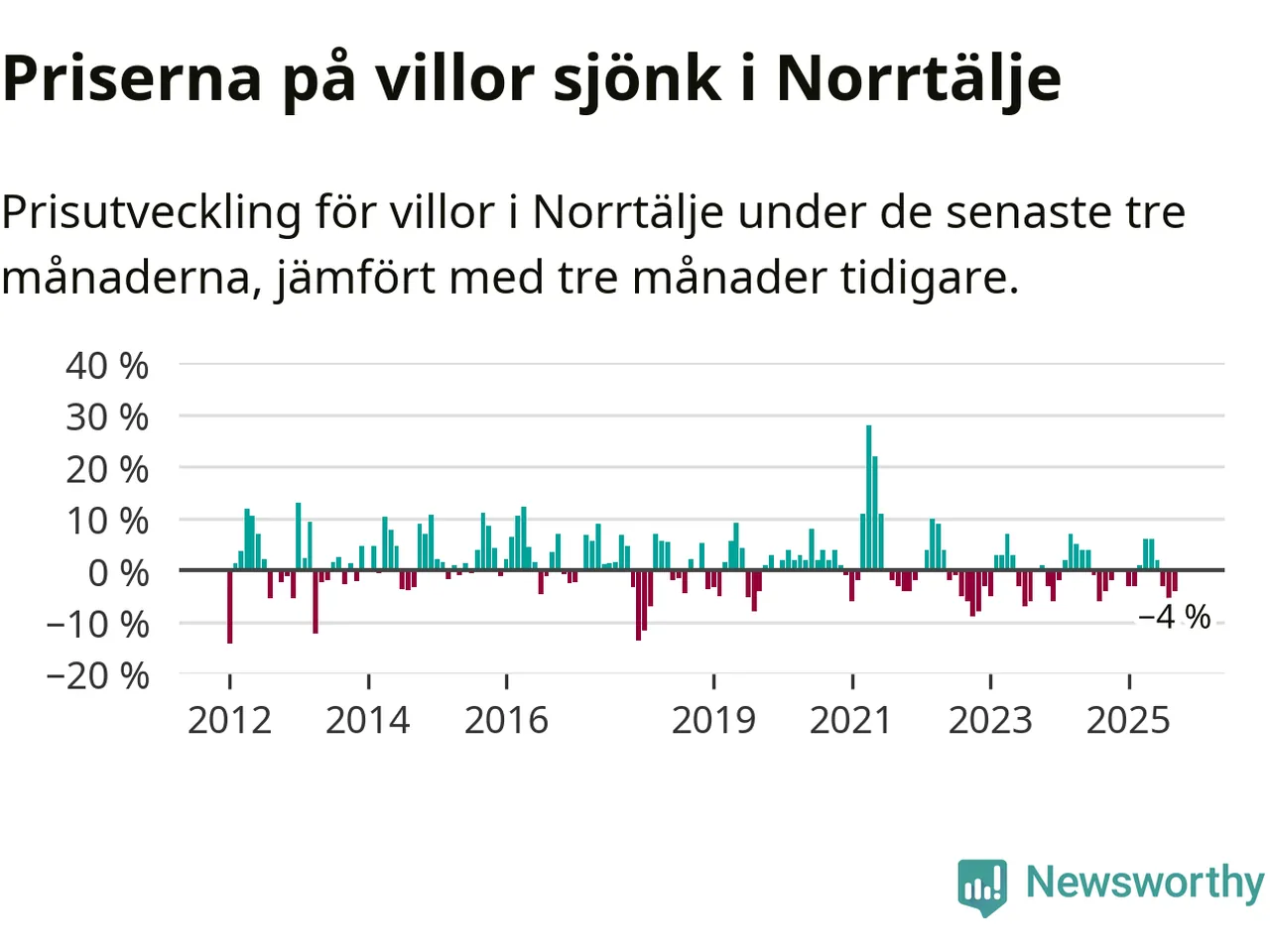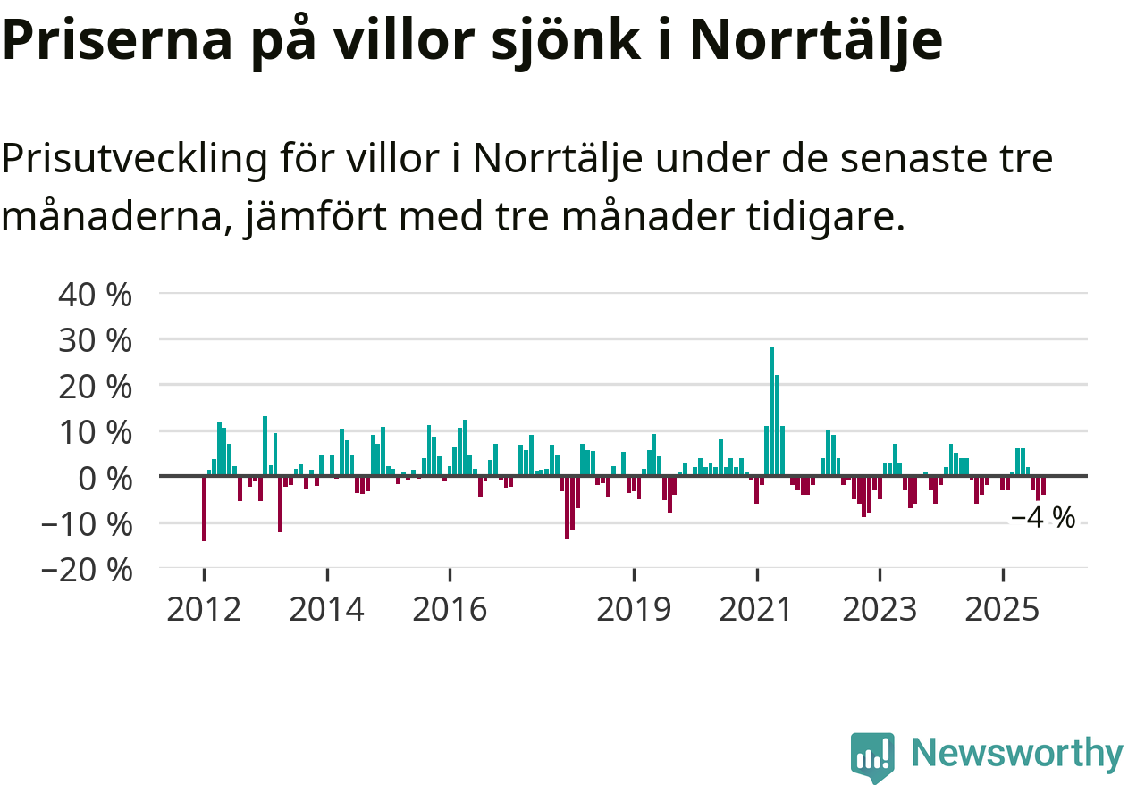 Villapriserna har gått ner i Norrtälje kommun. Medelpriset på försäljningarna under de senaste tre månaderna visar på en nedgång med 4 procent.