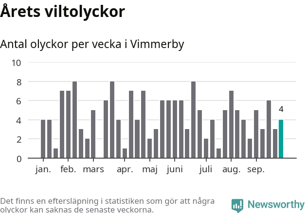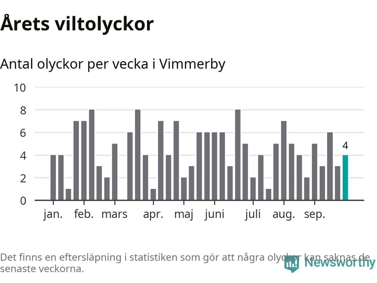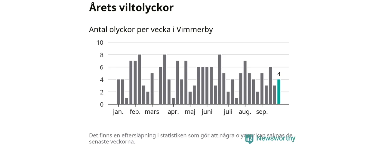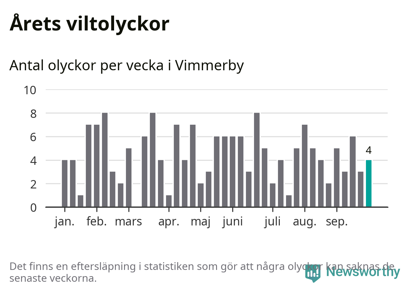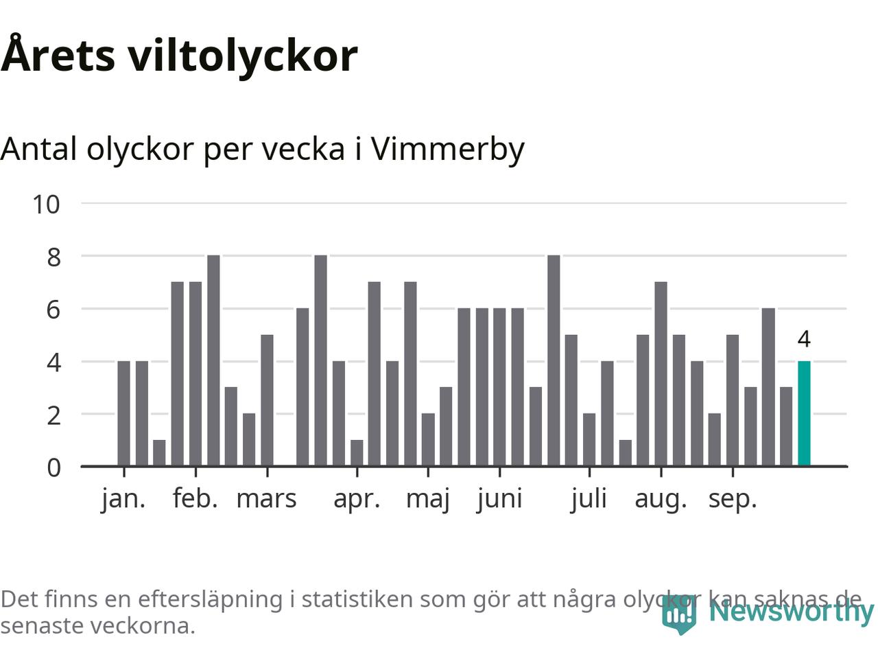 Hittills har fyra viltolyckor rapporterats in i Vimmerby kommun från vecka 40. Se listan här.