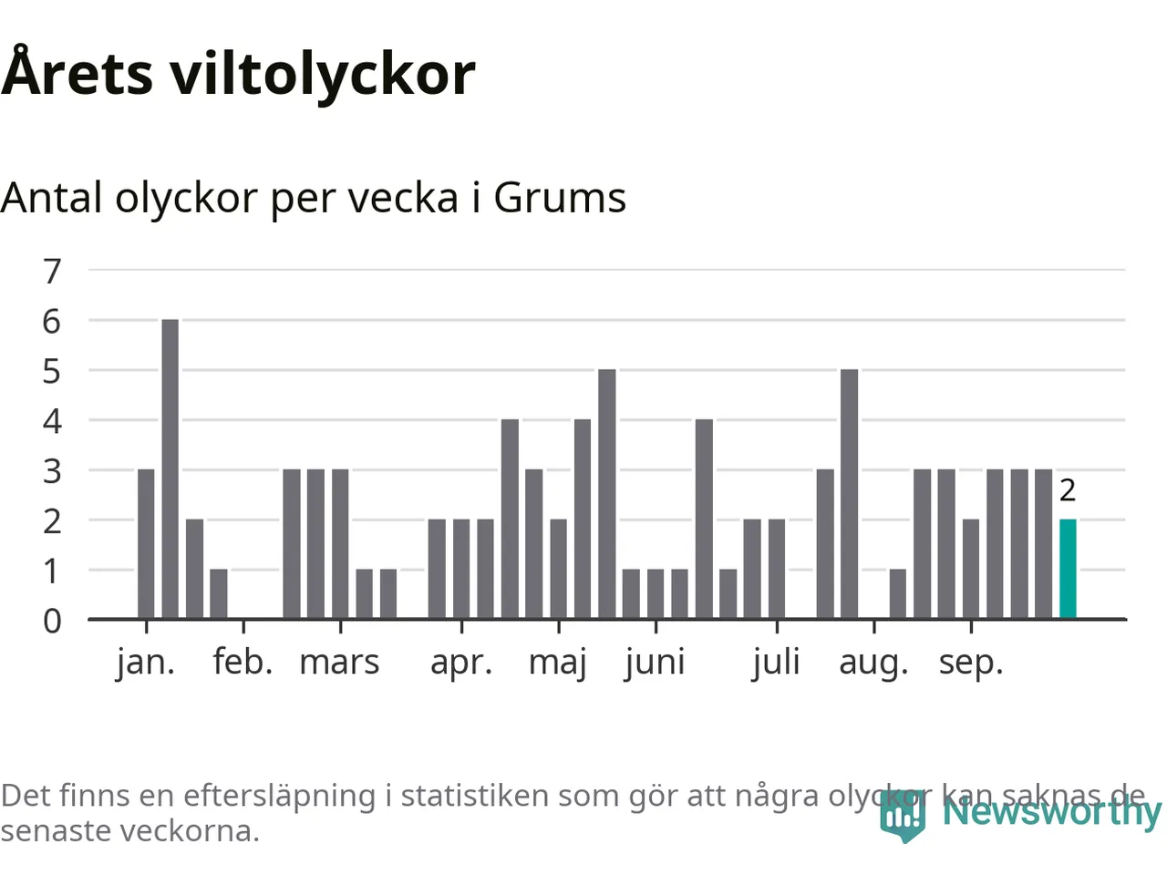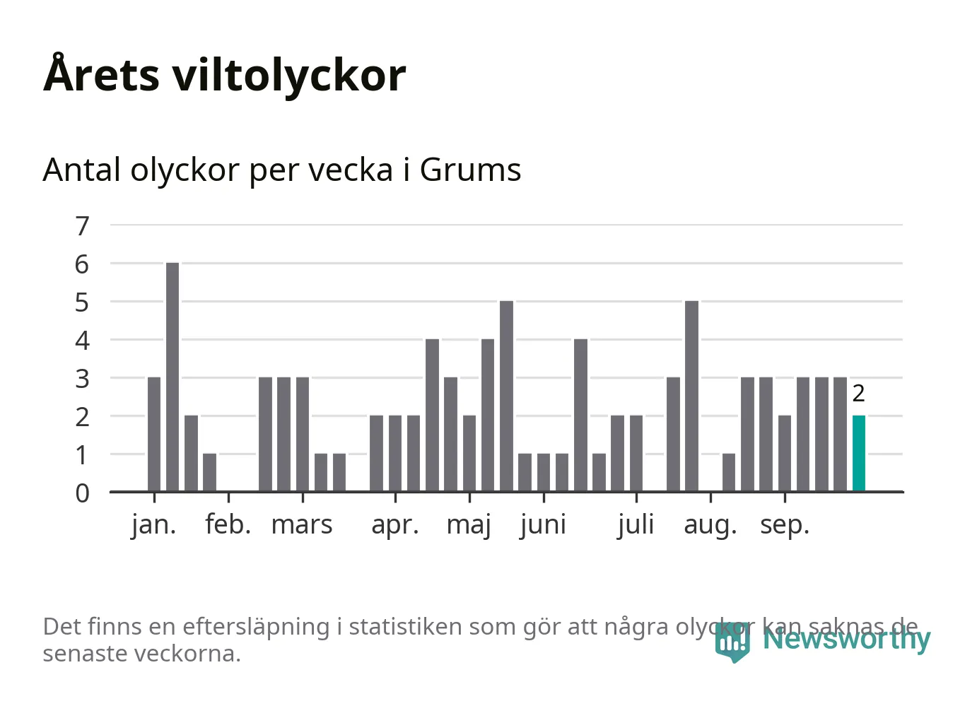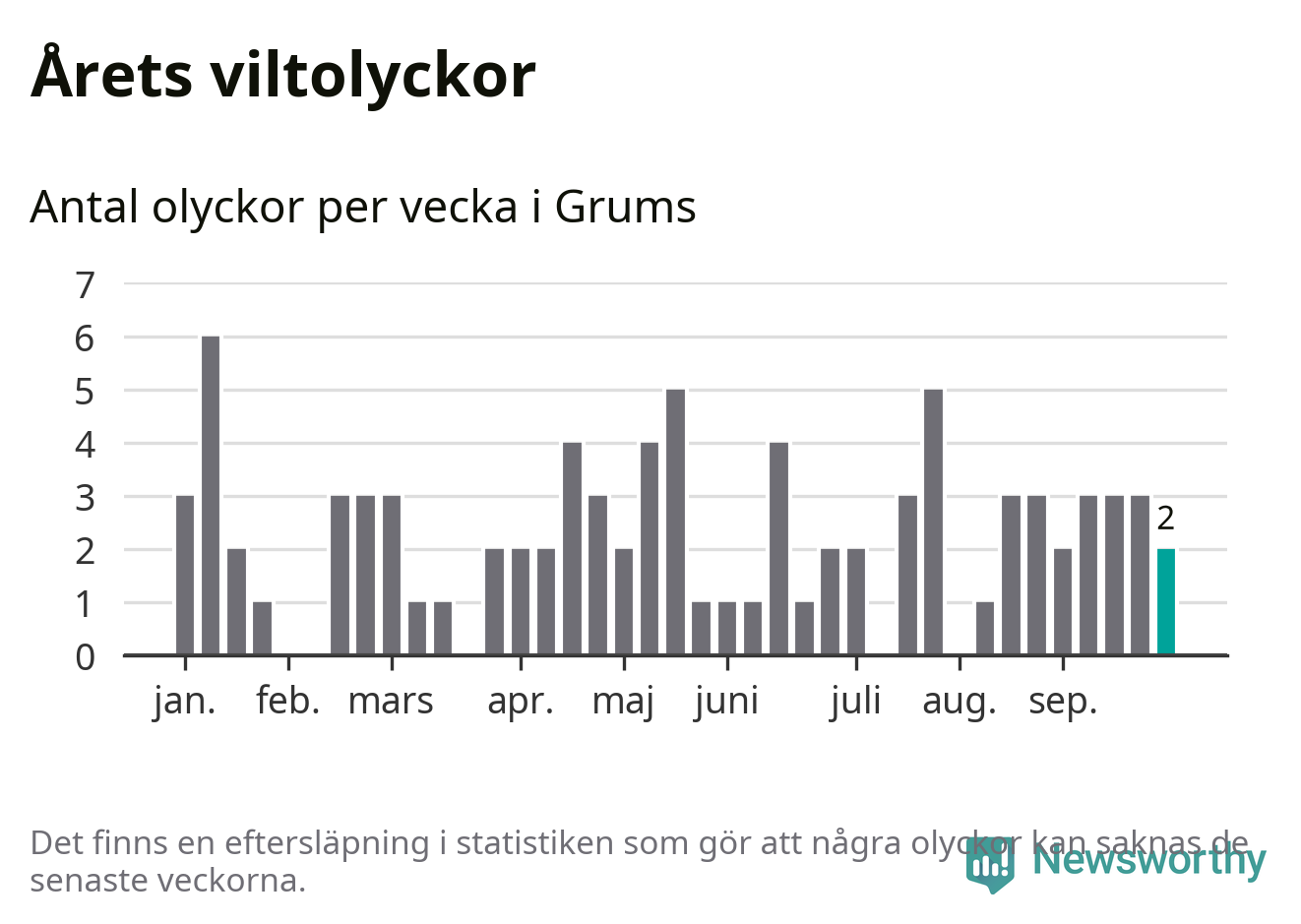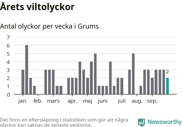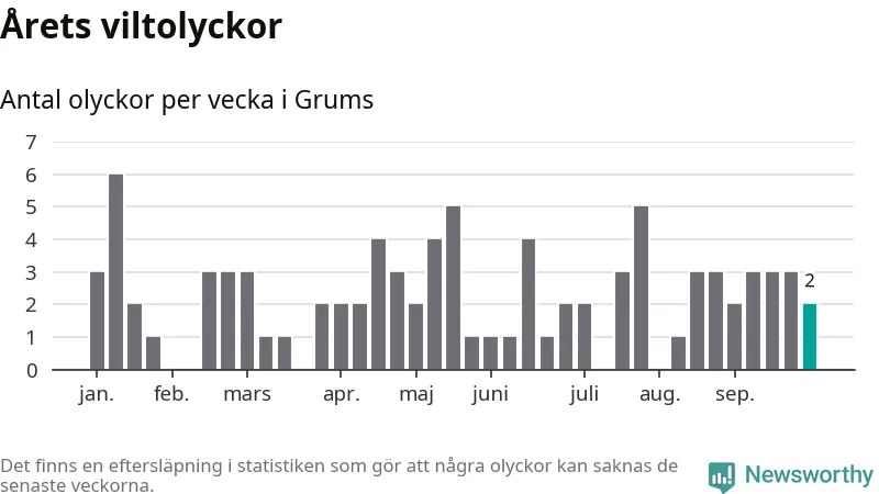Hittills har två viltolyckor rapporterats in i Grums kommun från vecka 40. Se listan här.