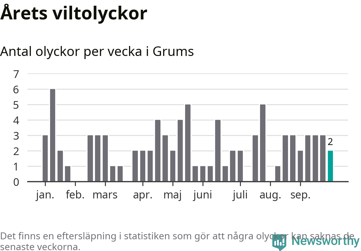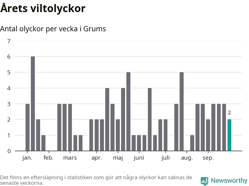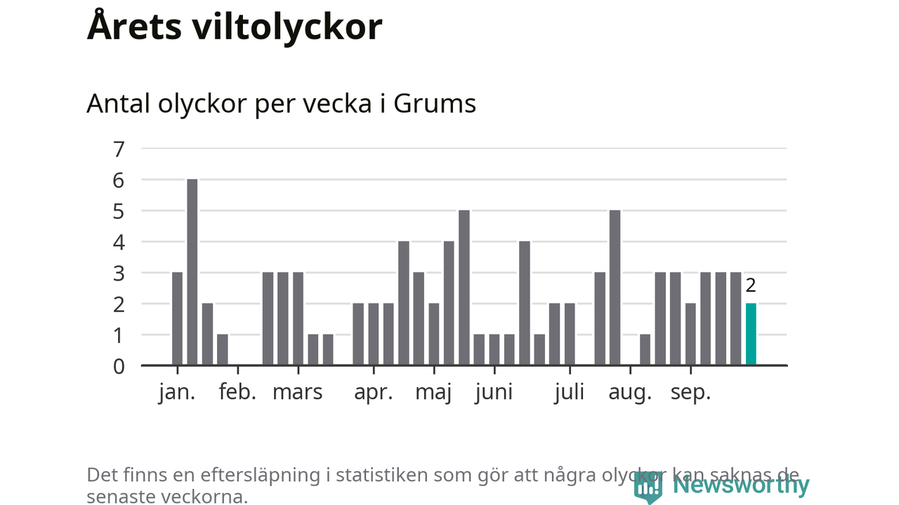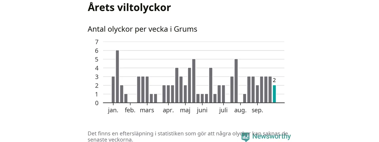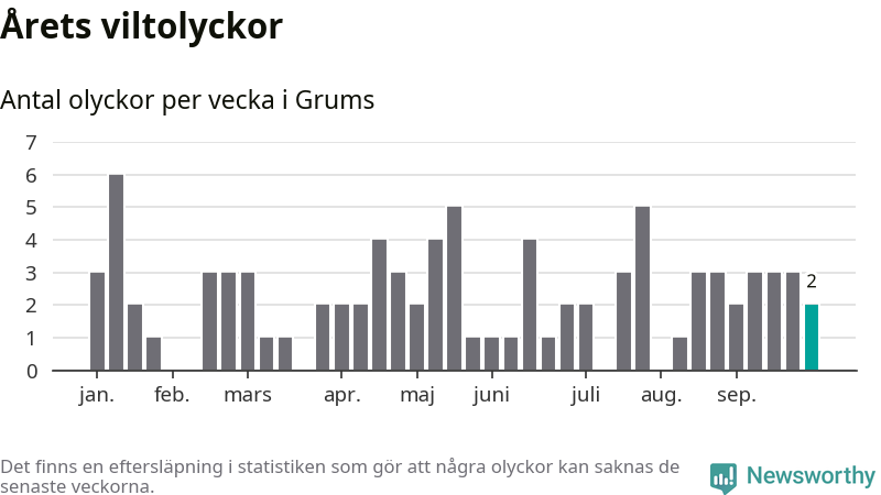 Hittills har två viltolyckor rapporterats in i Grums kommun från vecka 40. Se listan här.