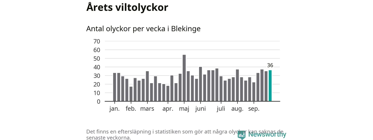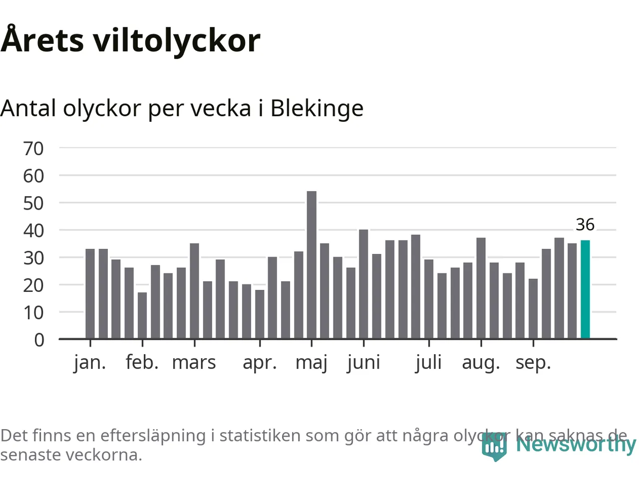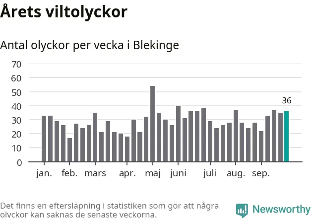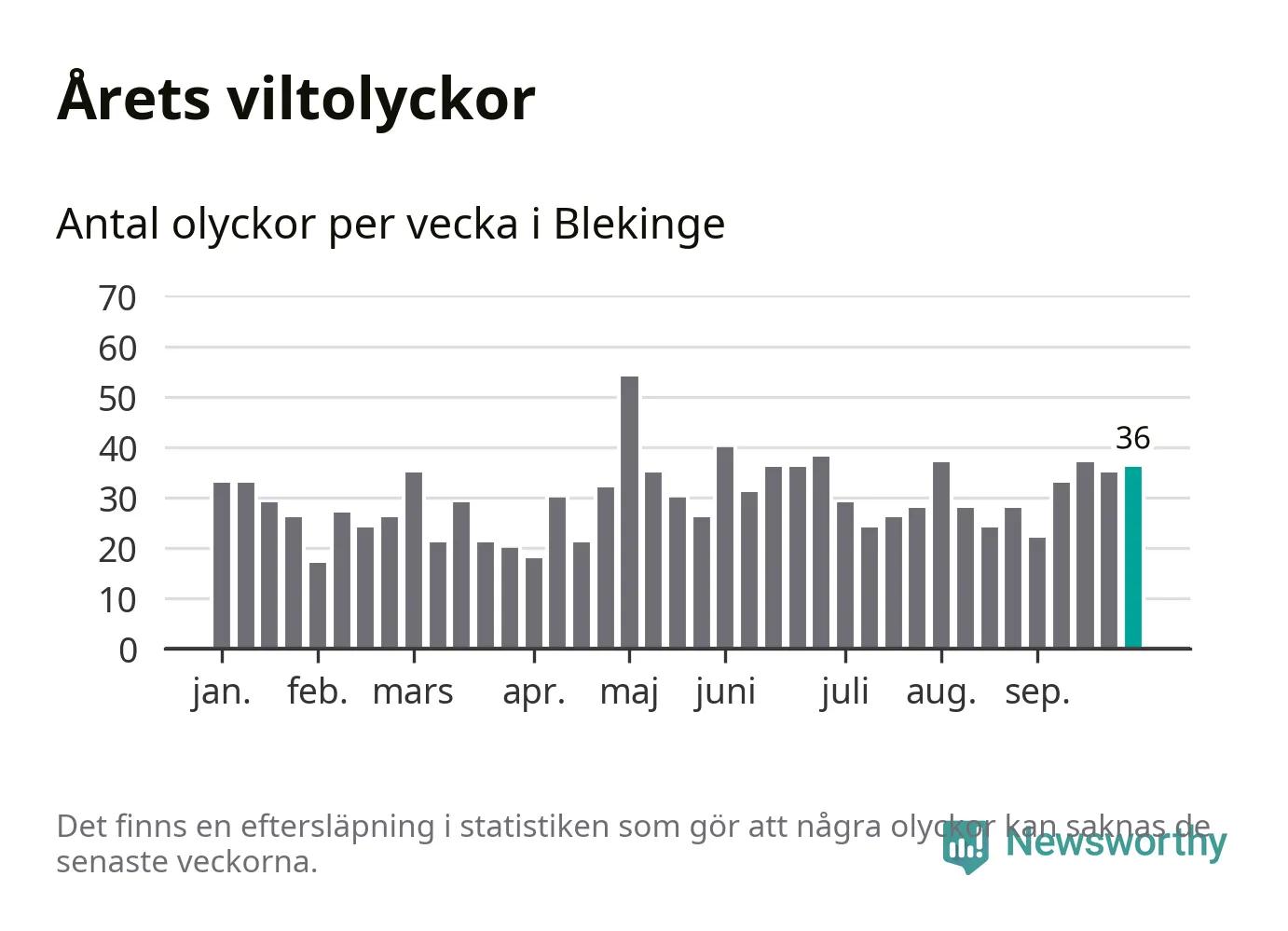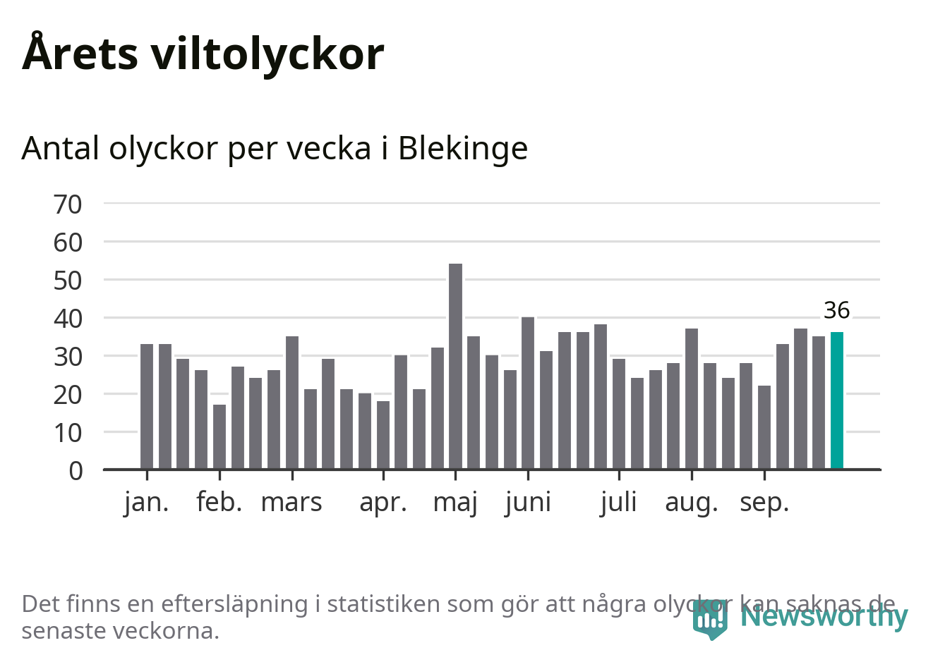 Hittills har 36 viltolyckor rapporterats in i Blekinge län från vecka 40. Se listan här.