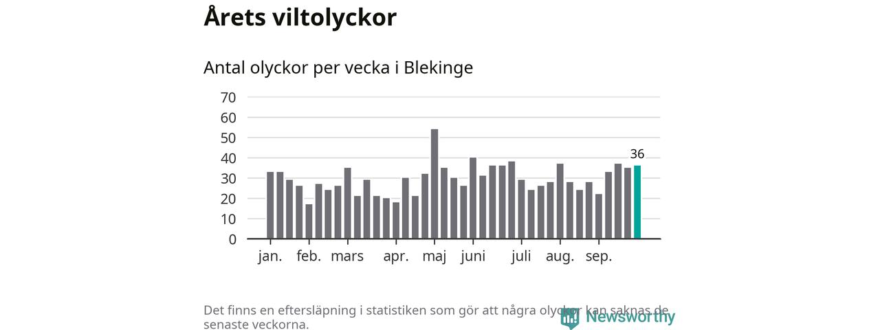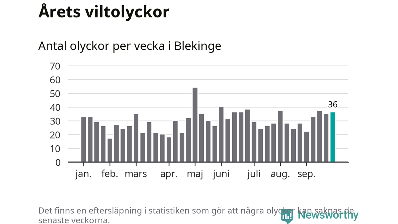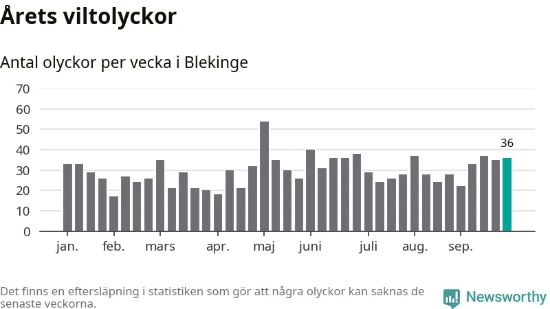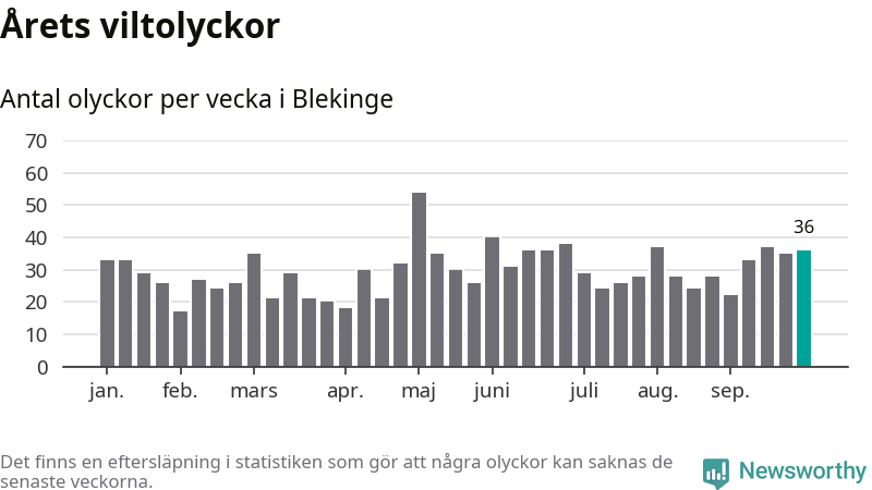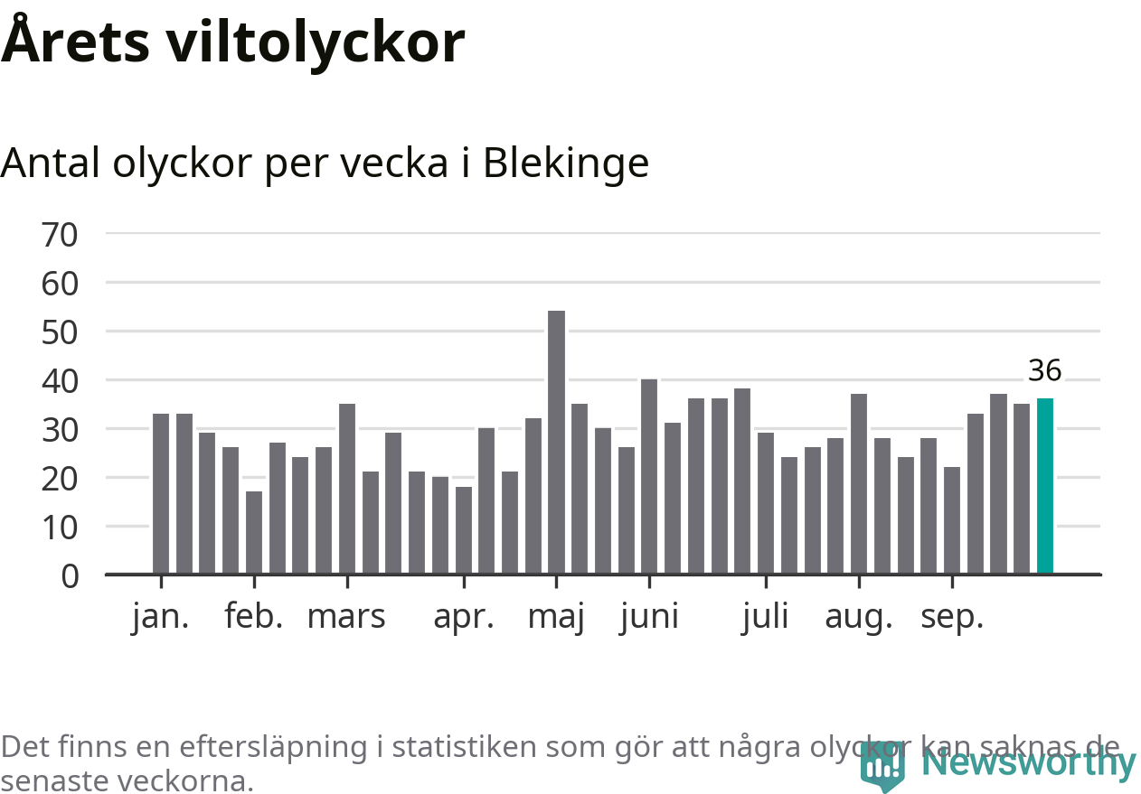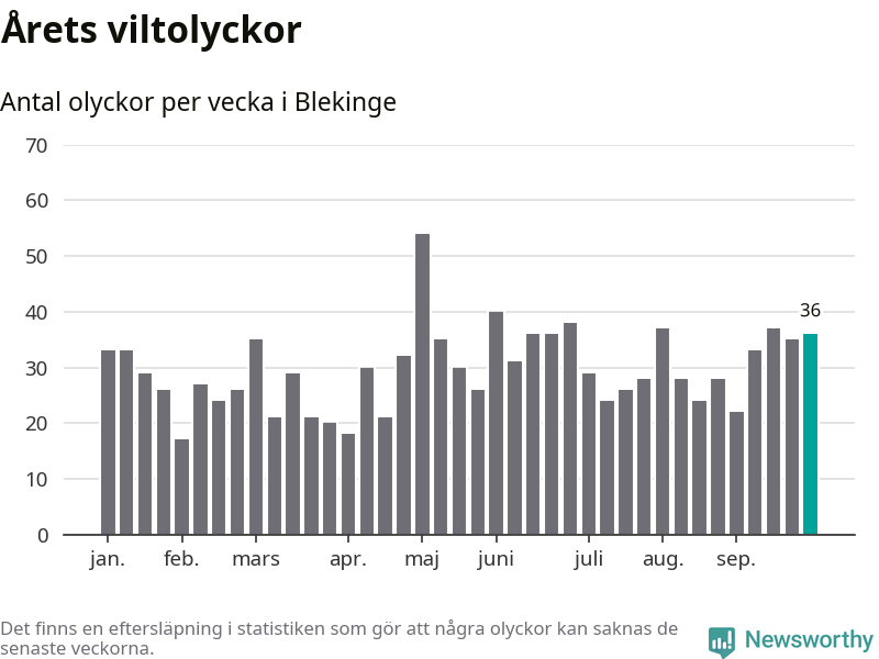 Hittills har 36 viltolyckor rapporterats in i Blekinge län från vecka 40. Se listan här.