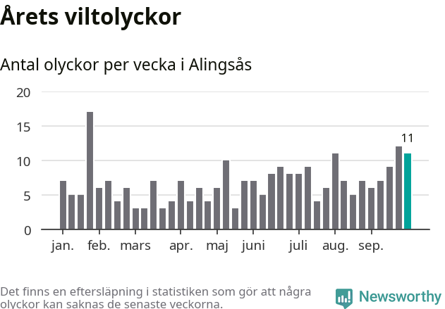 Hittills har elva viltolyckor rapporterats in i Alingsås kommun från vecka 40. Se listan här.