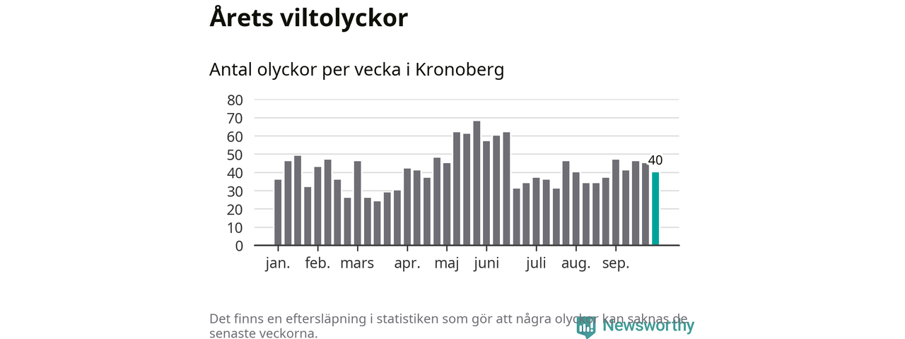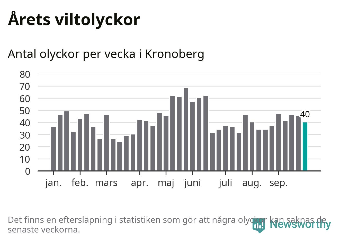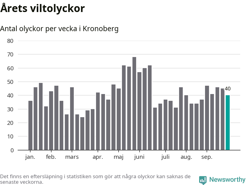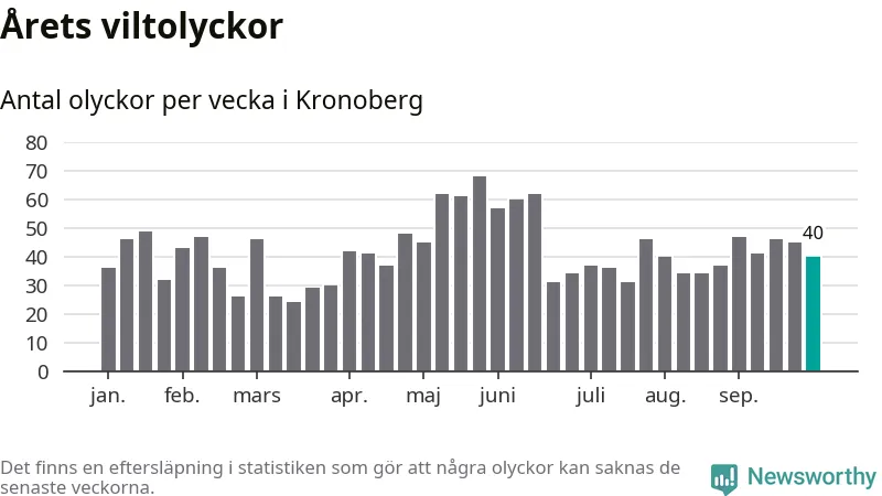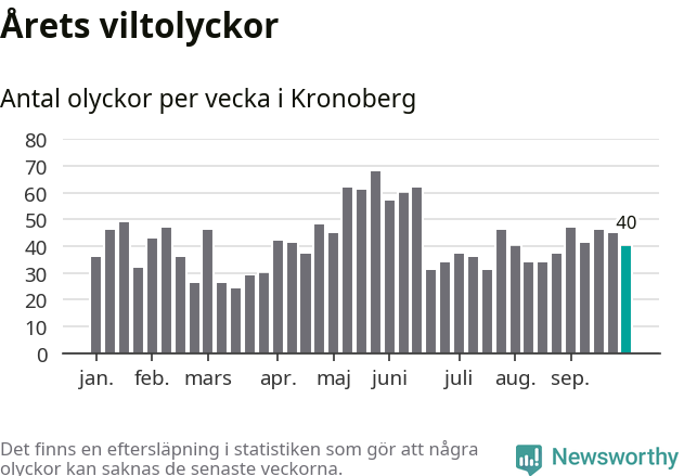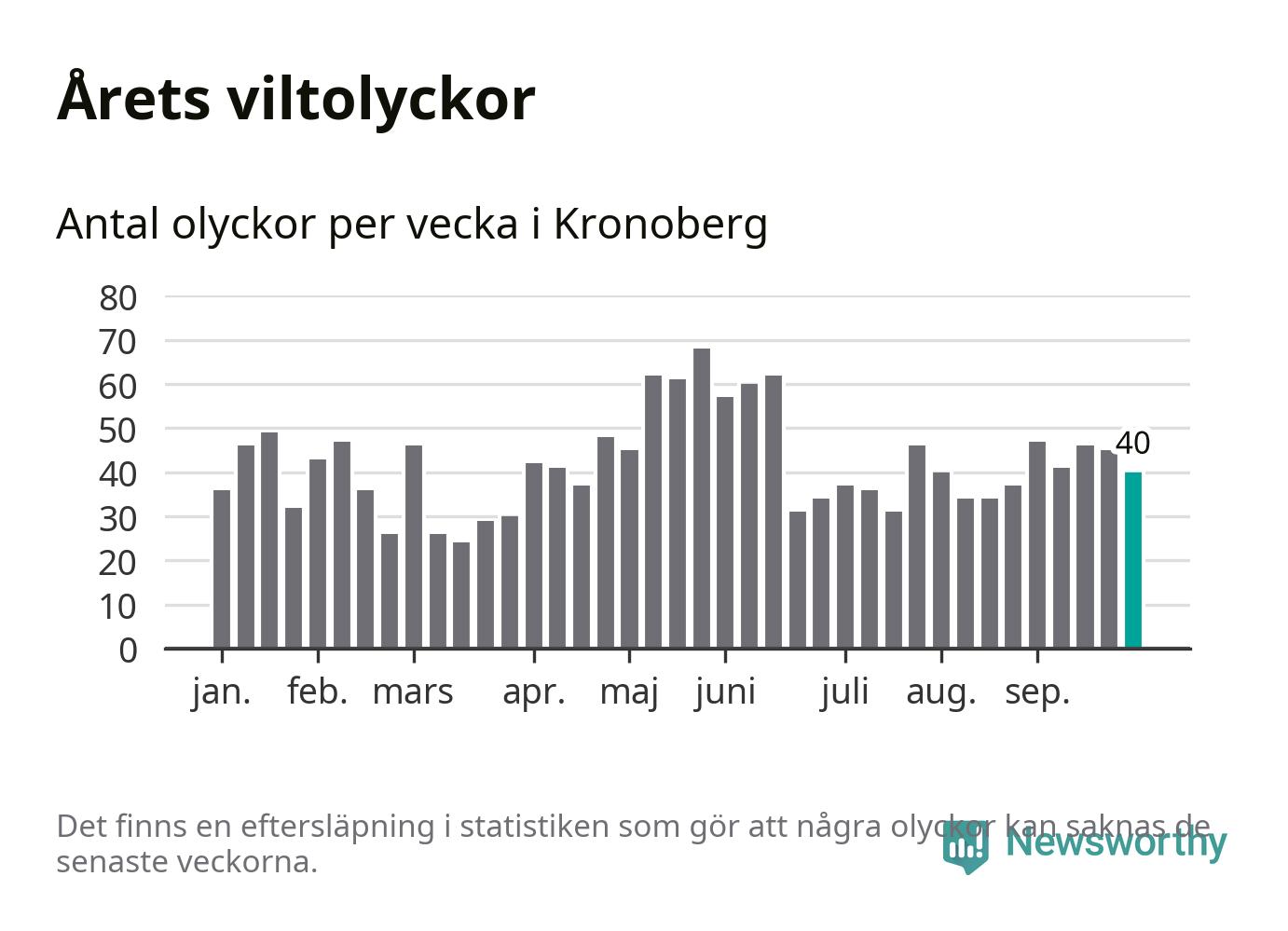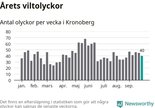 Hittills har 40 viltolyckor rapporterats in i Kronobergs län från vecka 40. Se listan här.