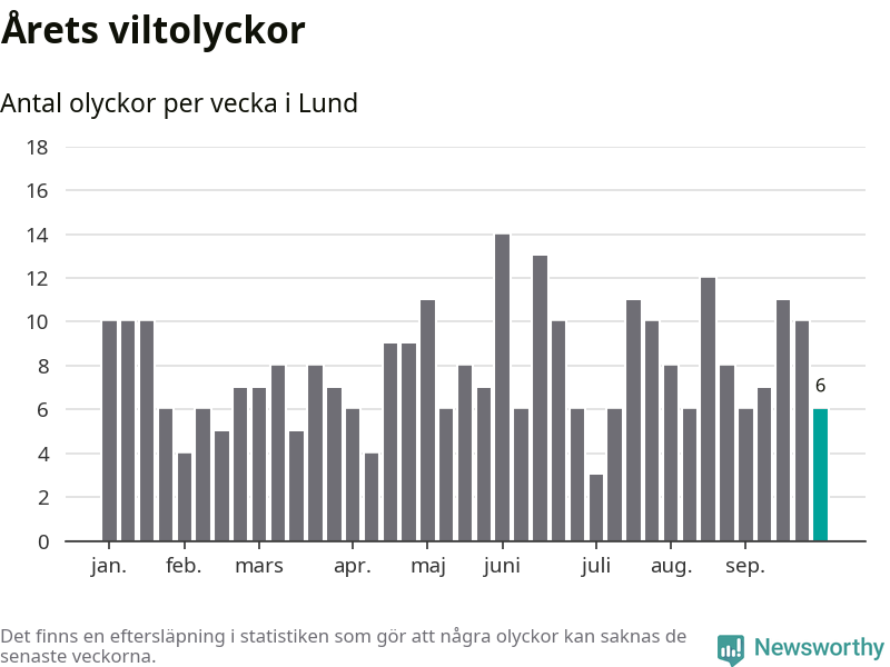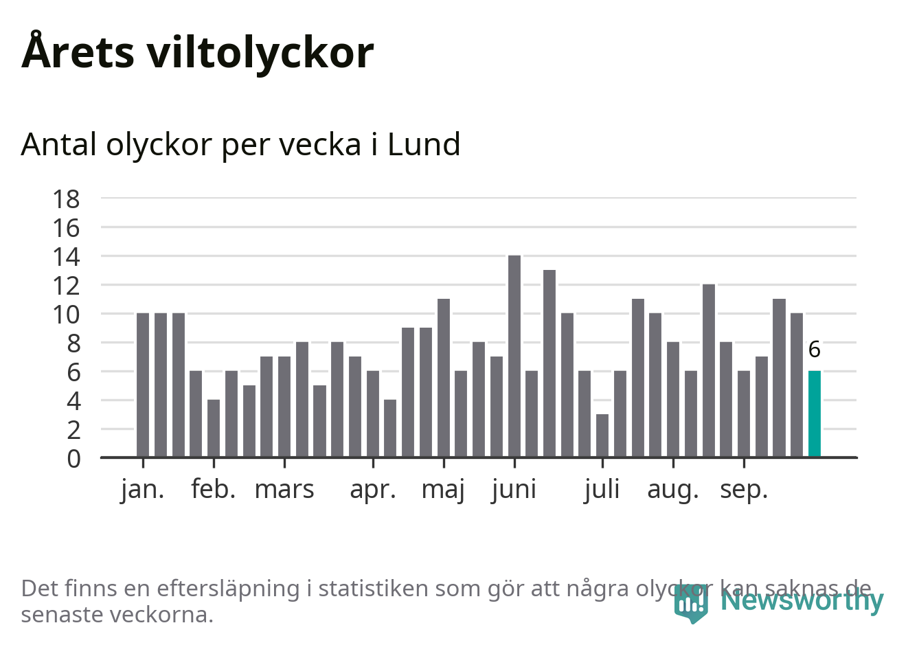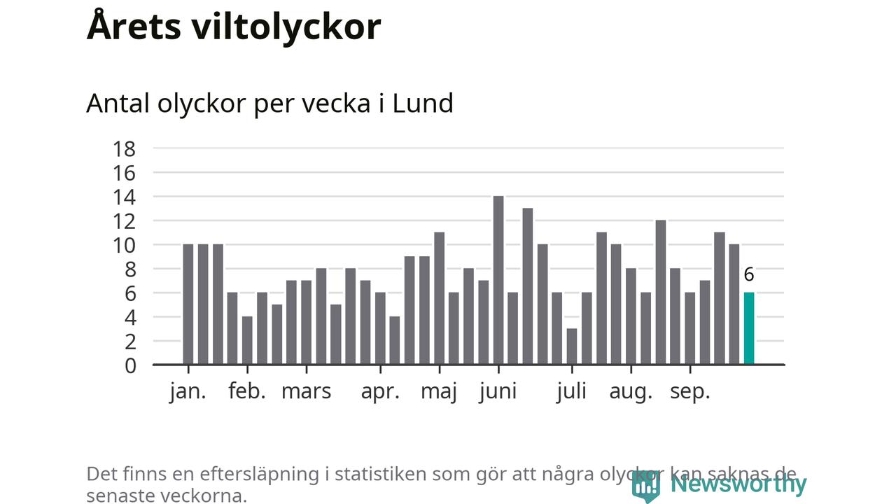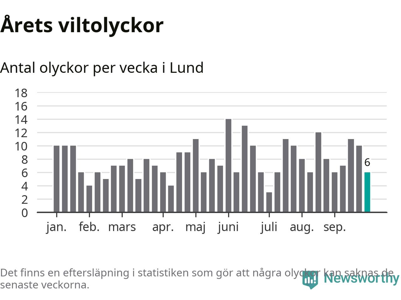Hittills har sex viltolyckor rapporterats in i Lunds kommun från vecka 40. Se listan här.