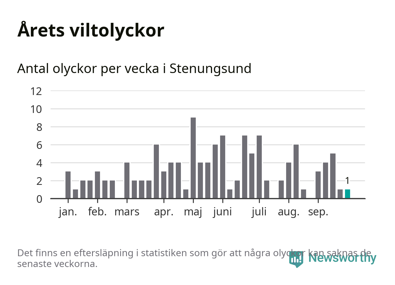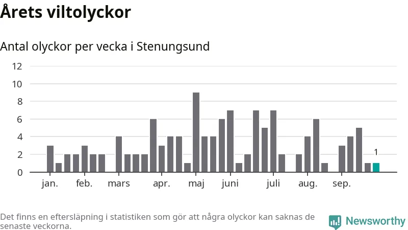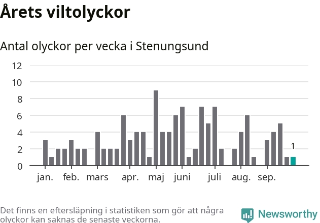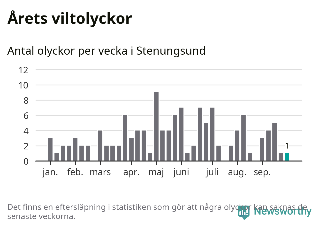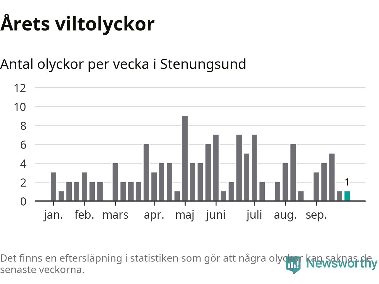 Från förra veckan (vecka 40) har hittills en viltolycka rapporterats in i Stenungsunds kommun.