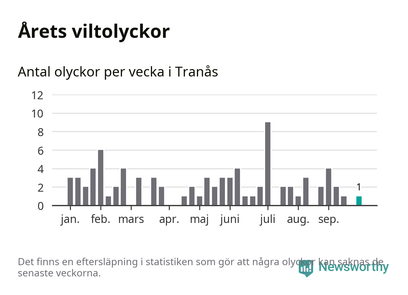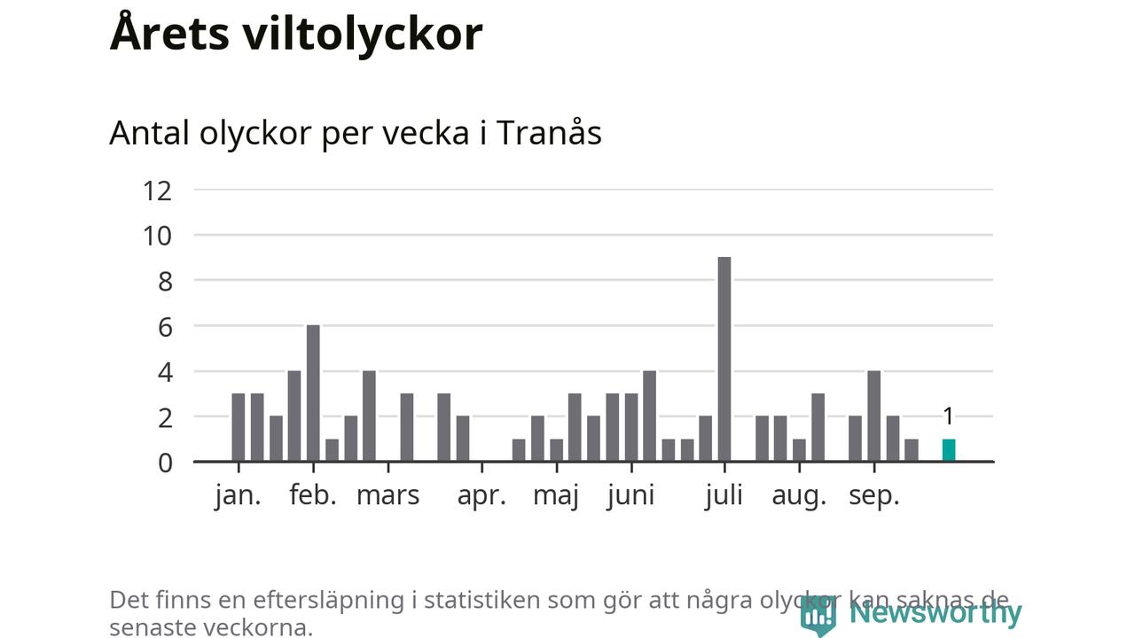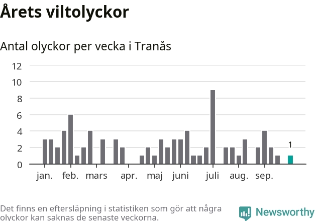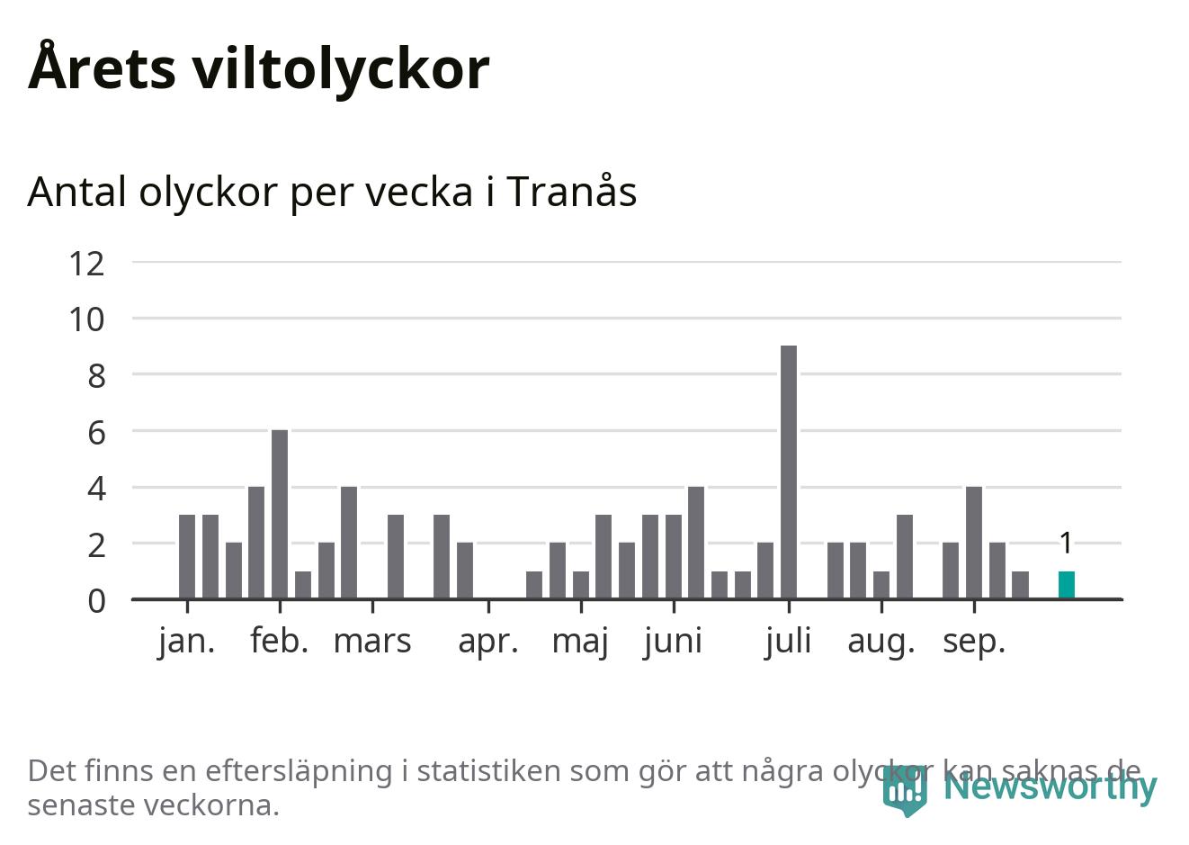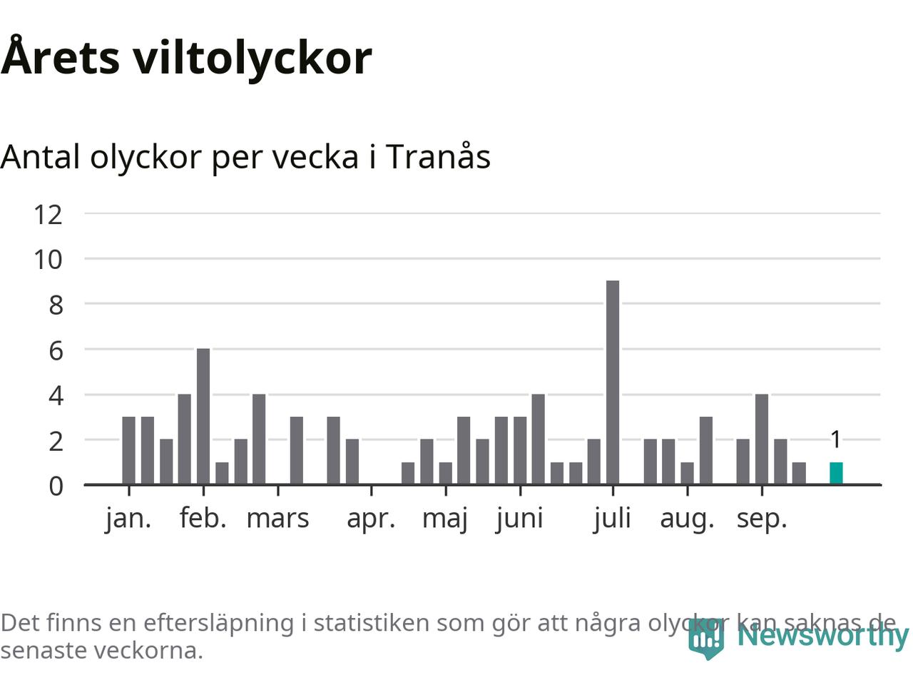 Från förra veckan (vecka 40) har hittills en viltolycka rapporterats in i Tranås kommun.