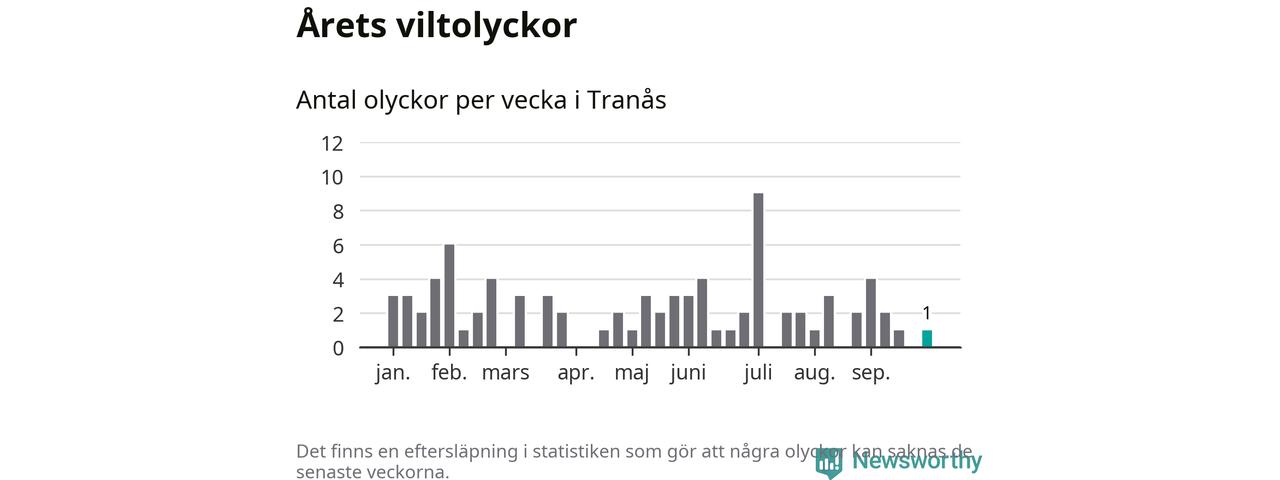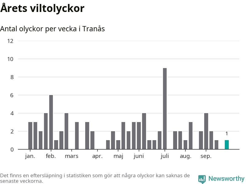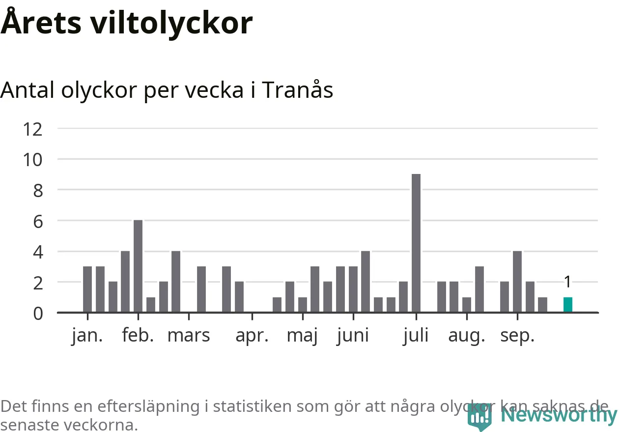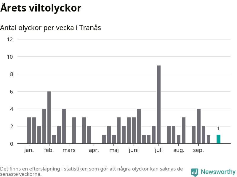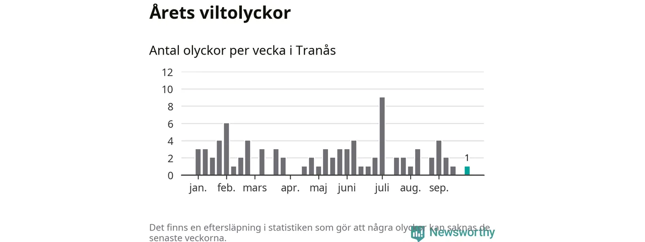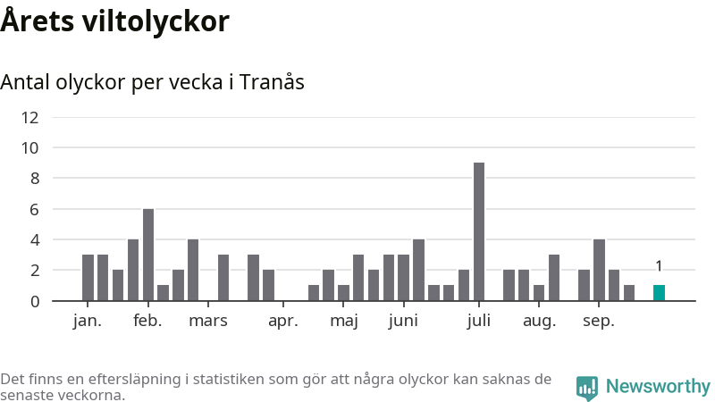 Från förra veckan (vecka 40) har hittills en viltolycka rapporterats in i Tranås kommun.