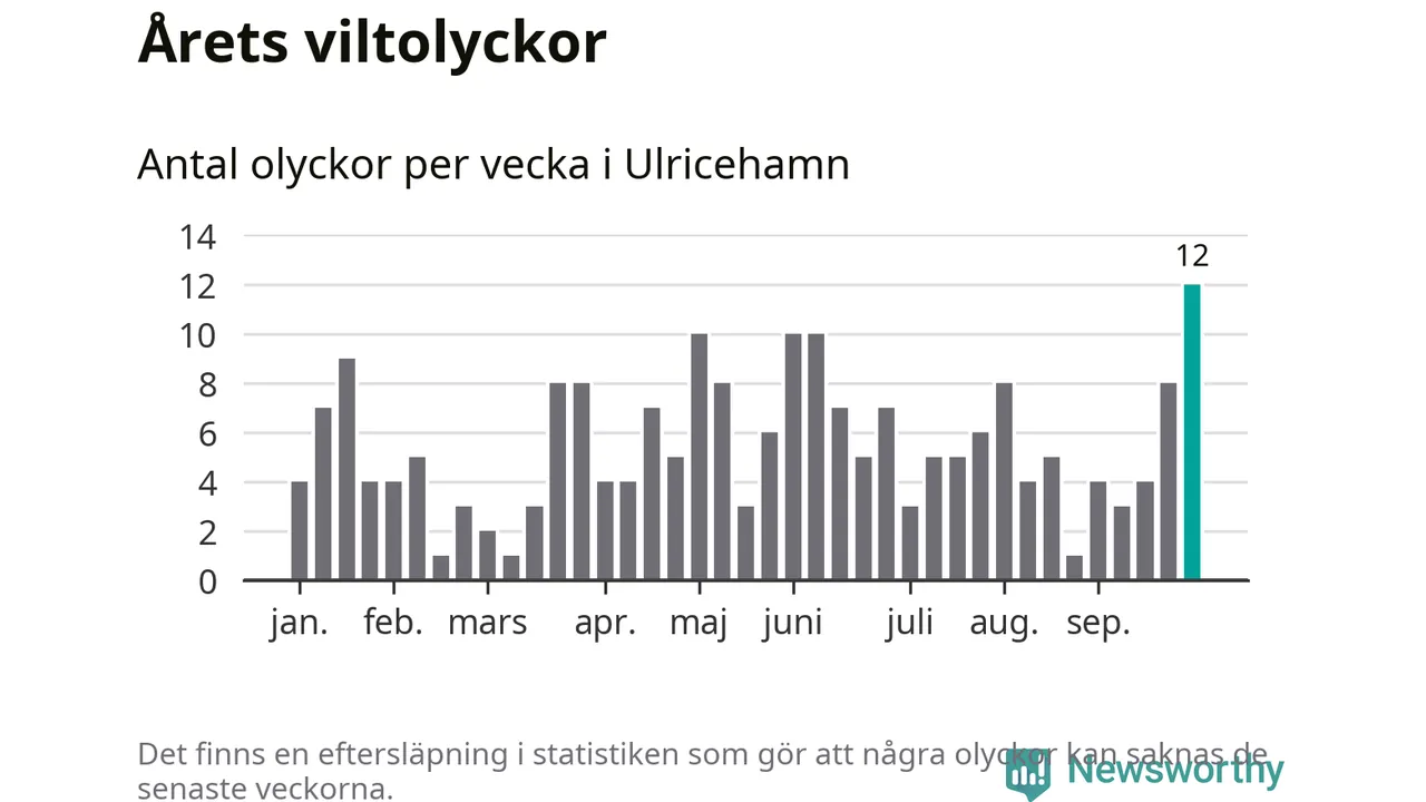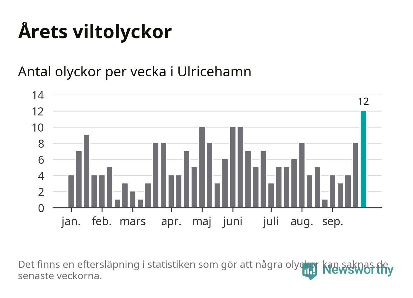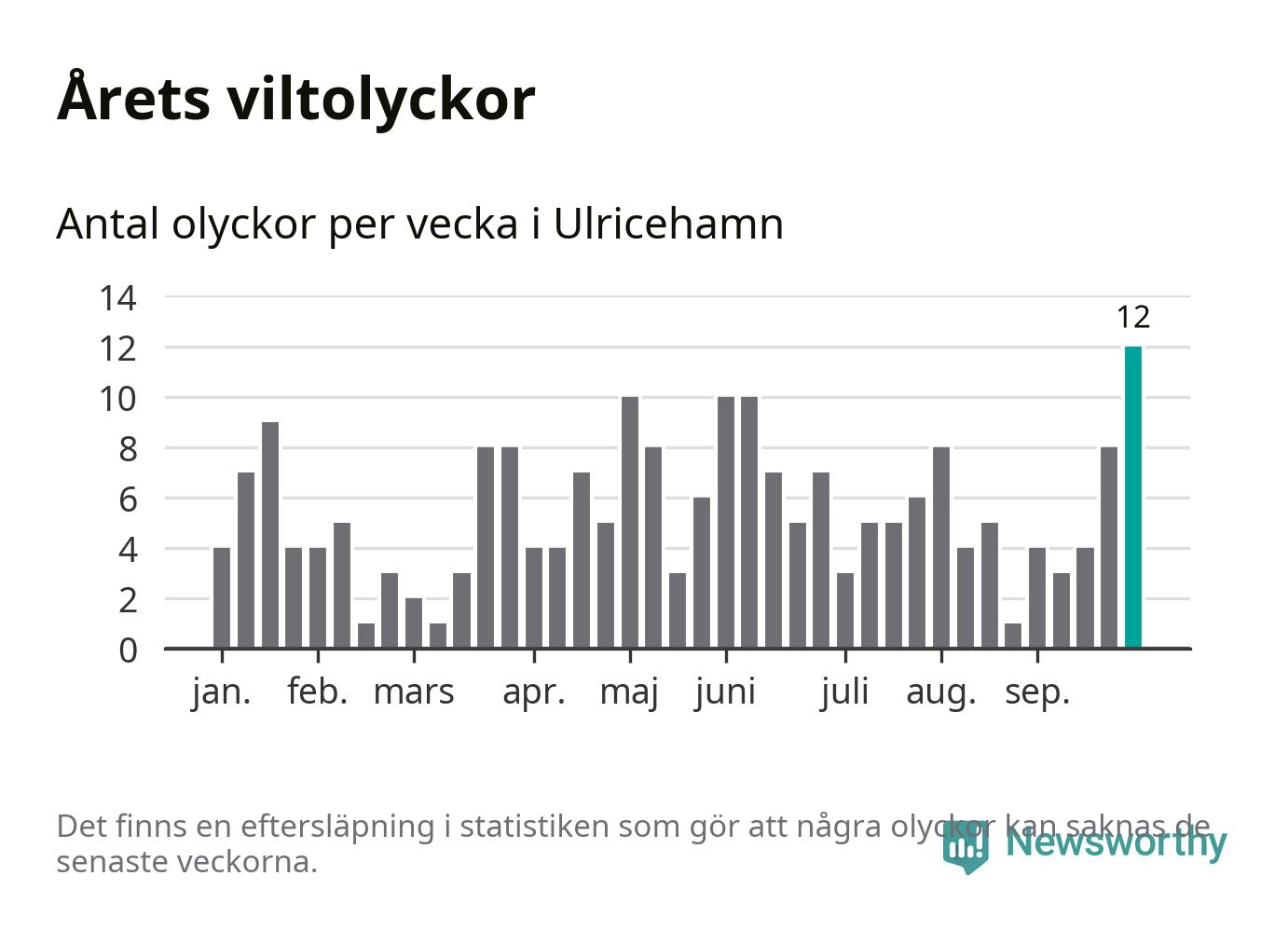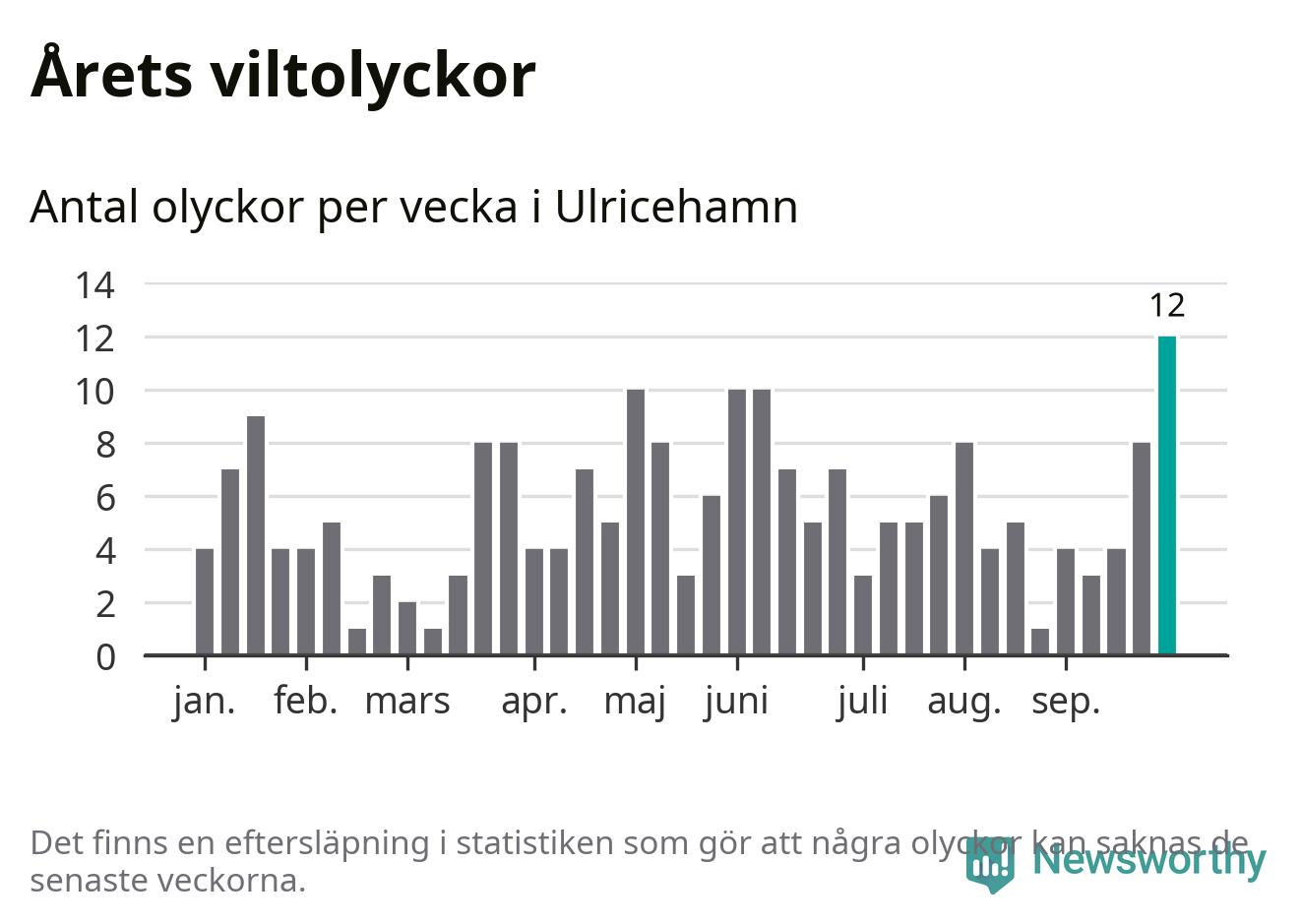 Under vecka 40 rapporterades tolv viltolyckor in i Ulricehamns kommun. Det är det största antalet på en enskild vecka hittills i år.