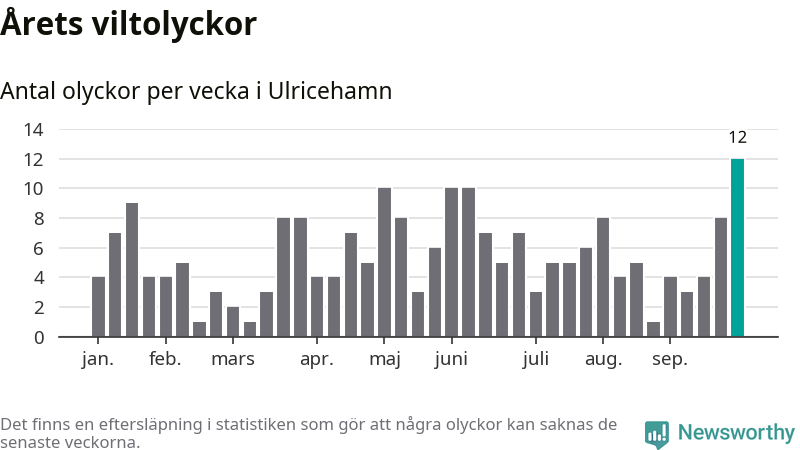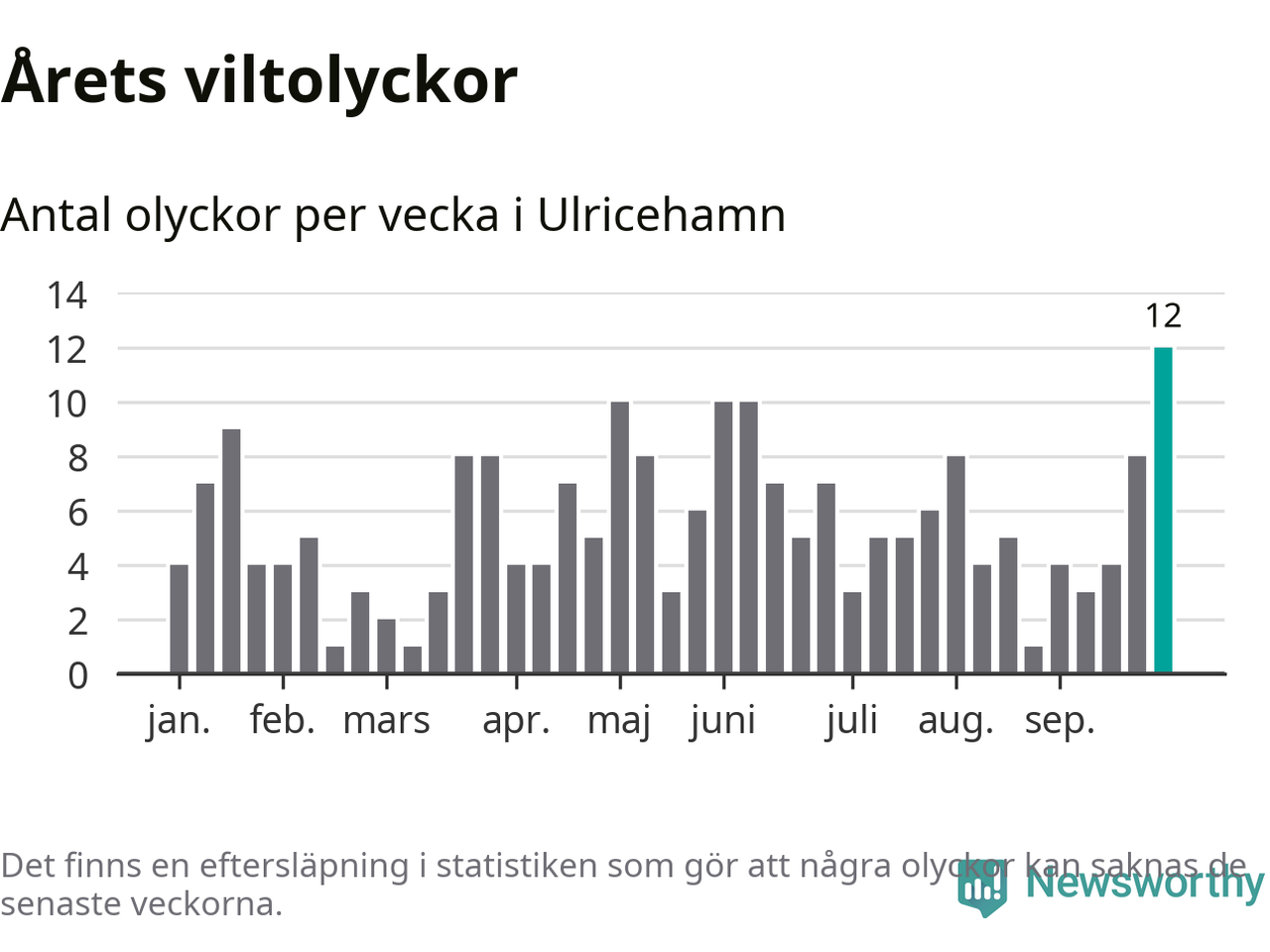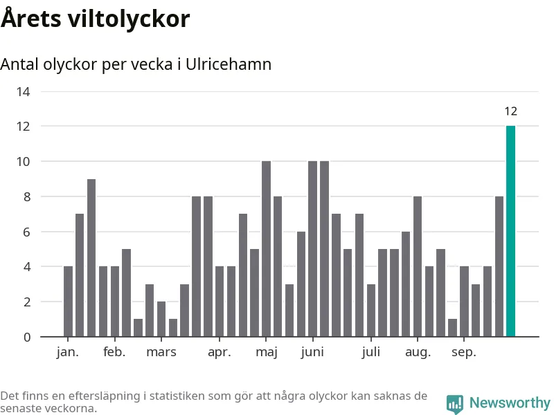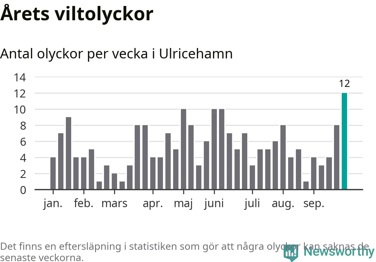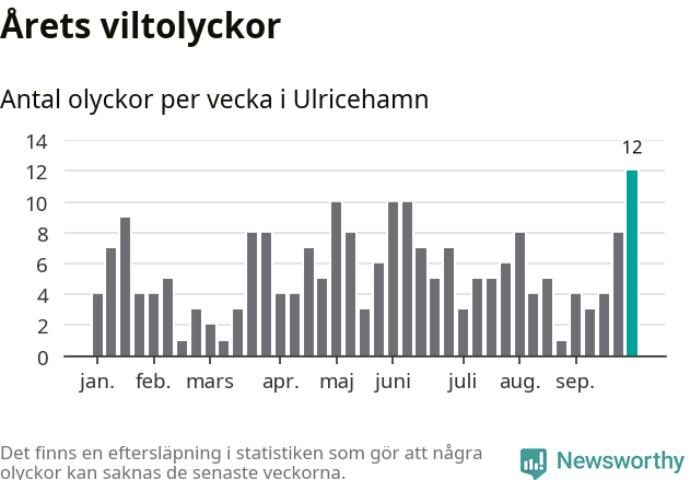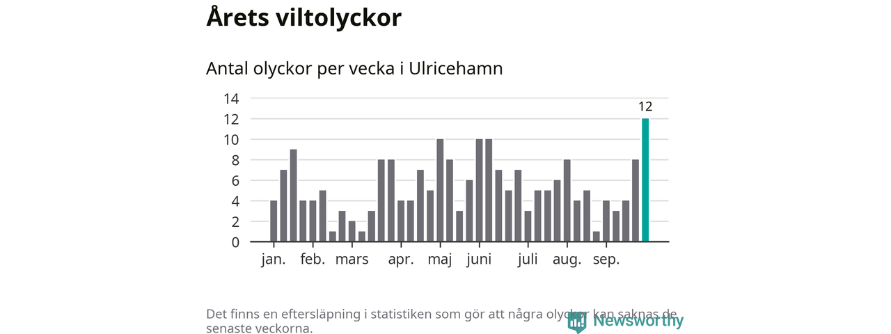 Under vecka 40 rapporterades tolv viltolyckor in i Ulricehamns kommun. Det är det största antalet på en enskild vecka hittills i år.