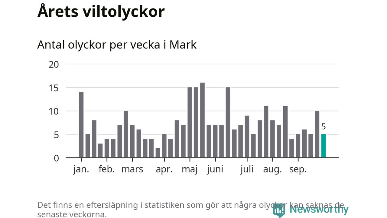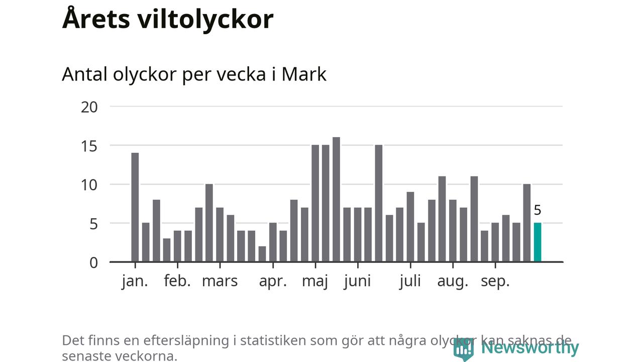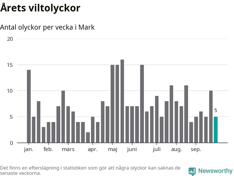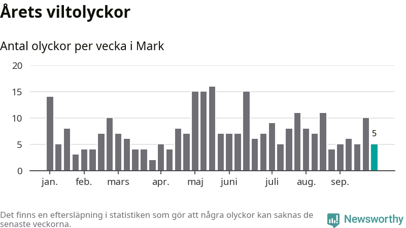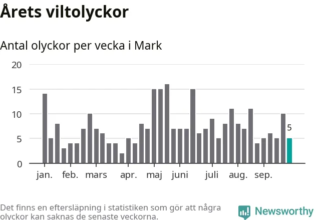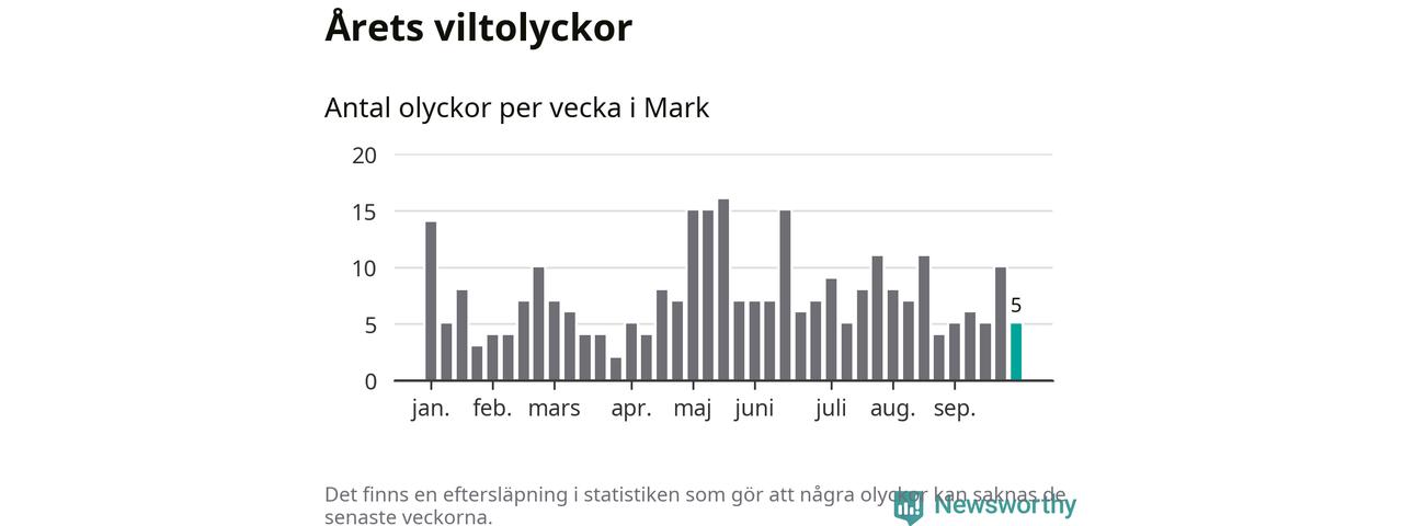 Hittills har fem viltolyckor rapporterats in i Marks kommun från vecka 40. Se listan här.