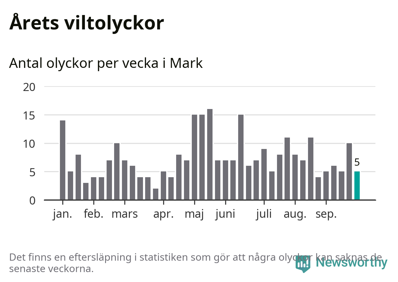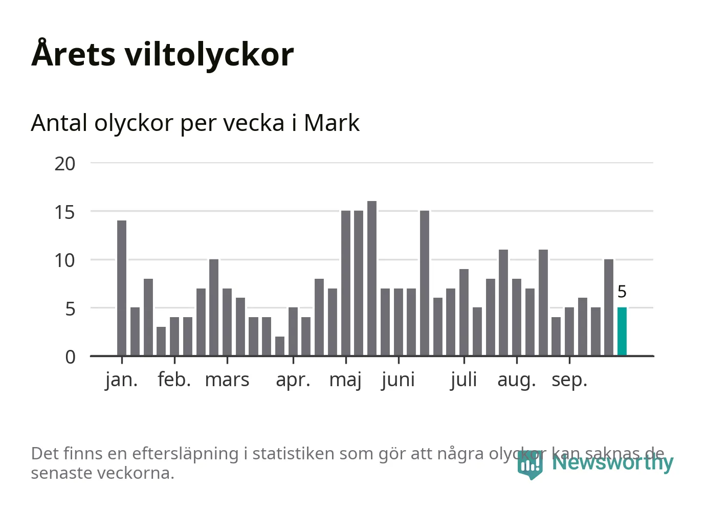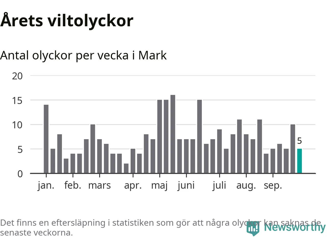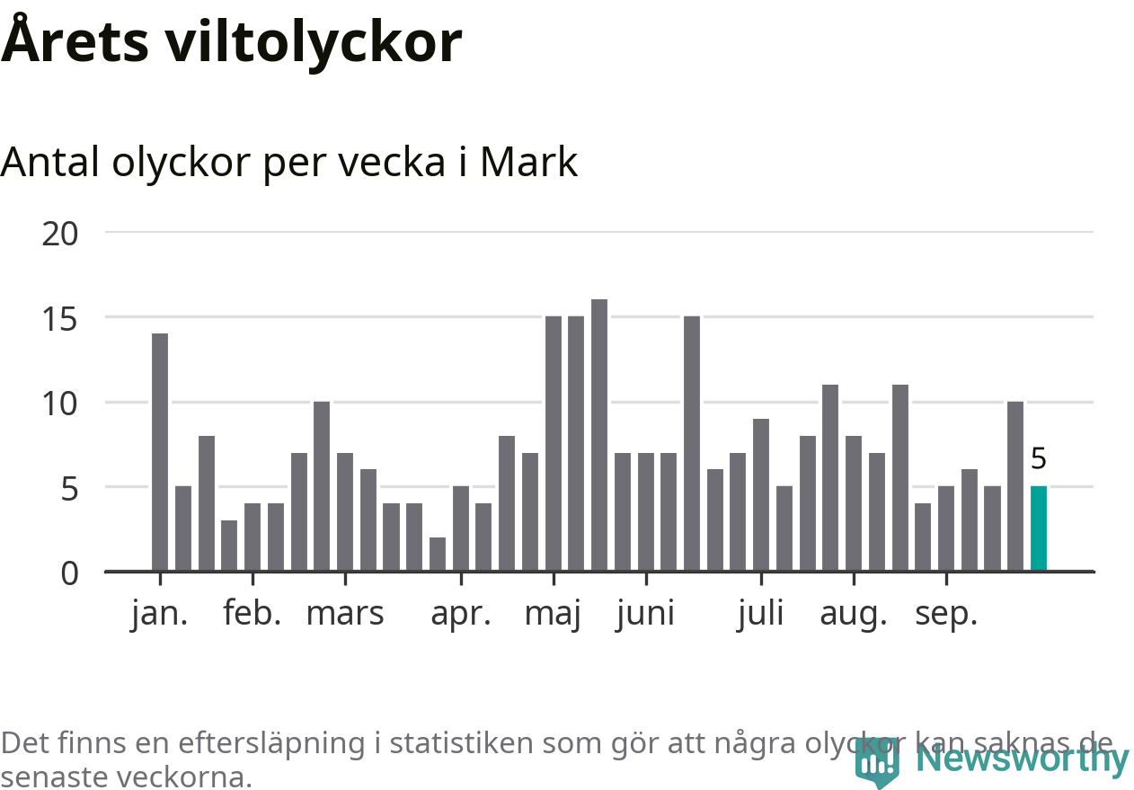 Hittills har fem viltolyckor rapporterats in i Marks kommun från vecka 40. Se listan här.