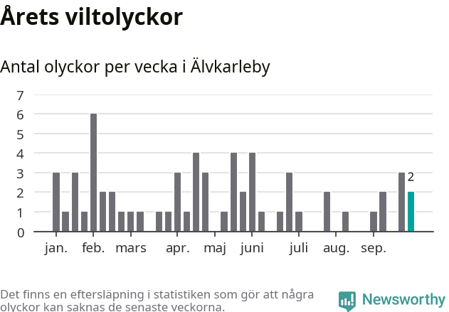 Hittills har två viltolyckor rapporterats in i Älvkarleby kommun från vecka 40. Se listan här.