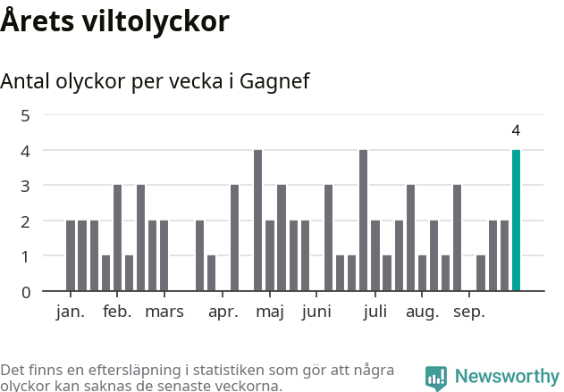 Hittills har fyra viltolyckor rapporterats in i Gagnefs kommun från vecka 40. Se listan här.