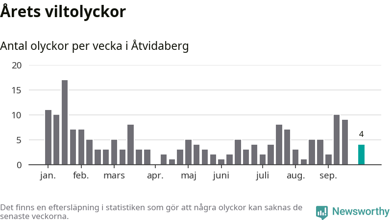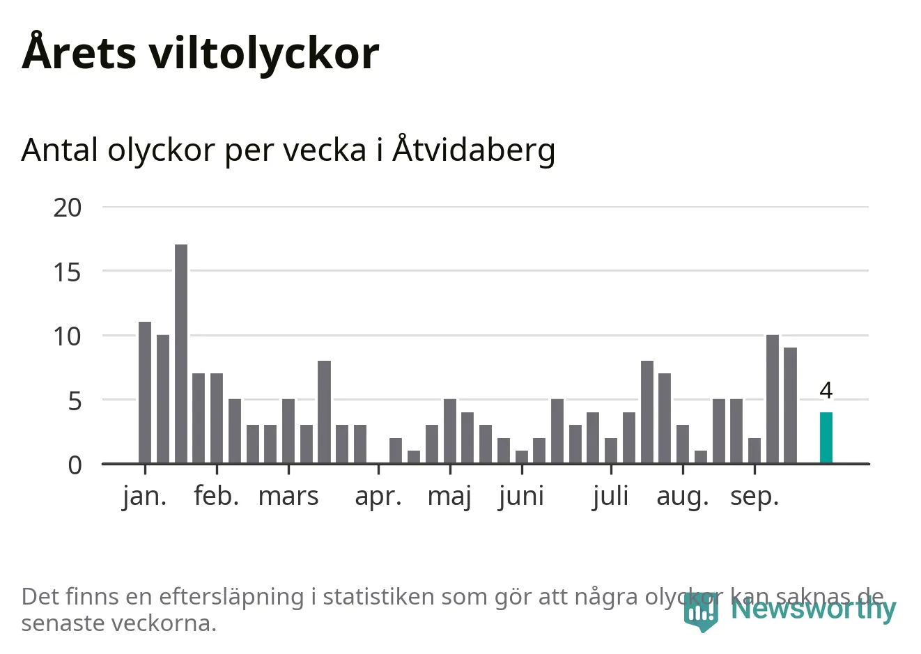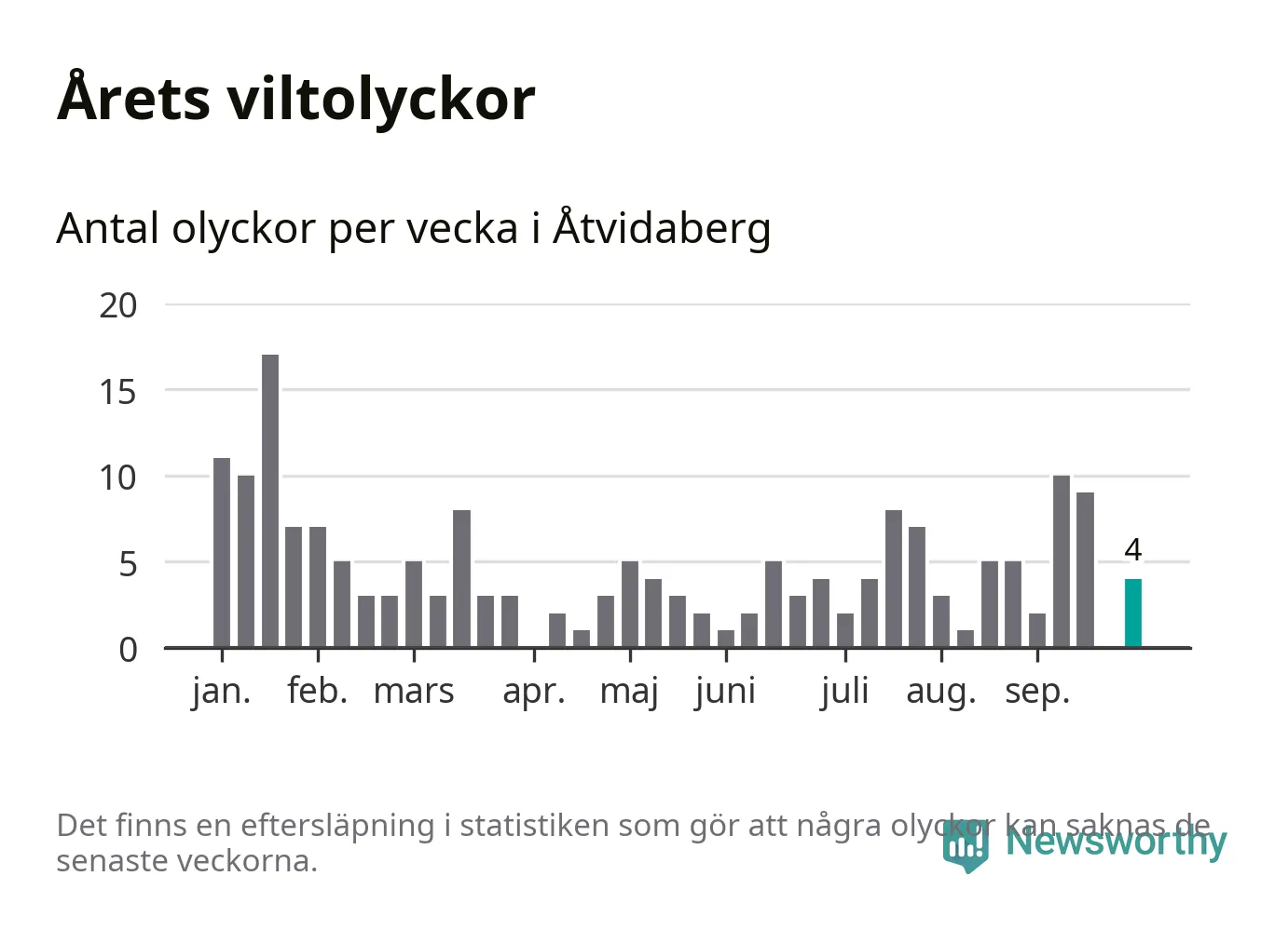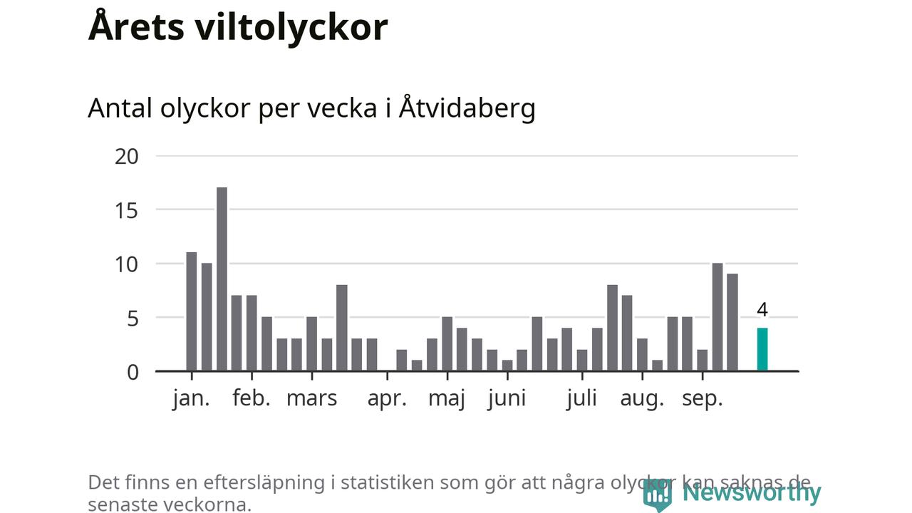 Hittills har fyra viltolyckor rapporterats in i Åtvidabergs kommun från vecka 40. Se listan här.
