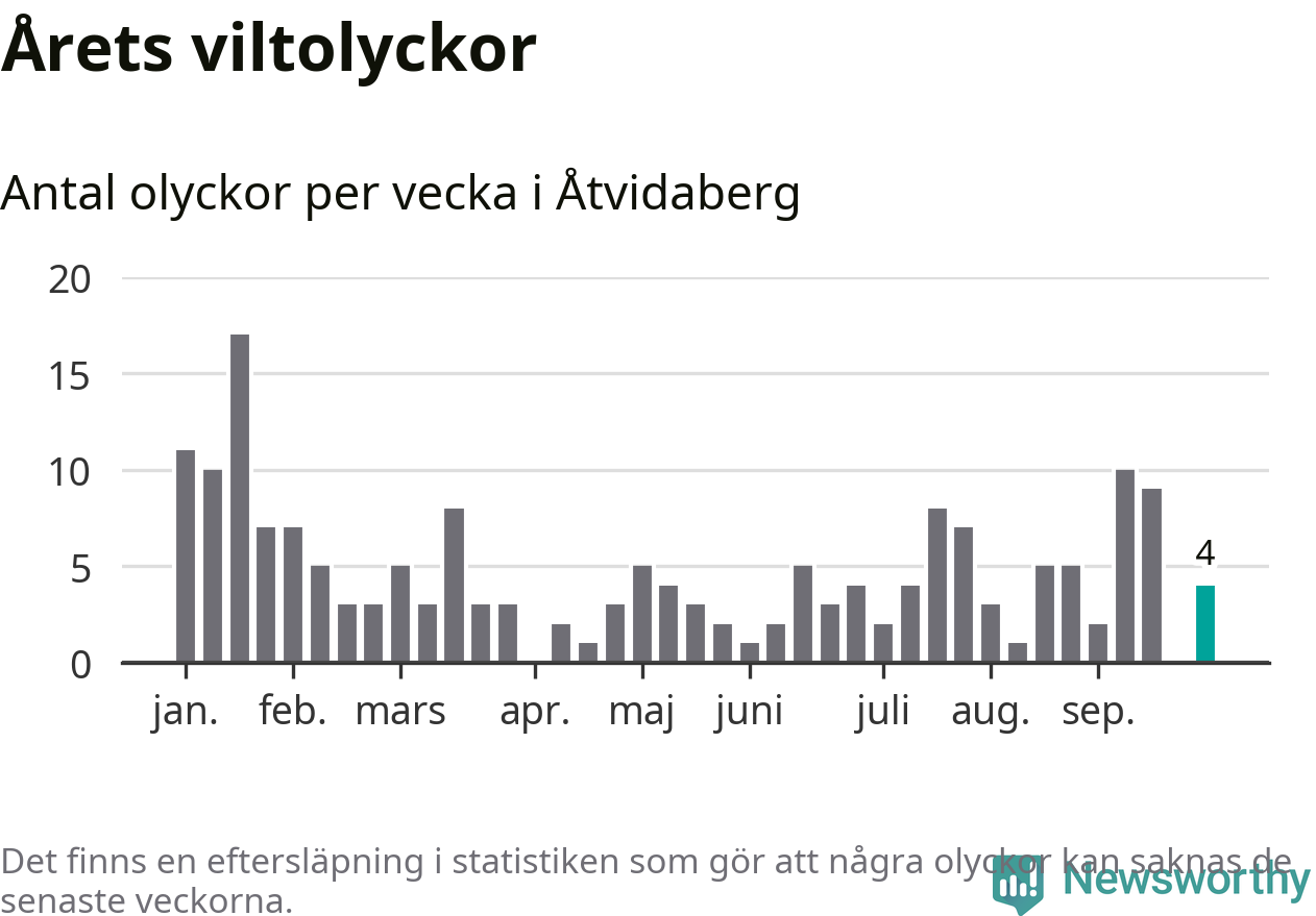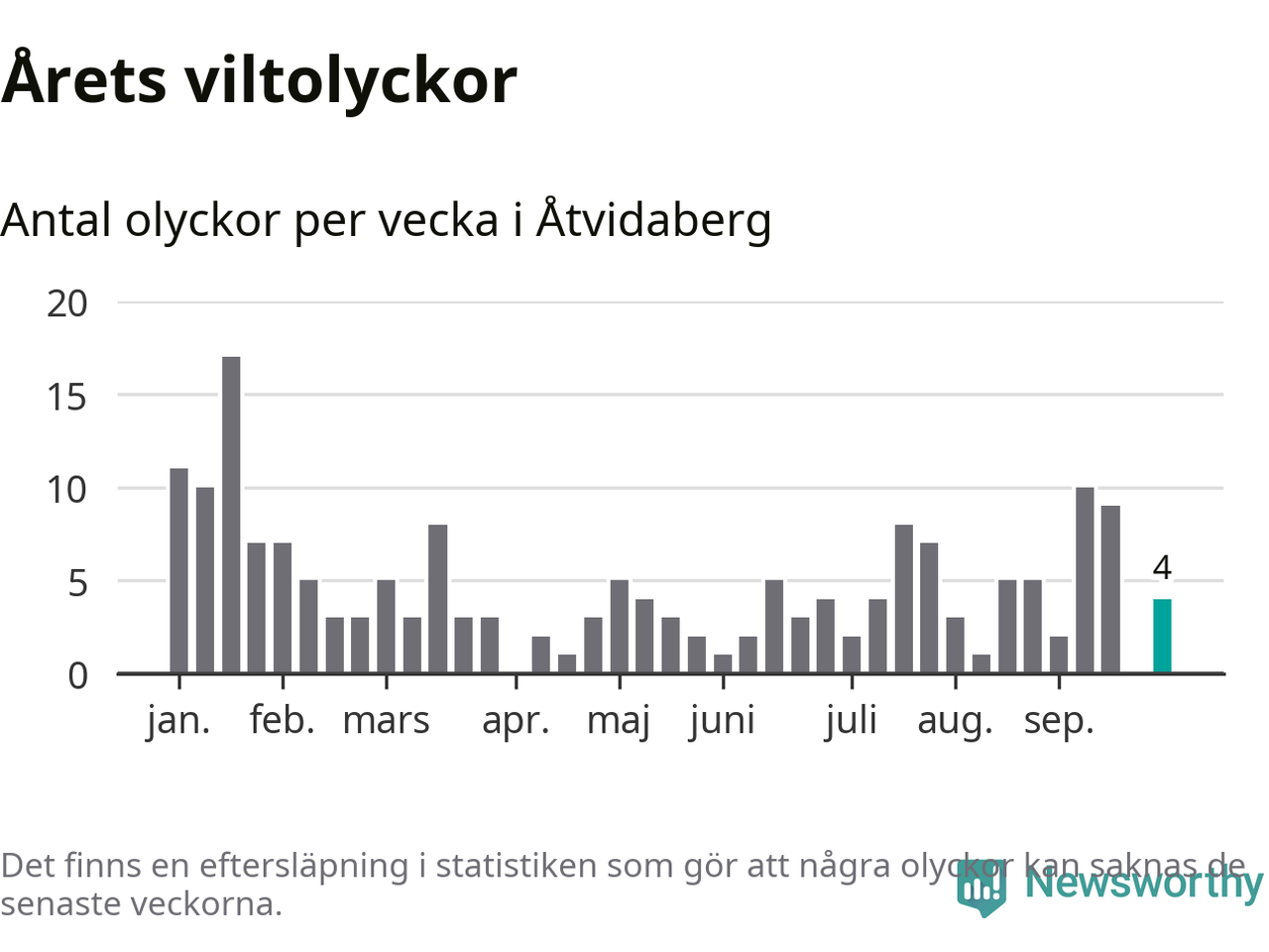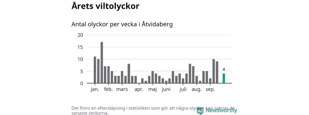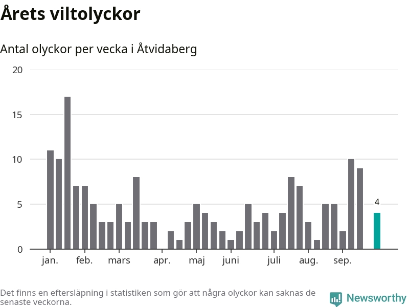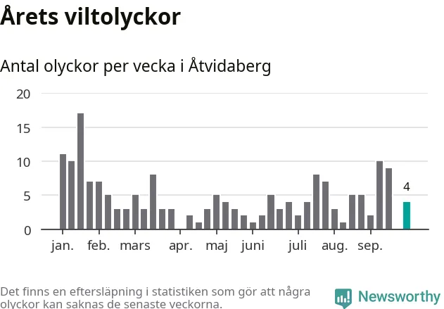 Hittills har fyra viltolyckor rapporterats in i Åtvidabergs kommun från vecka 40. Se listan här.
