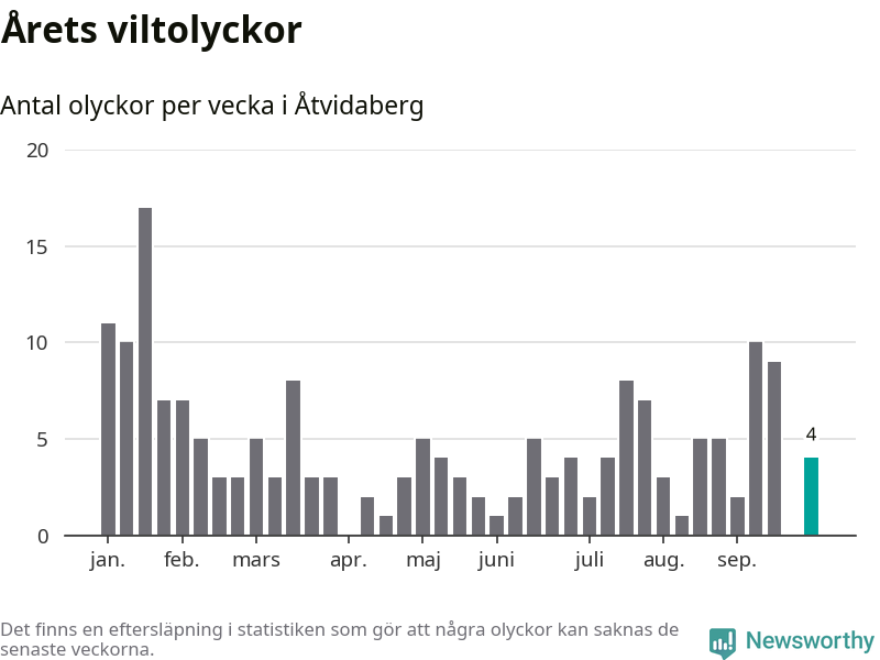Totalt det här året har det inträffat 185 viltolyckor i kommunen. Det är mindre än genomsnittet för motsvarande period (omkring 222) de senaste tio åren.