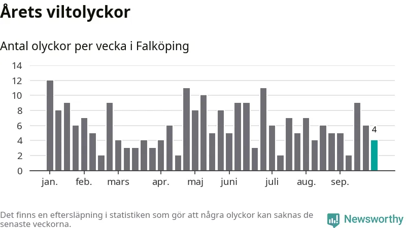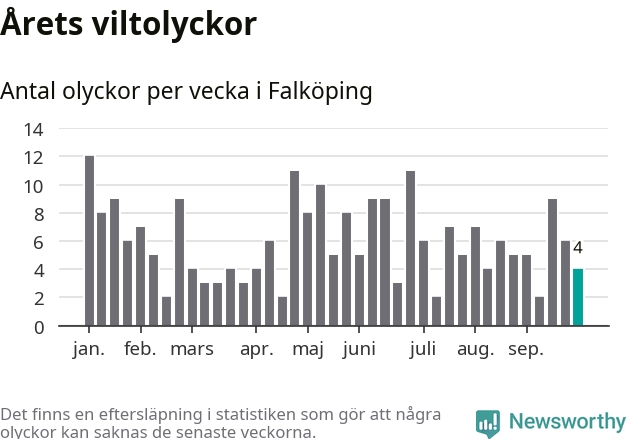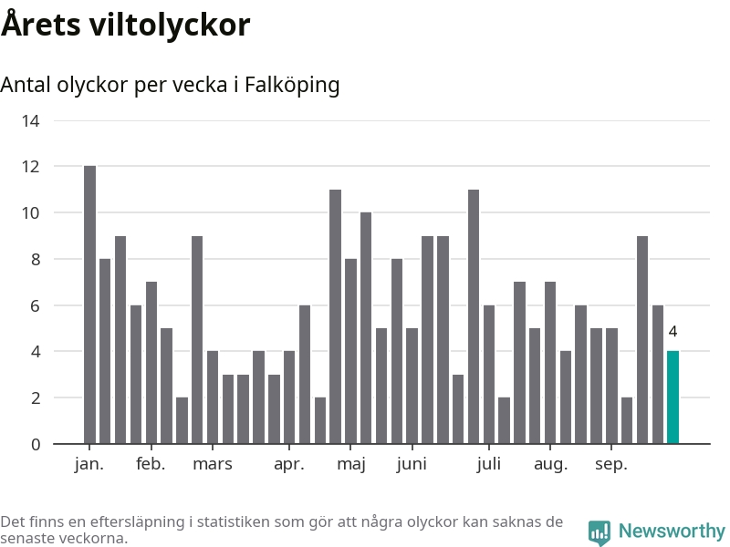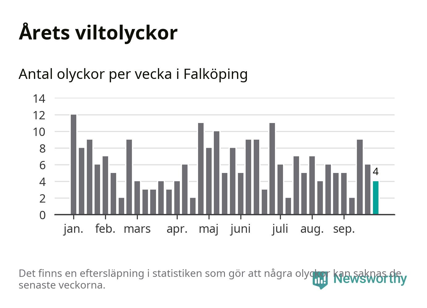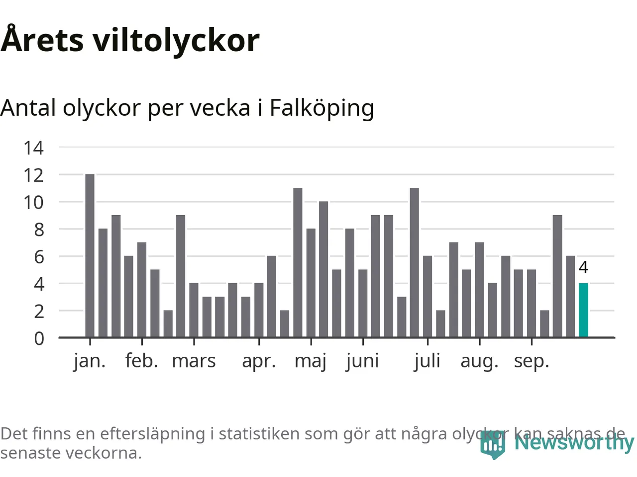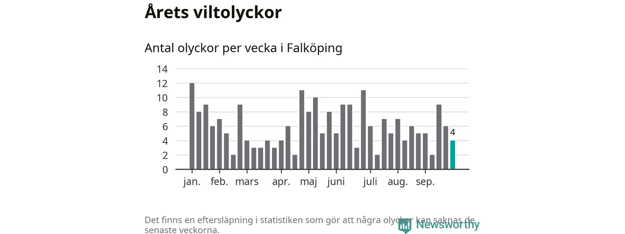 Hittills har fyra viltolyckor rapporterats in i Falköpings kommun från vecka 40. Se listan här.