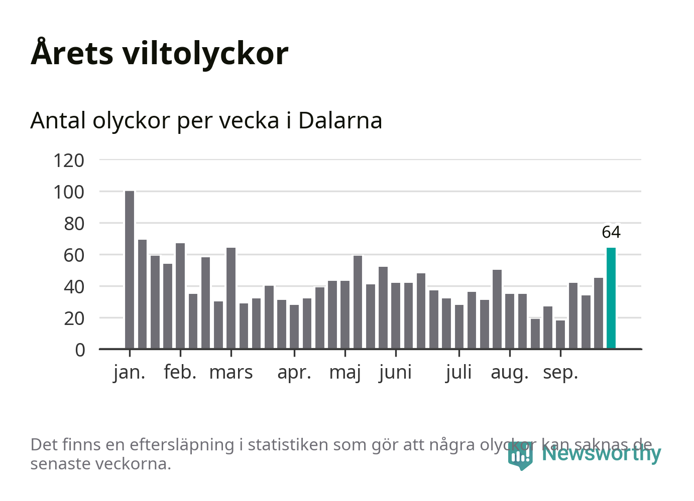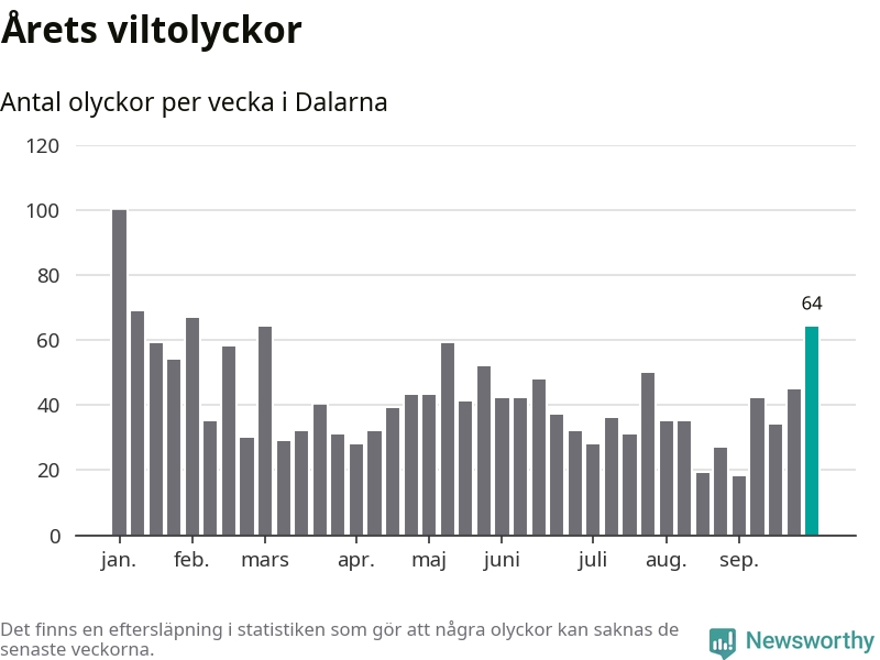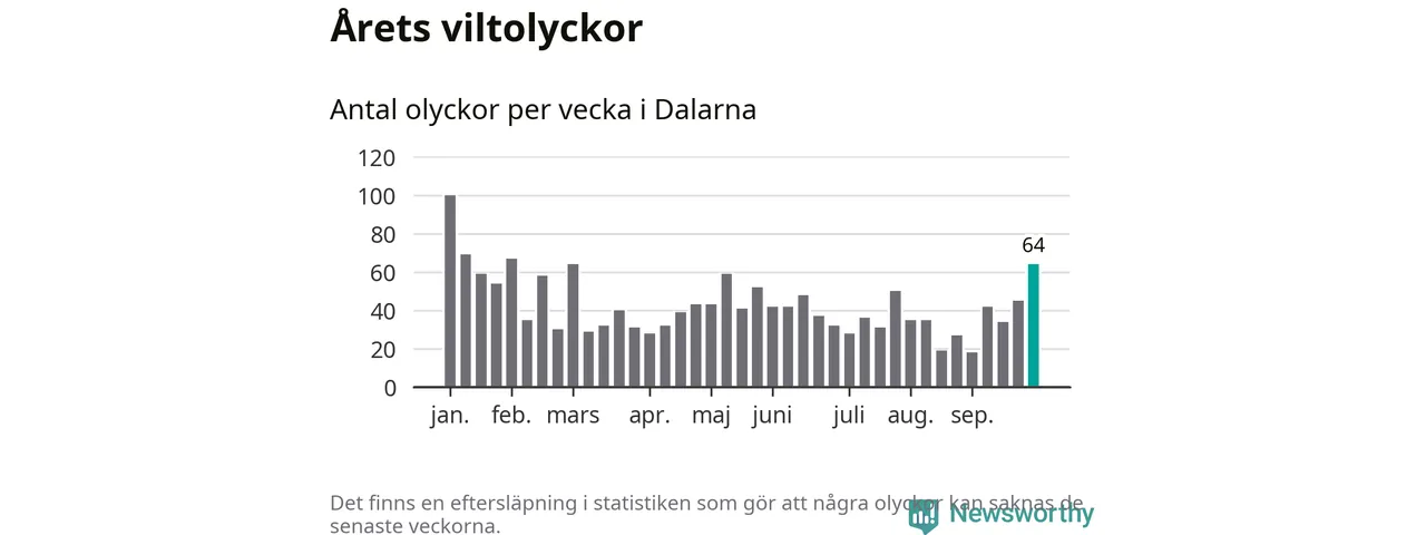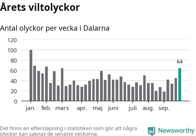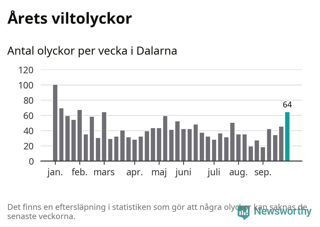Hittills har 64 viltolyckor rapporterats in i Dalarnas län från vecka 40. Se listan här.