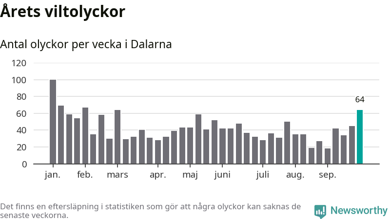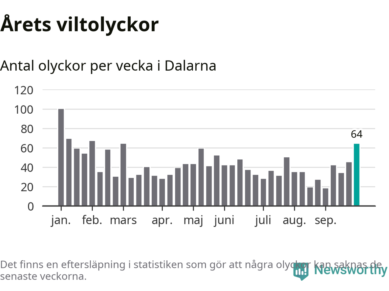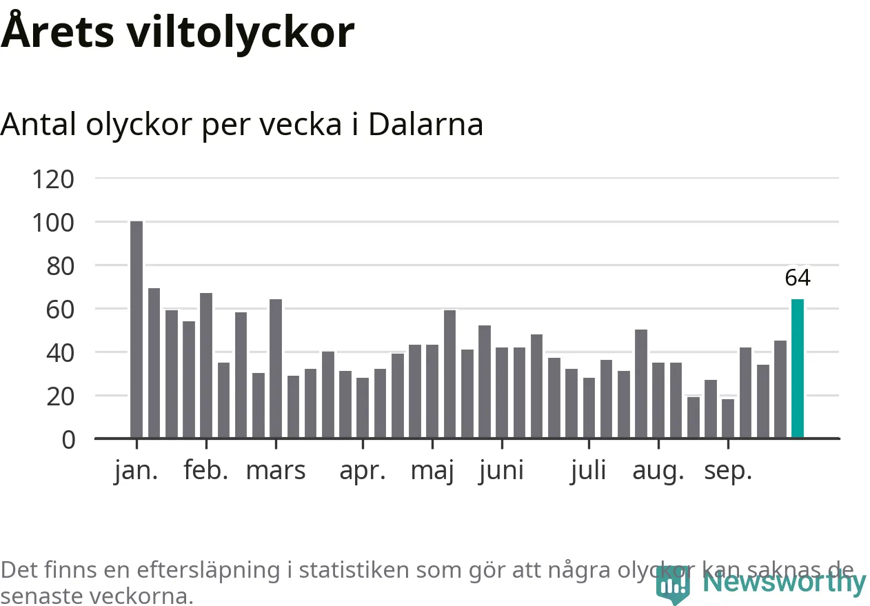 Hittills har 64 viltolyckor rapporterats in i Dalarnas län från vecka 40. Se listan här.