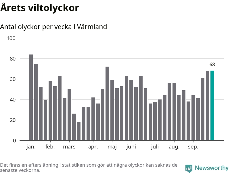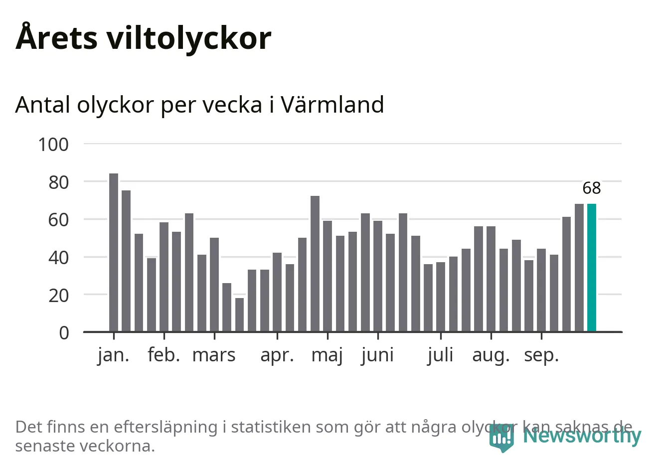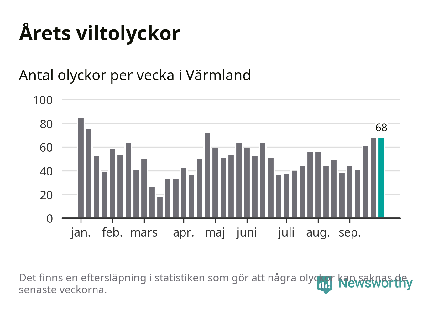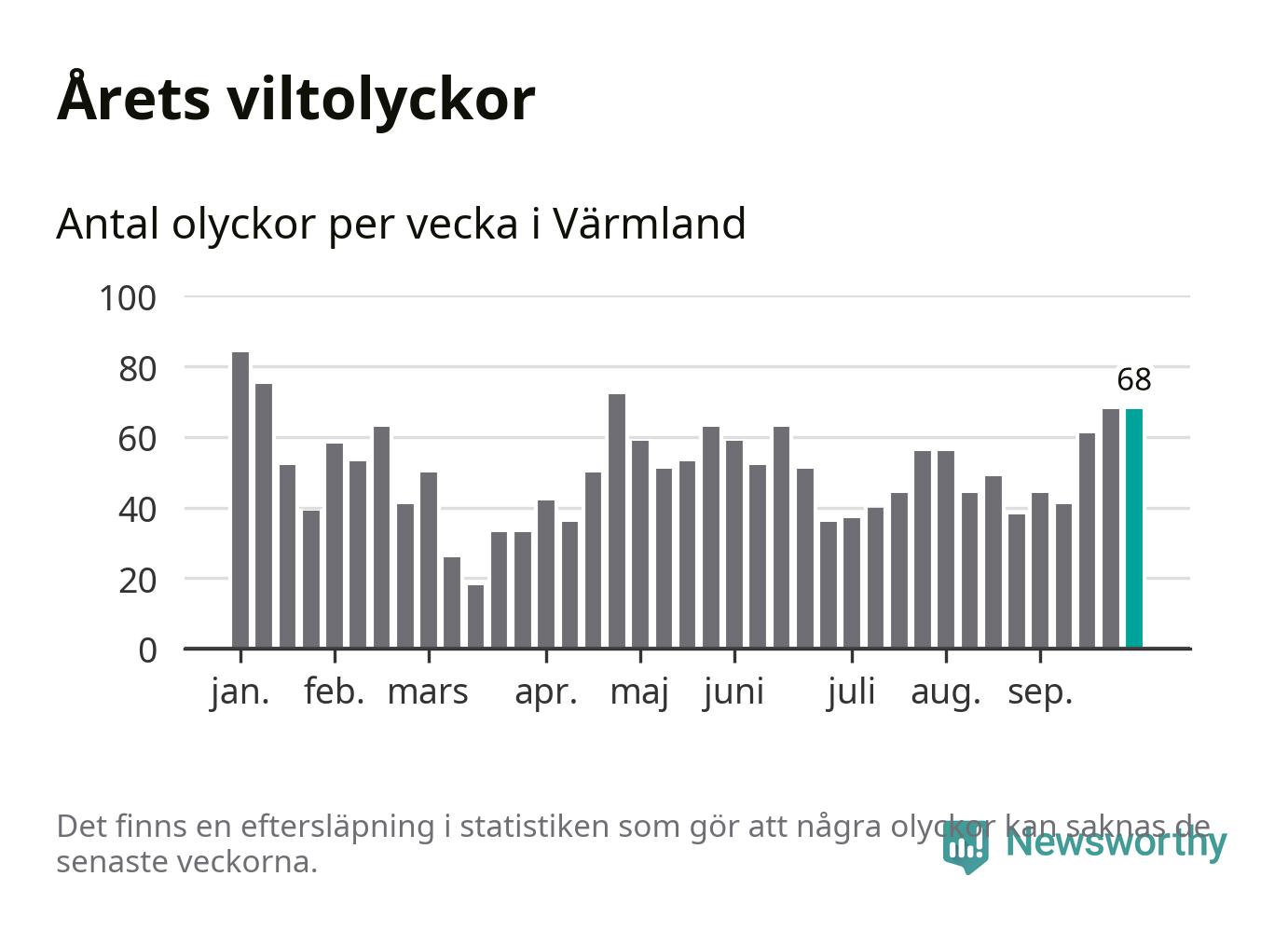 Hittills har 68 viltolyckor rapporterats in i Värmlands län från vecka 40. Se listan här.