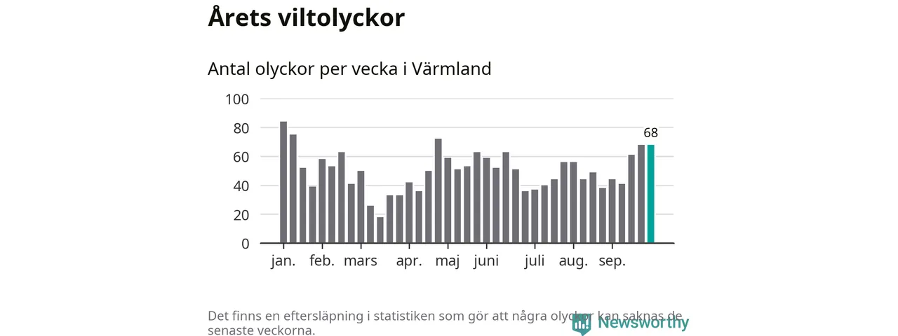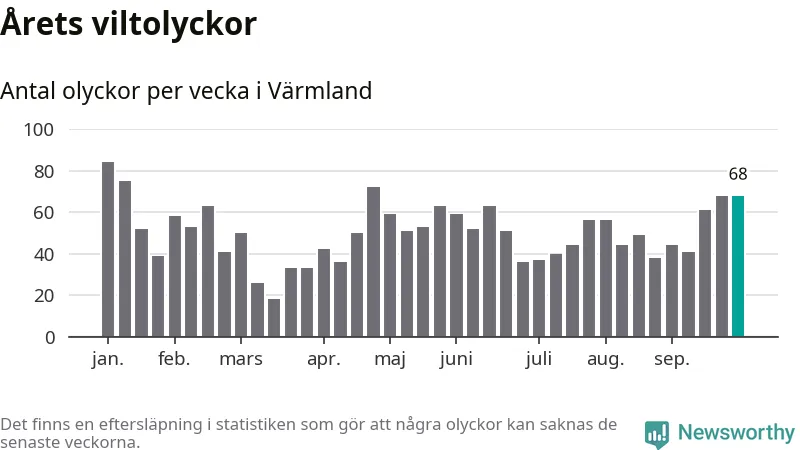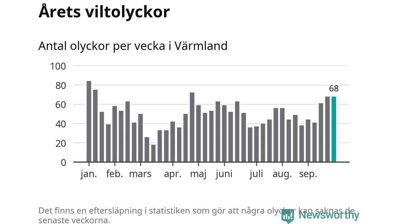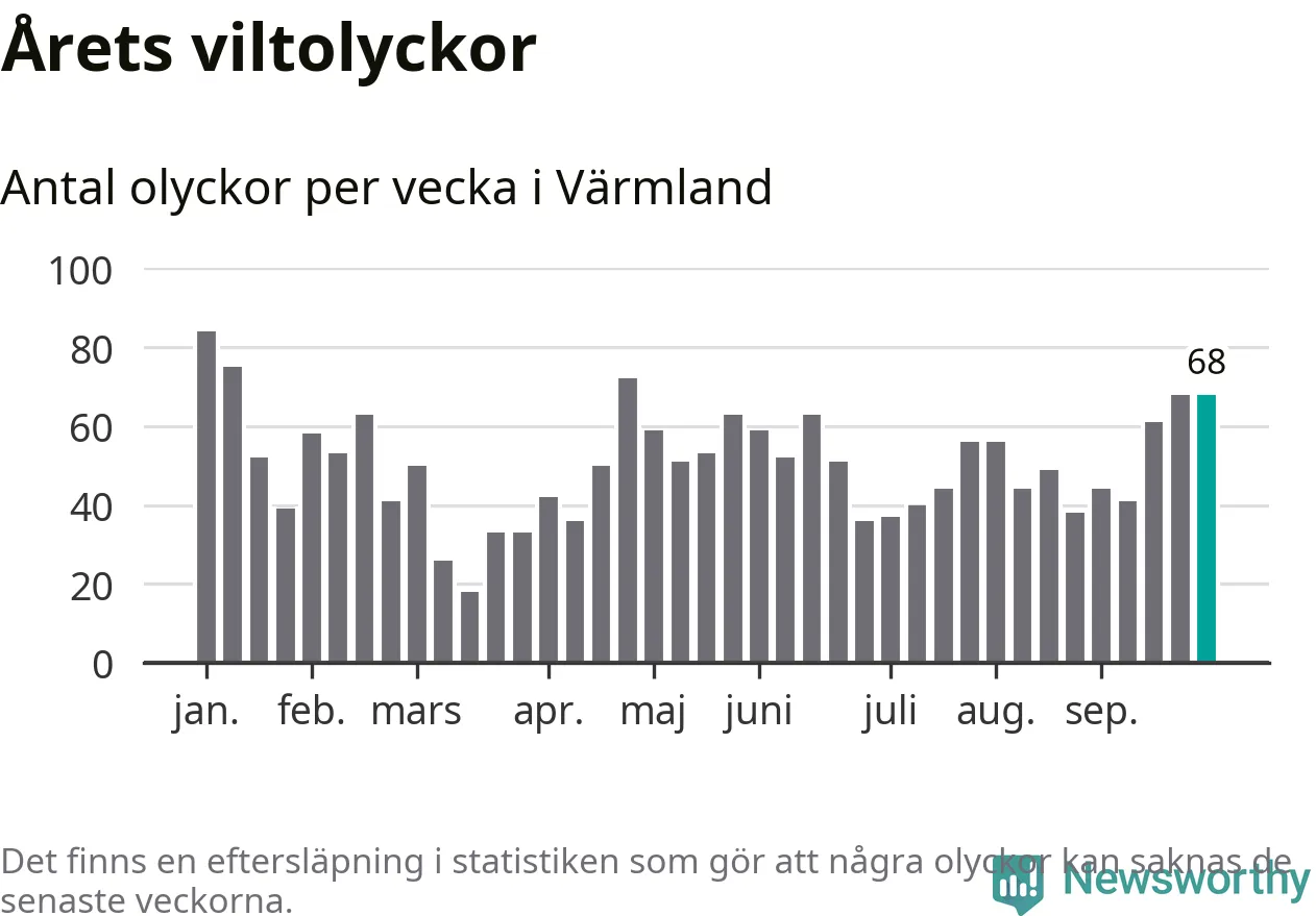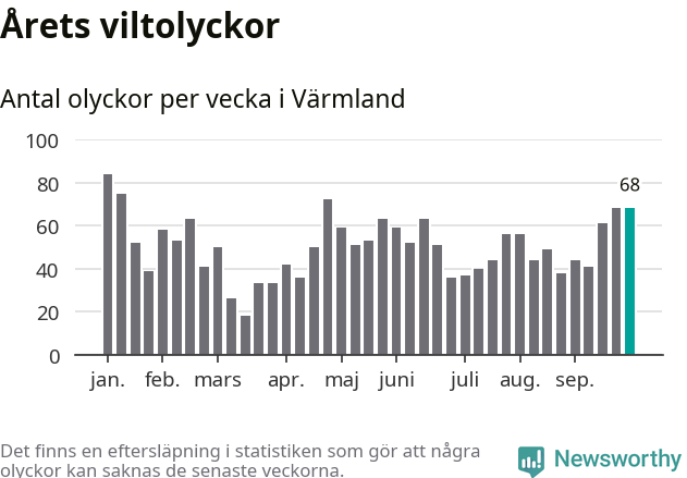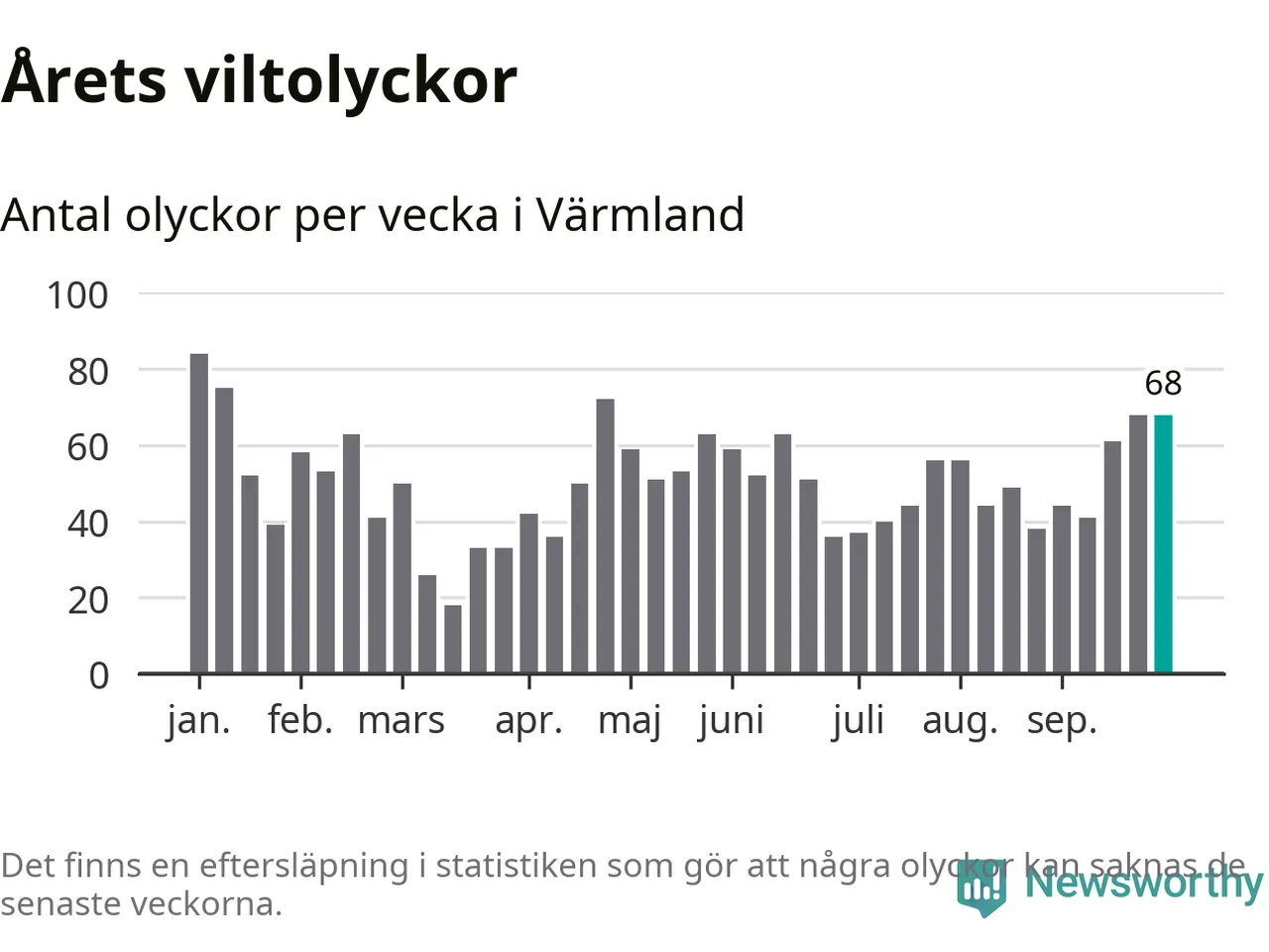 Hittills har 68 viltolyckor rapporterats in i Värmlands län från vecka 40. Se listan här.