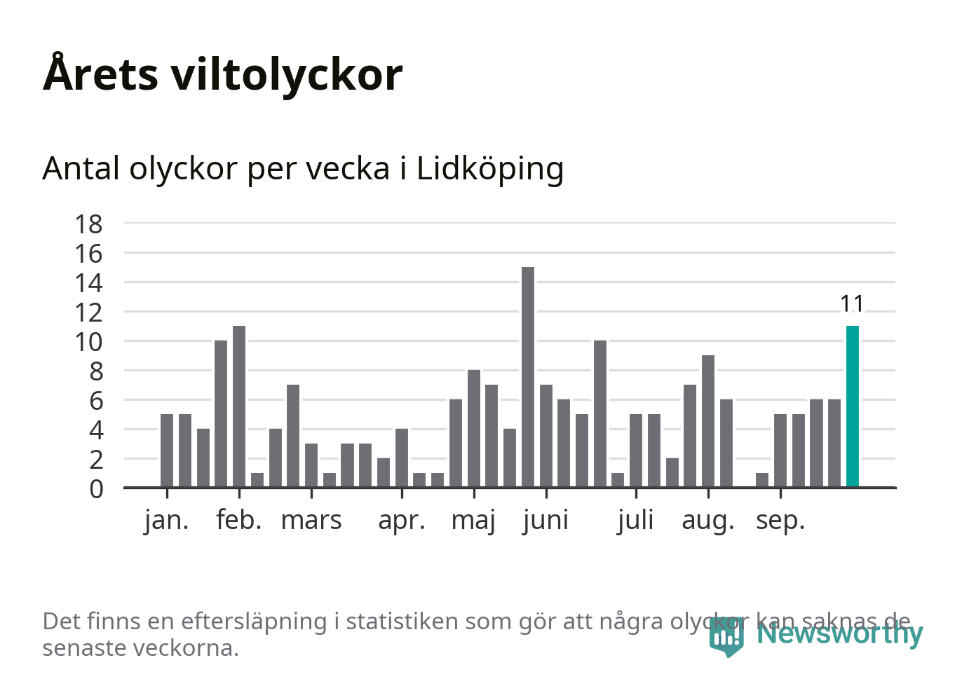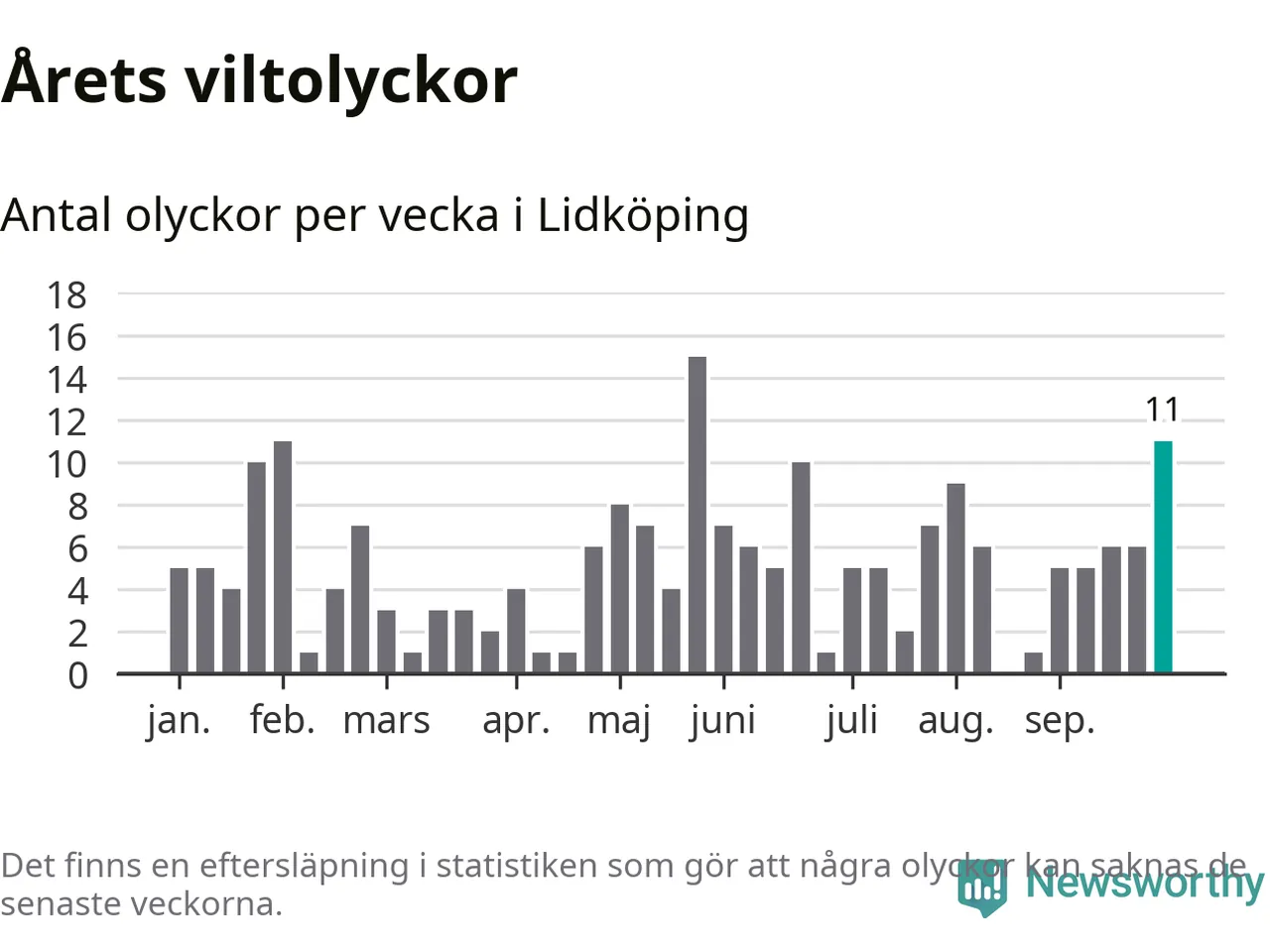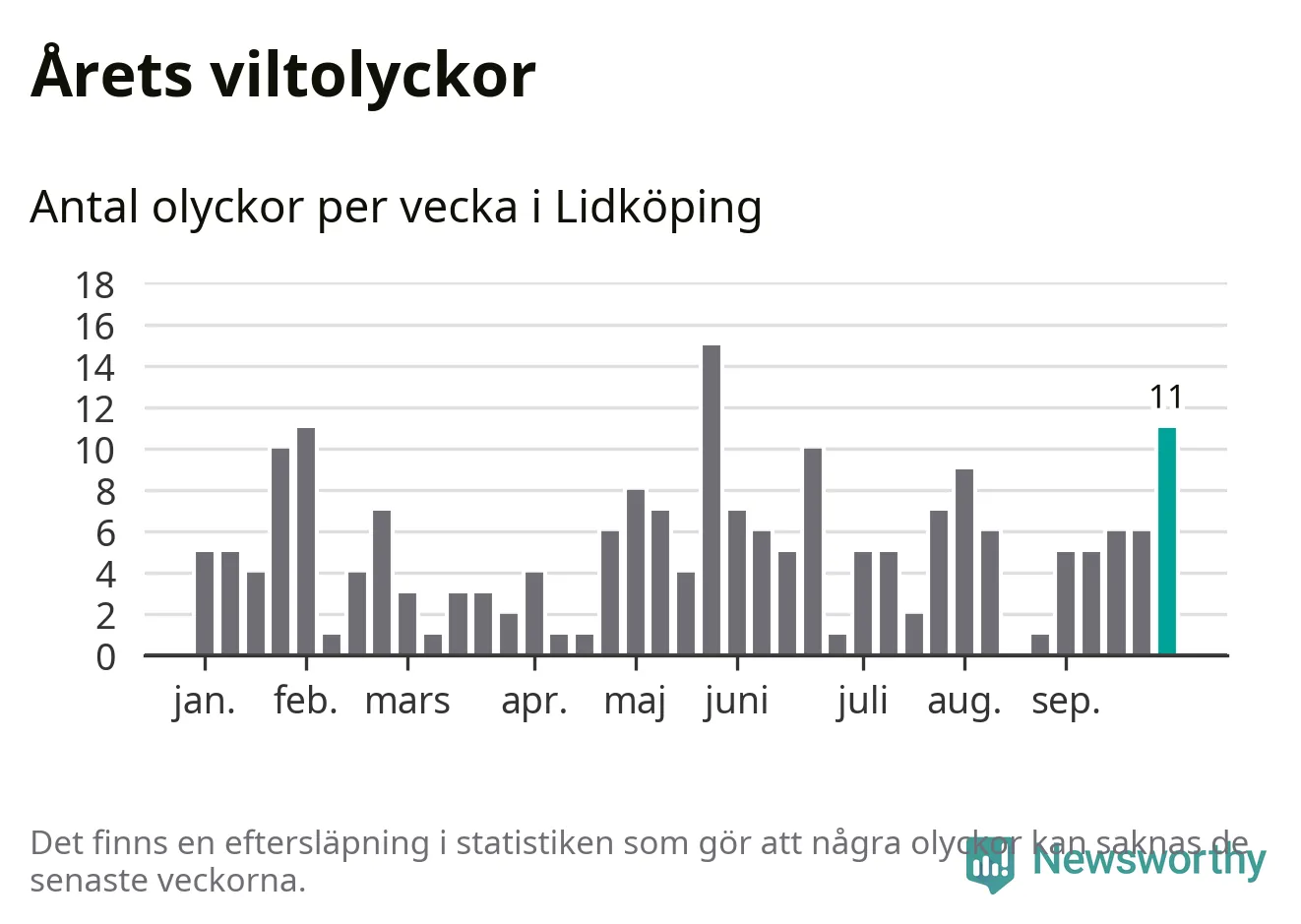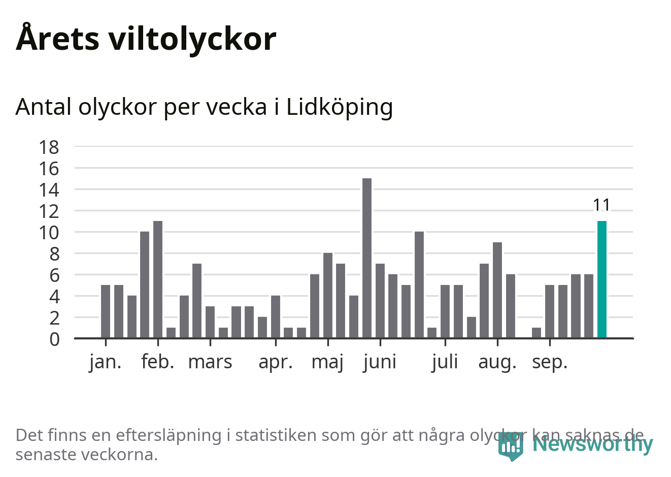 205 viltolyckor i kommunen. Det är mer än genomsnittet för motsvarande period (omkring 157) de senaste tio åren.
