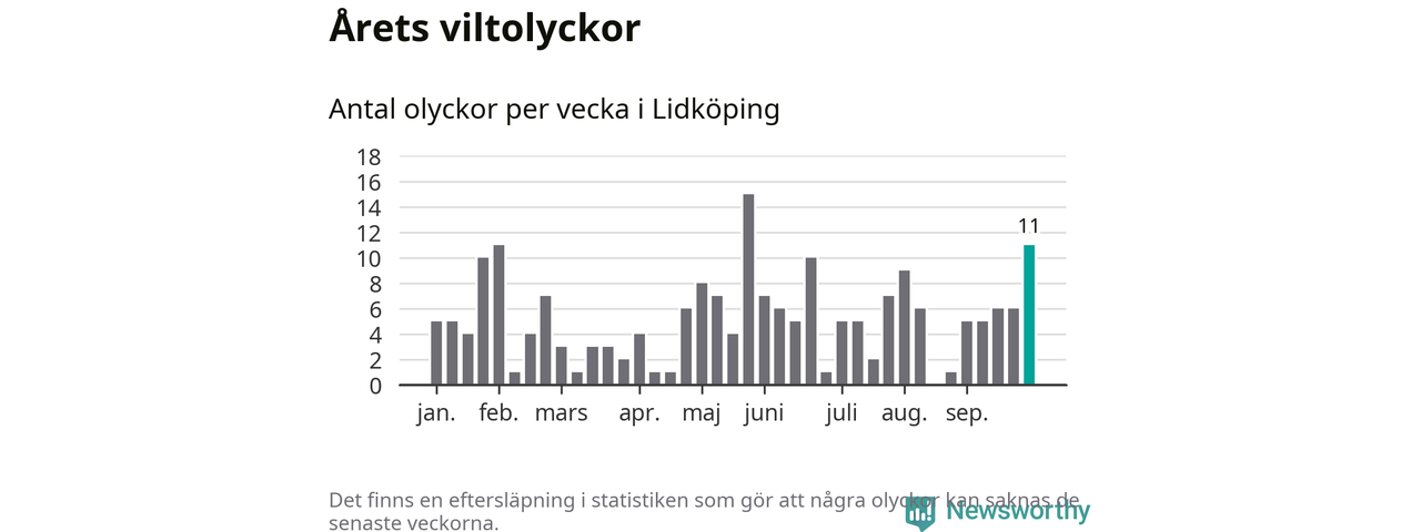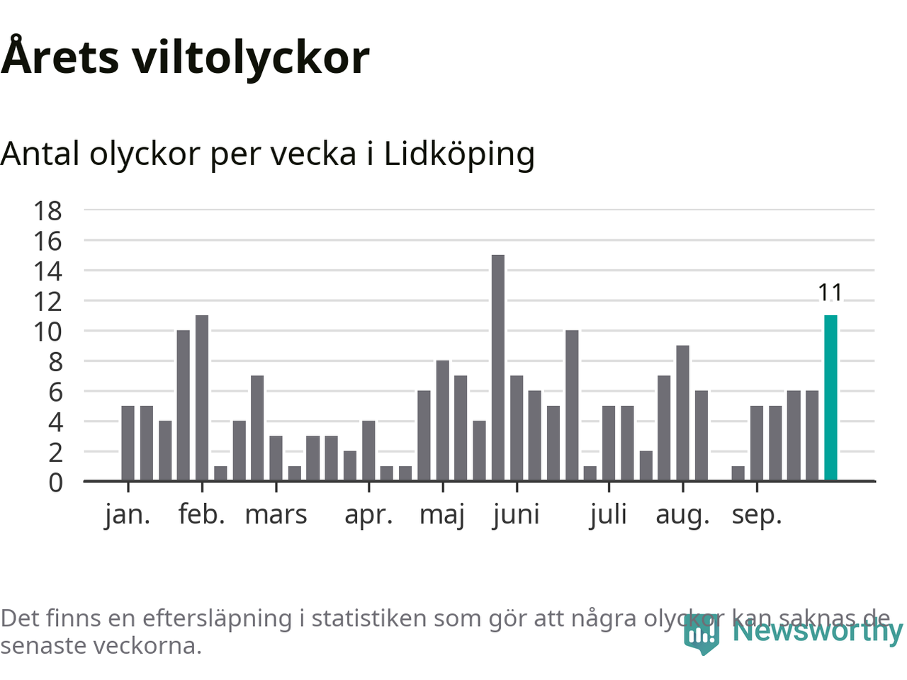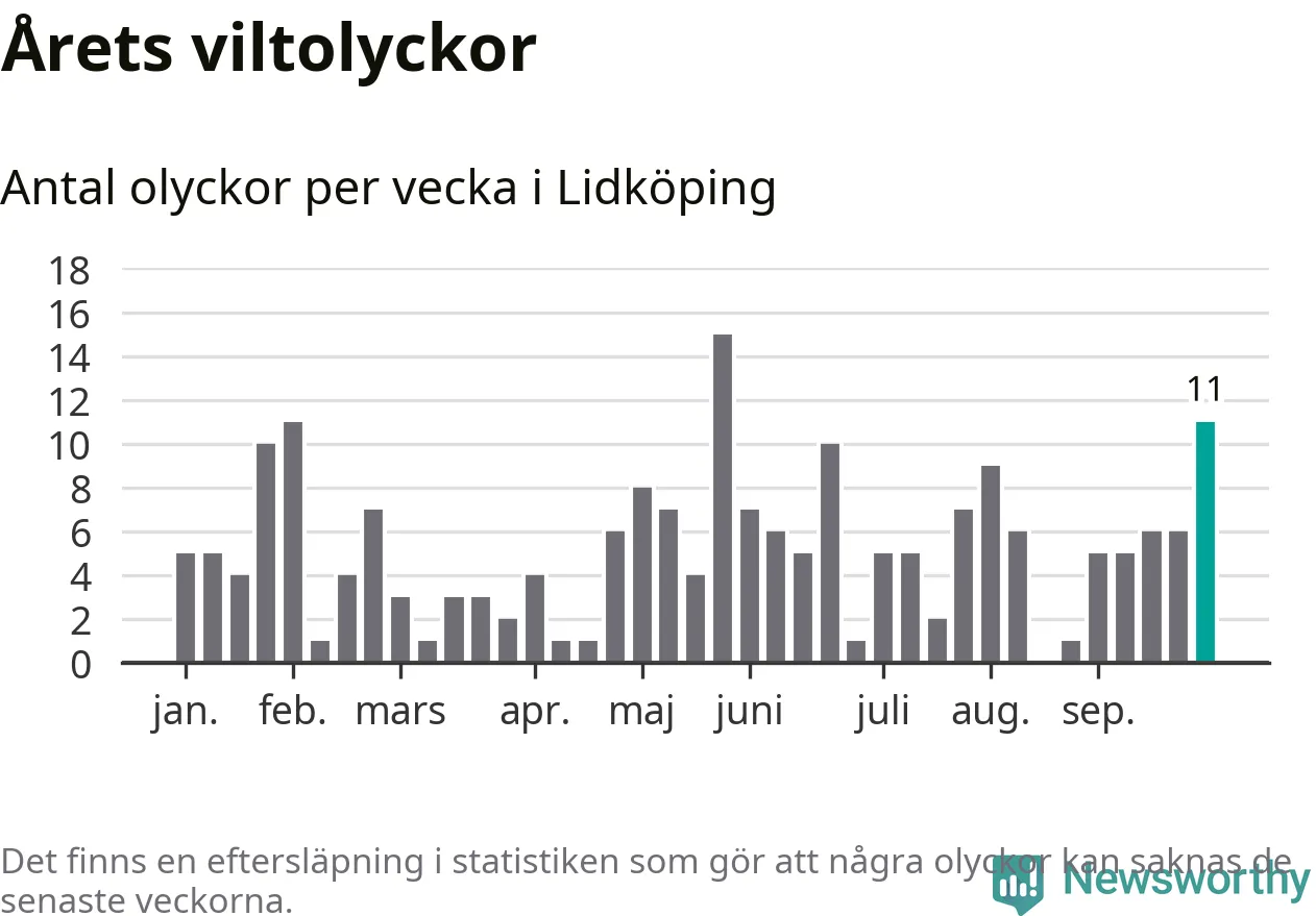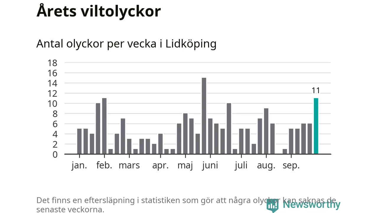 205 viltolyckor i kommunen. Det är mer än genomsnittet för motsvarande period (omkring 157) de senaste tio åren.