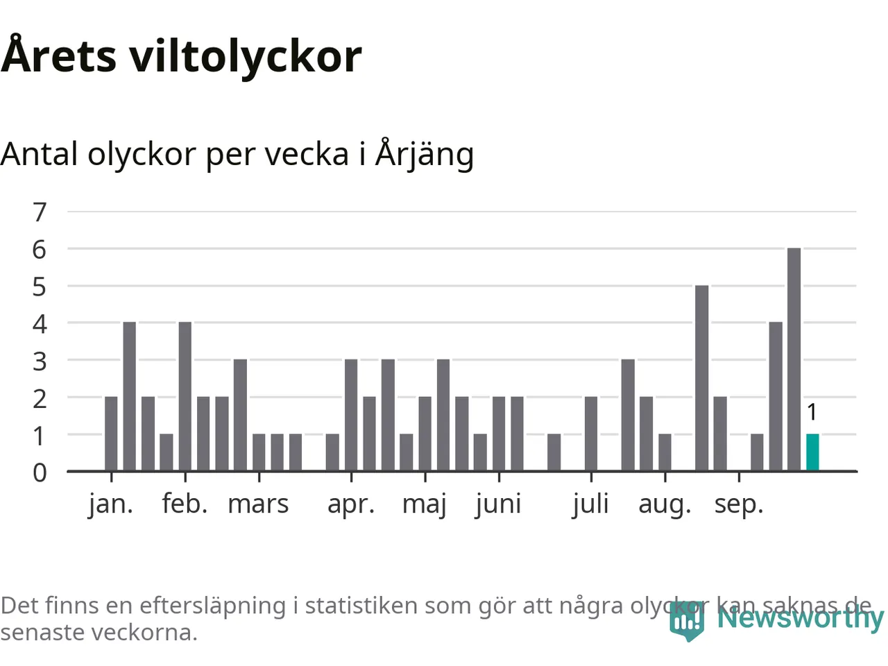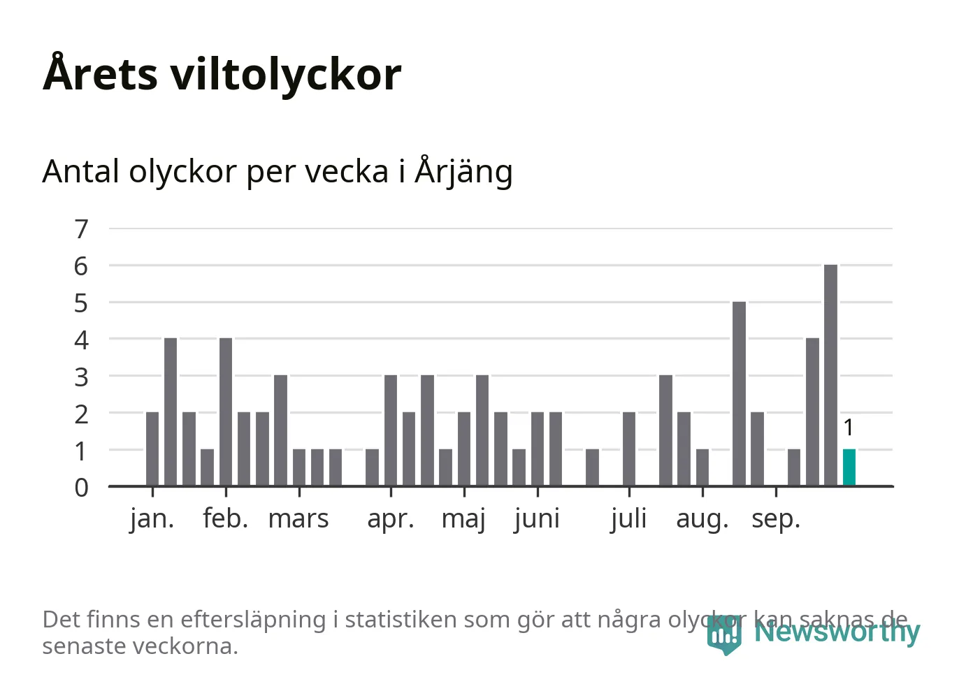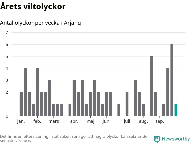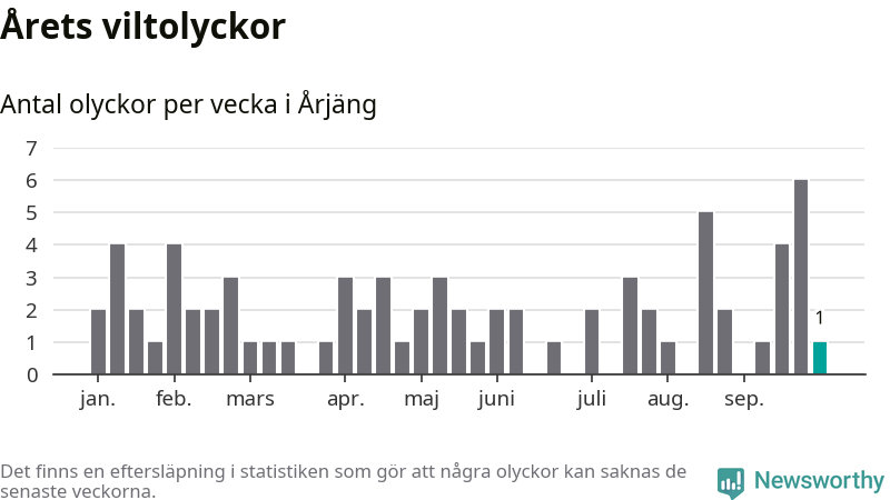Totalt det här året har det inträffat 74 viltolyckor i kommunen. Det är mindre än genomsnittet för motsvarande period (omkring 94) de senaste tio åren.