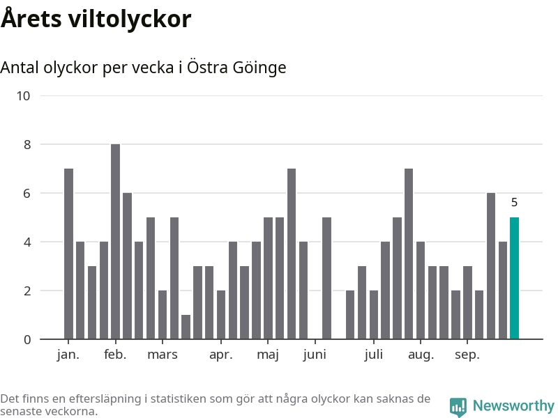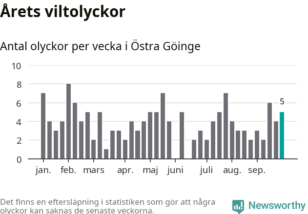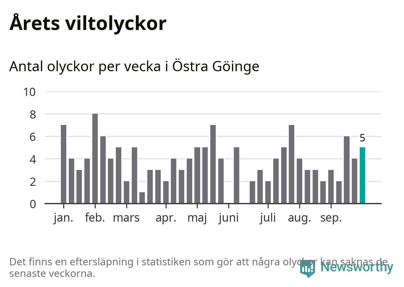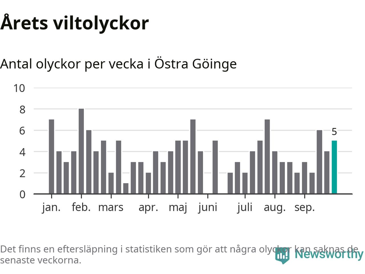 Hittills har fem viltolyckor rapporterats in i Östra Göinge kommun från vecka 40. Se listan här.