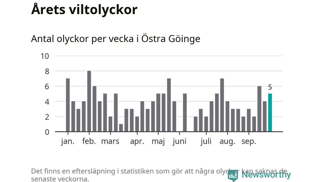 Totalt det här året har det inträffat 154 viltolyckor i kommunen. Det är en normal nivå i förhållande till hur det har sett ut under de senaste tio åren – genomsnittet för motsvarande period är 172.