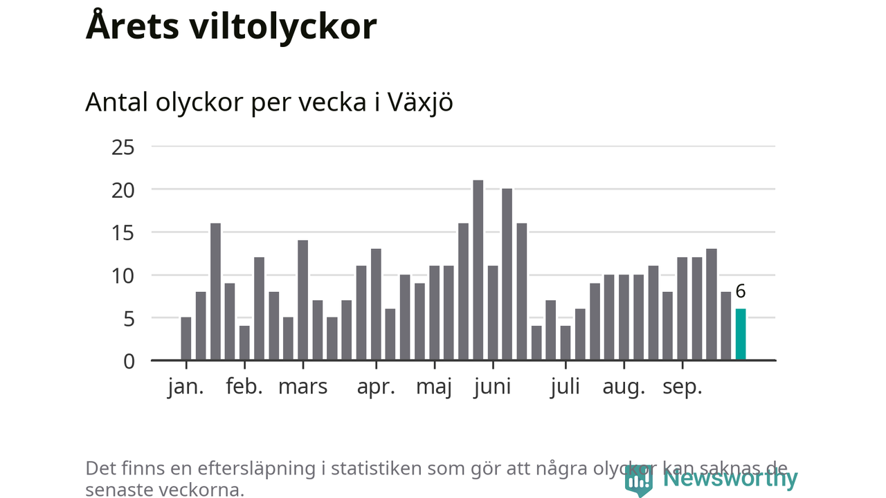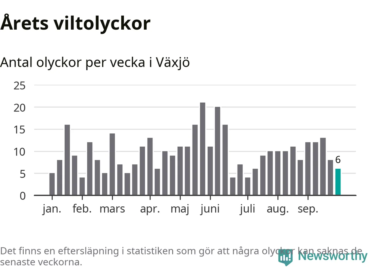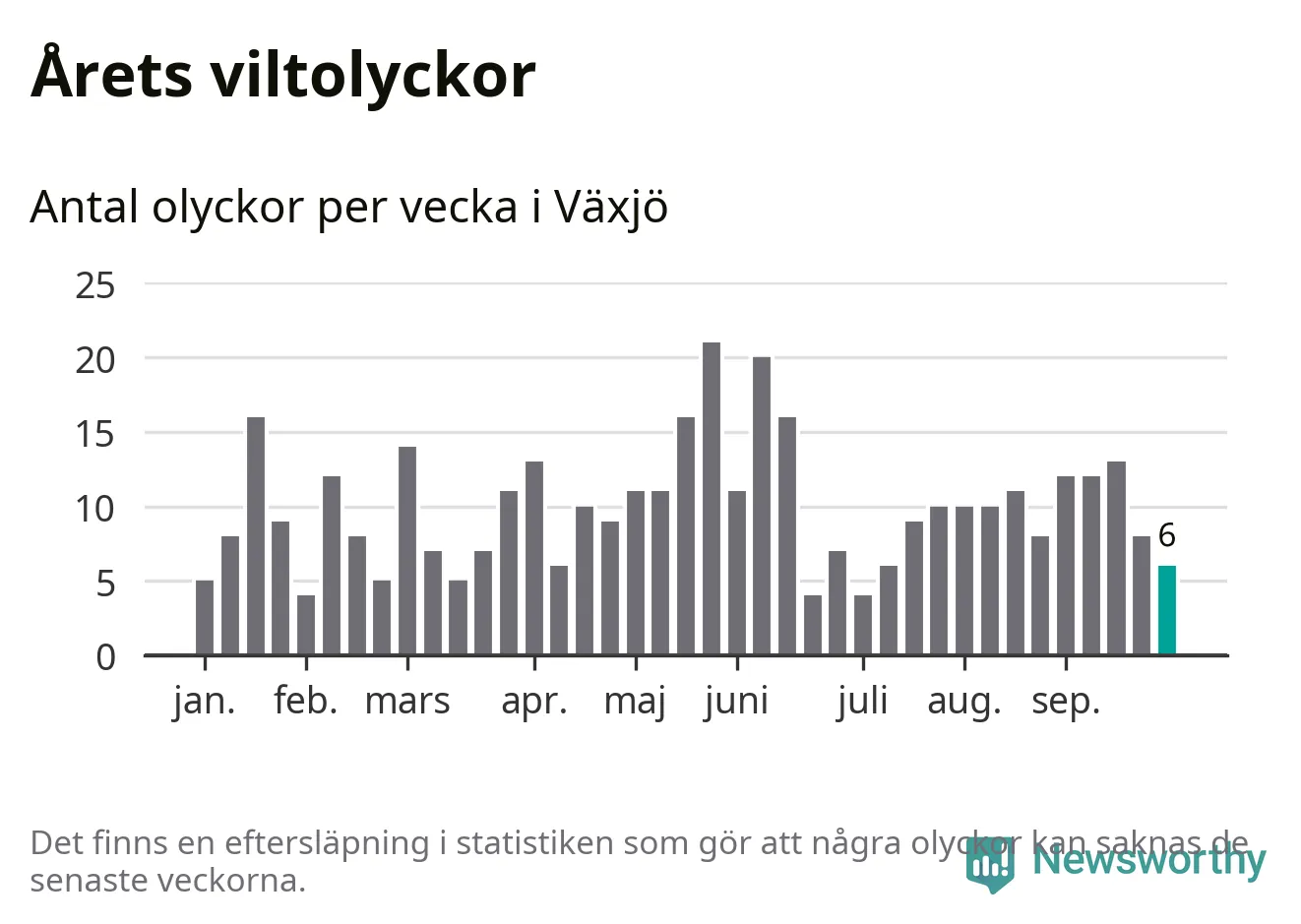 Hittills har sex viltolyckor rapporterats in i Växjö kommun från vecka 40. Se listan här.