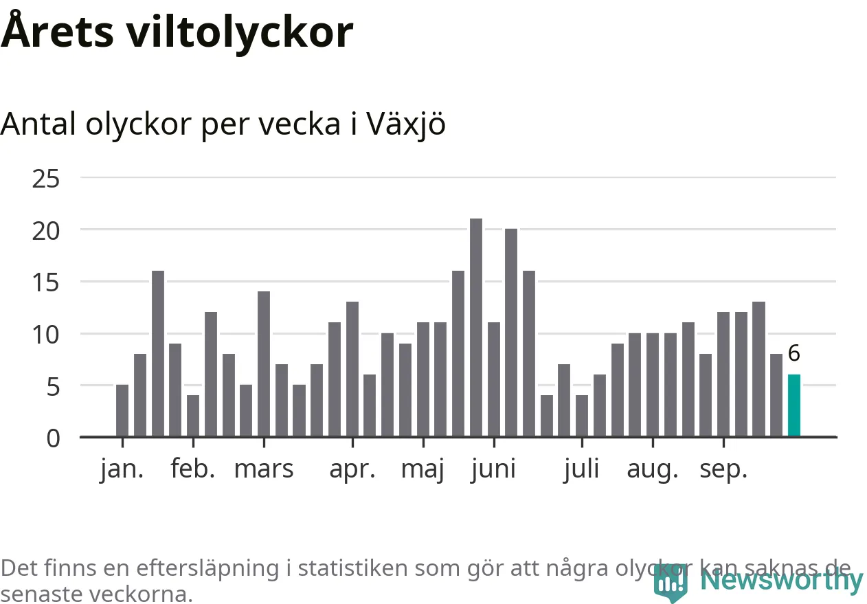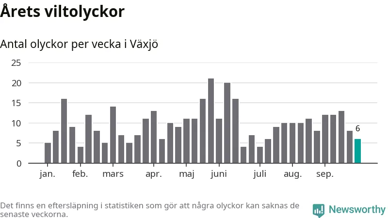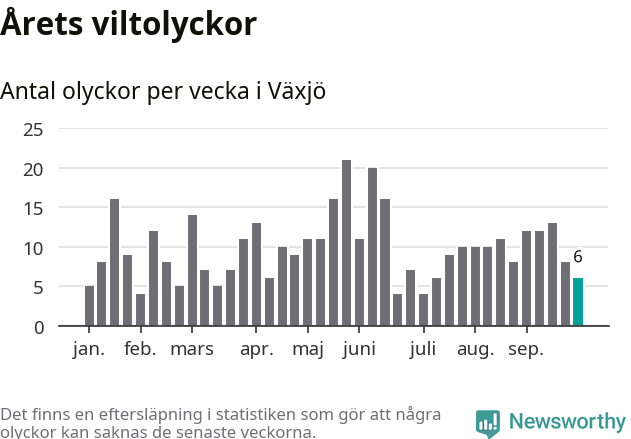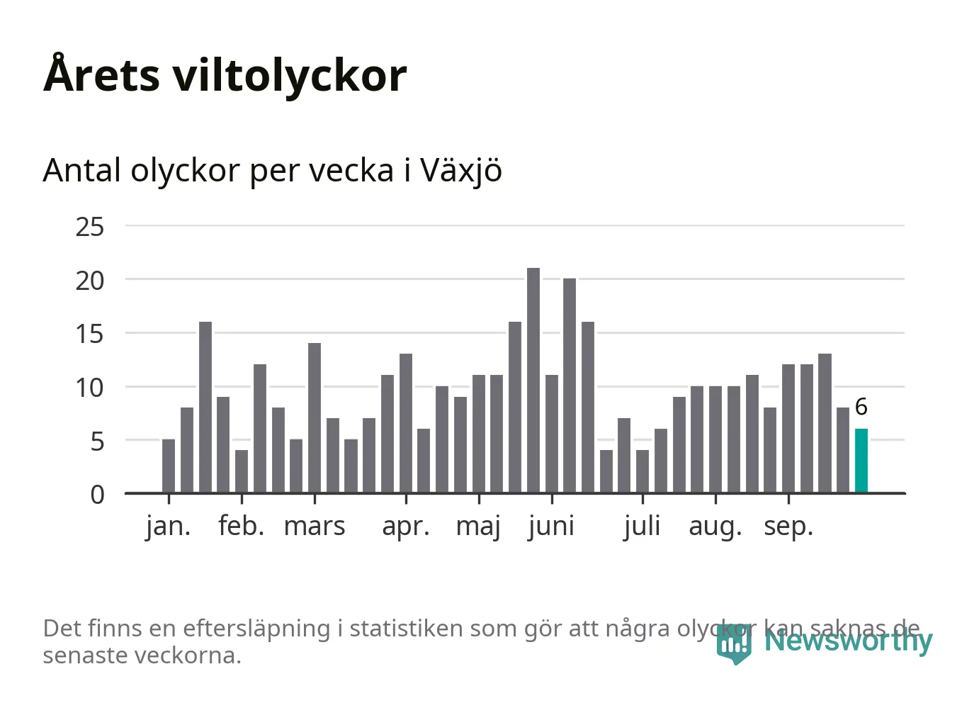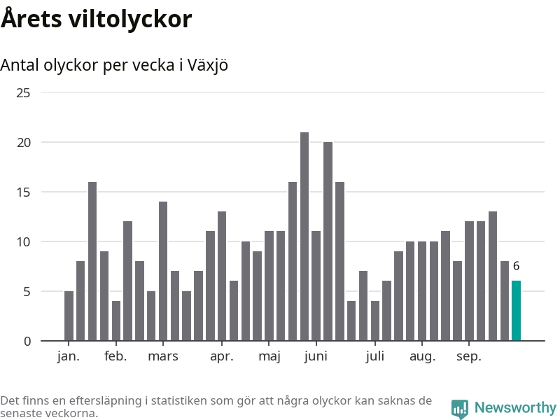 Hittills har sex viltolyckor rapporterats in i Växjö kommun från vecka 40. Se listan här.