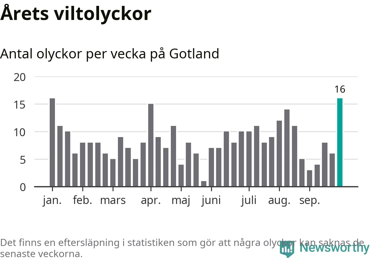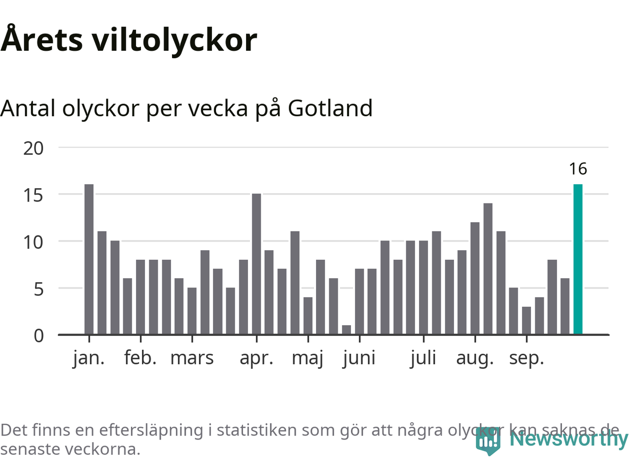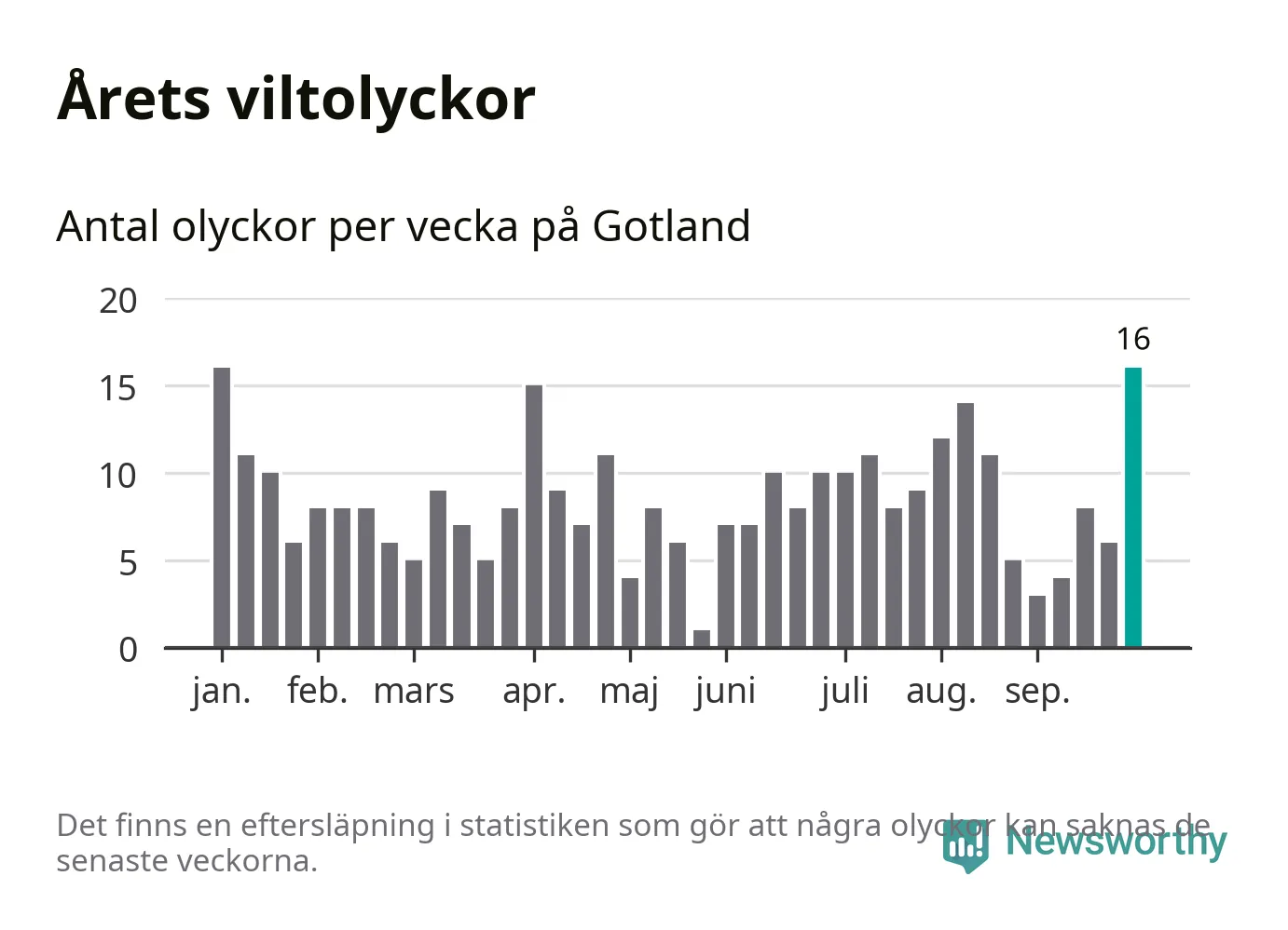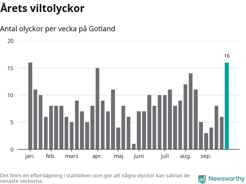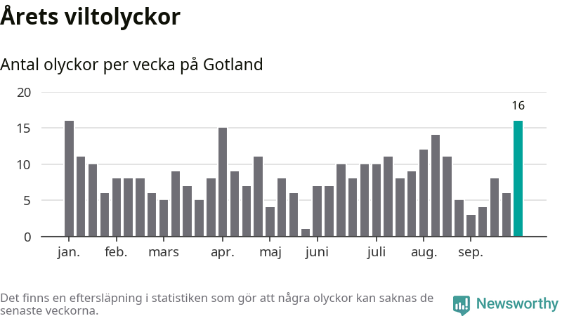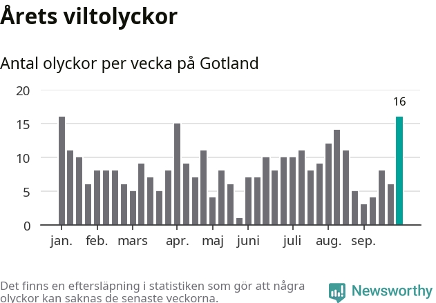 16 olyckor på en enda vecka är däremot ovanligt många. Bara tio gånger tidigare sedan 2015 har det skett