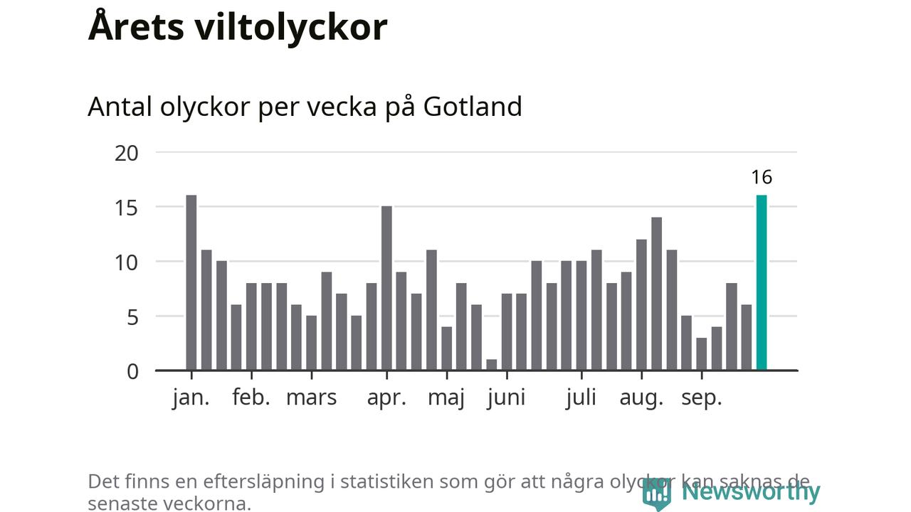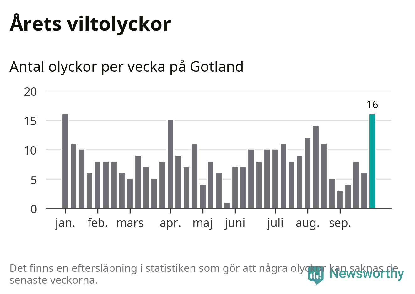 332 viltolyckor i kommunen. Det är en normal nivå i förhållande till hur det har sett ut under de senaste tio åren – genomsnittet för motsvarande period är 319.