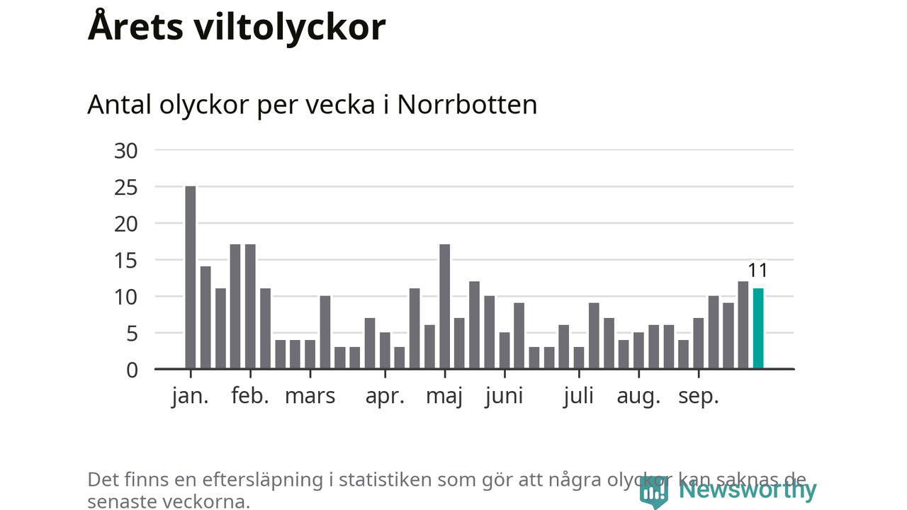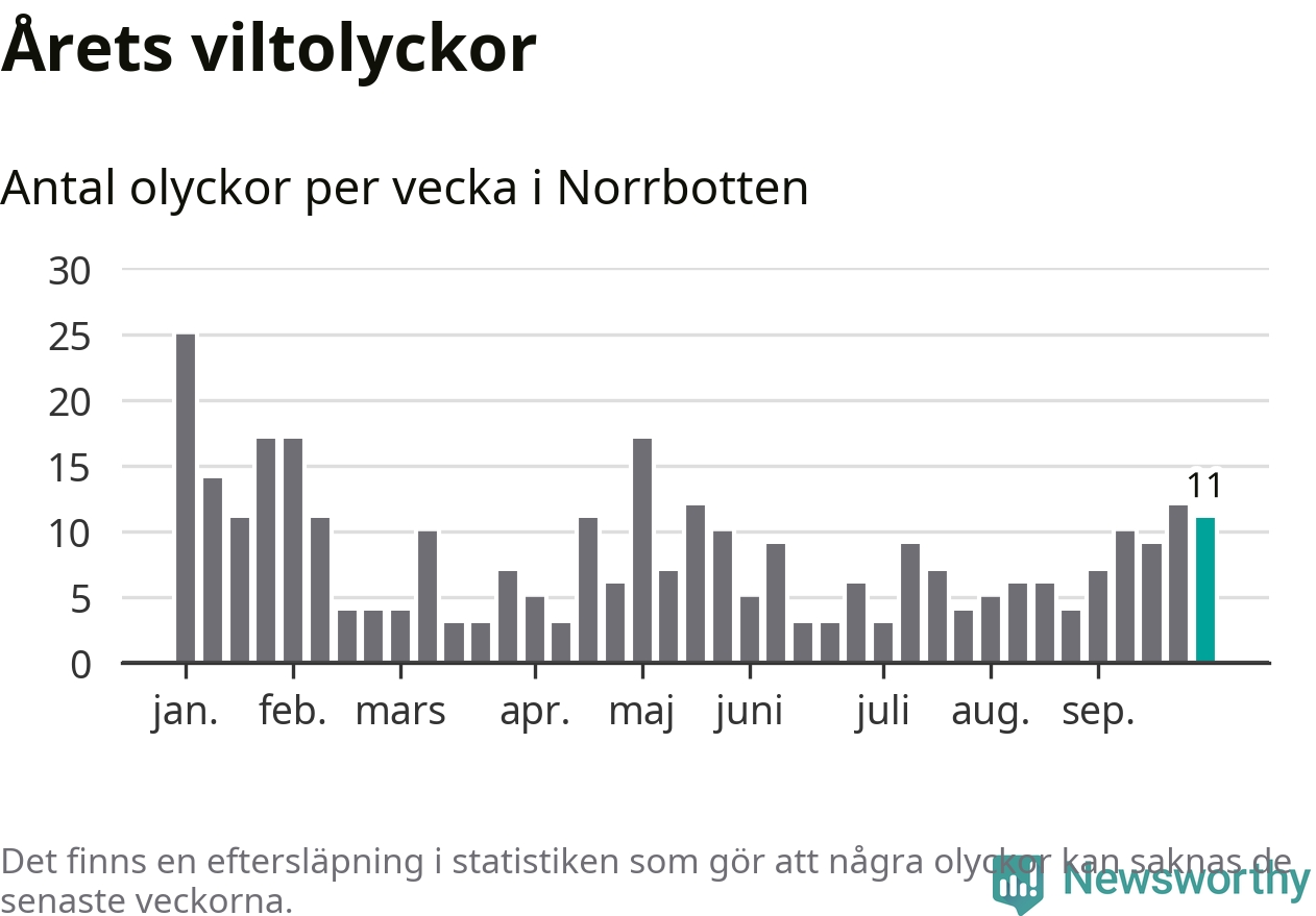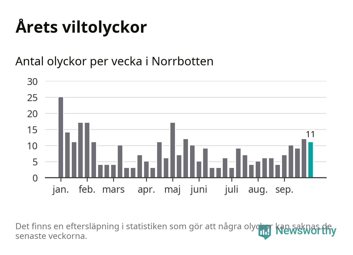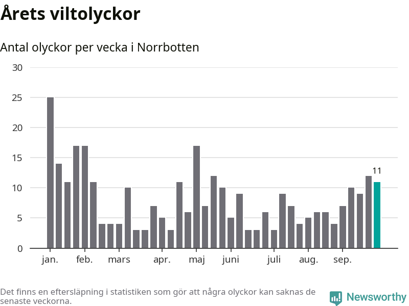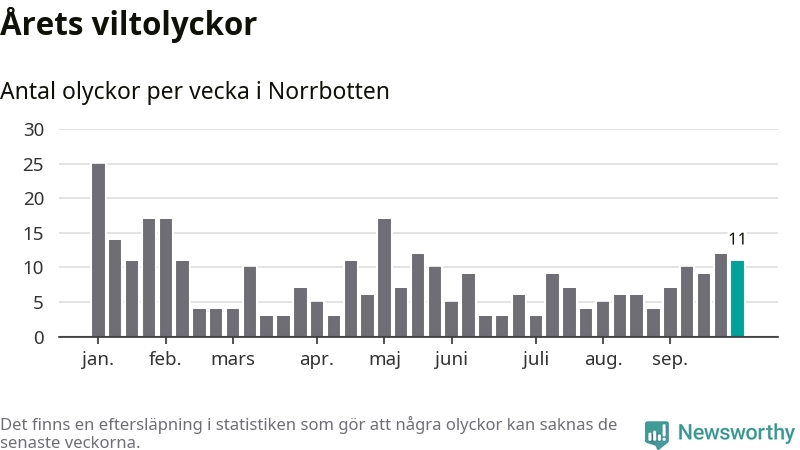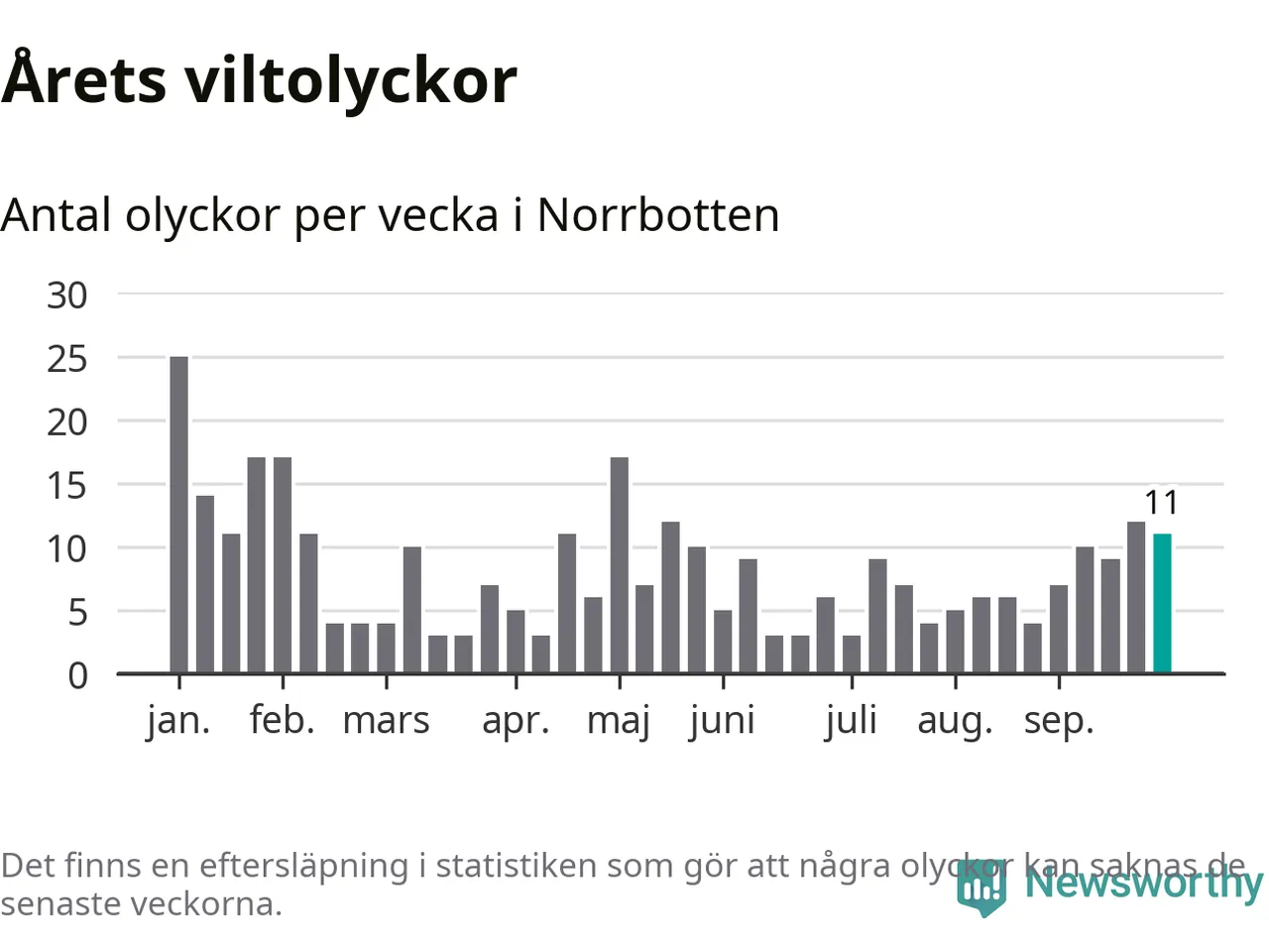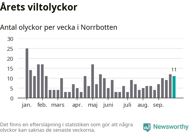 sett till de senaste tio årens statistik. I statistiken ingår inte olyckor med ren, som här räknas som tamdjur.