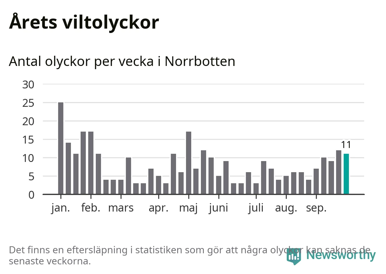 330 viltolyckor i länet. Det är en normal nivå i förhållande till hur det har sett ut under de senaste tio åren – genomsnittet för motsvarande period är 336.